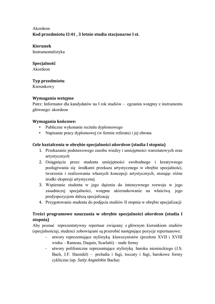Akordeon Kod przedmiotu I2-01 , 3 letnie studia stacjonarne I st. Kierunek Instrumentalistyka Specjalność Akordeon Typ przedmiotu Kierunkowy Wymagania wstępne Patrz: Informator dla kandydatów na I rok studiów – egzamin wstępny z instrumentu głównego: akordeon Wymagania końcowe: ▪ Publiczne wykonanie recitalu dyplomowego ▪ Napisanie pracy dyplomowej (w formie referatu) i jej obrona Cele kształcenia w obrębie specjalności akordeon (studia I stopnia) 1. Przekazanie podstawowego zasobu wiedzy i umiejętności warsztatowych oraz artystycznych 2. Osiągnięcie przez studenta umiejętności swobodnego i kreatywnego posługiwania się środkami przekazu artystycznego w obrębie specjalności, tworzenia i realizowania własnych koncepcji artystycznych, stosując różne środki ekspresji artystycznej 3. Wspieranie studenta w jego dążeniu do intensywnego rozwoju w jego zasadniczej specjalności, wstępne ukierunkowanie na właściwą jego predyspozycjom dalszą specjalizację 4. Przygotowanie studenta do podjęcia studiów II stopnia w obrębie specjalizacji Treści programowe nauczania w obrębie specjalności akordeon (studia I stopnia) Aby poznać reprezentatywny repertuar związany z głównym kierunkiem studiów (specjalnością), studenci zobowiązani są przerobić następujące pozycje repertuarowe: - utwory reprezentujące stylistyką klawesynistów (przełom XVII i XVIII wieku – Rameau, Daquin, Scarlatti) – małe formy - utwory polifoniczne reprezentujące stylistykę baroku niemieckiego (J.S. Bach, J.F. Haendel) – preludia i fugi, toccaty i fugi, barokowe formy cykliczne (np. Suity Angielskie Bacha) utwory reprezentujące oryginalną literaturę cykliczną np. A. Kusjakow – Sonaty lub np. Szkice Zimowe, W. Semjonow – Sonaty lub Rapsodie, F. Angelis – np. Suita Koncertowa, Haiti, Impasse - utwory o charakterze wirtuozowskim np. P. Makkonen – Lot poza czasem, B. Lorentzen - Łzy (dopuszcza się wykonanie transkrypcji np. M. Moszkowski – Iskry, Kaprys Hiszpański, H. Wieniawski – Scherzo Tarantella) - utwory reprezentujące oryginalną literaturę współczesną np. Sofia Gubaidulina – De Profundis, Et Expecto; L. Berio – Sequenza XIII, A. Nordheim - Flashing - zachęca się studentów do współpracy z kompozytorami w celu tworzenia nowego repertuaru akordeonowego Dopuszcza się możliwość elastyczności w realizowaniu programu (np. przygotowania do konkursów akordeonowych), jednakże sugeruje się zrealizowanie konkretnego programu w następujących latach: - Rok I – Sonata D. Scarlattiego - Rok II – Preludium i Fugę J.S. Bacha - Rok III – Utwór cykliczny i utwór współczesny Zabrania się powtarzania jakiegokolwiek utworu granego wcześniej podczas w zimowej lub letniej sesji egzaminacyjnej. Dopuszcza się natomiast takie powtórzenie jednego bądź maksymalnie dwóch utworów podczas dyplomowego recitalu. Pozycję podane w programie studiów (tożsame z repertuarem wymaganym na egzaminach semestralnych) stanowią niezbędne minimum programowe dla każdego studenta. Realizowany program jest również determinowany wymaganiami egzaminu dyplomowego (zwłaszcza po zakończeniu 2-letnich uzupełniających studiów II st.). Studenci 3-letnich niestacjonarnych studiów I st. realizują identyczny program. - Zamierzone efekty kształcenia (uczenia się) Po ukończeniu I cyklu studiów studenci specjalności akordeon powinni: W zakresie wiedzy: - dysponować wiedzą dotyczącą repertuaru związanego z własną specjalnością (K_W02) - docierać do niezbędnych informacji (książki, nagrania, materiały nutowe, internet), potrafić je analizować i interpretować we właściwy sposób (K_W04) - wykorzystywać wiedzę dotyczącą aspektów harmonicznych, metrorytmicznych, aplikaturowych przerabianych utworów (K_W13) - świadomie wykorzystywać wzajemne relacje pomiędzy teoretycznymi i praktycznymi elementami studiów oraz zdolność do integrowania nabytej wiedzy (K_W07) W zakresie umiejętności: - - - - tworzyć, realizować i wyrażać własne koncepcje artystyczne oraz samodzielnie interpretować utworu muzyczne w oparciu o własne twórcze motywacje (K_U01) czytać teksty nutowe na poziomie umożliwiającym ich szybkie opanowanie (również pamięciowe), zrozumienie ich kontekstu historycznego, formy i innych zawartych w nich treści (K_U09) opanować warsztat techniczny potrzebny do profesjonalnej prezentacji muzycznej (K_U10) ćwiczyć we właściwy sposób unikając zagrożeń z często codziennego parogodzinnego pobytu przy instrumencie (K_U11) przez częste występy publiczne radzić sobie z róznymi stesowymi sytuacjami, jak również reagować na rozmaite warunki akustyczne sal, w których występują (K_U17) improwizować na podstawowym poziomie (K_U16) wypowiadać się ustnie i pisemnie na temat interpretowania, tworzenia i odtwarzania muzyki oraz na temat kwestii dotyczących szeroko pojmowanych tematów ogólnohumanistycznych (dotyczy zwłaszcza pracy dyplomowej i jej obrony) (K_U15) W zakresie kompetencji społecznych: - w sposób świadomy korzystać (poprzez umiejętność samooceny) ze swej emocjonalności, wyobraźni i intuicji. Dotyczy to również umiejętności konstruktywnej oceny wykonań innych wykonawców. (K_K12) - posługiwać się fachową terminologią z zakresu dziedziny muzyki (dotyczy pracy dyplomowejj i jej obrony) (K_K06) Metody nauczania: Wykład, zajęcia indywidualne Nakład pracy studenta potrzebny do osiągnięcia efektów uczenia się Rok I II III Semestr 1 2 3 4 5 6 Punkty ECTS 10 10 14 14 14 14 2 2 2 2 2 Ekm Ekm Ekm Ekm Zal Ilość godzin tygodniu w 2 Rodzaj zaliczenia Ekm Legenda Zal – zaliczenie; zst – zaliczenie ze stopniem; egz – egzamin; ekm – egzamin komisyjny Kryteria oceny: ▪ ▪ warsztat wykonawczy – umiejętności techniczne opanowanie i zrozumienie tekstu muzycznego, logika narracji muzycznej ▪ frazowanie ▪ umiejętność wypowiedzi w różnych stylach i formach muzy