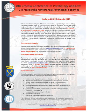 [Wpisz cytat z dokumentu albo podsumowanie interesującej kwestii. Pole tekstowe można umieścić w dowolnym miejscu w dokumencie. Użyj karty Narzędzia pól teksu.] Kraków, 28-29 listopada 2015 Katedra Psychiatrii Collegium Medicum Uniwersytetu Jagiellońskiego wraz z Sekcją Psychologii Sądowej KNSP UJ oraz Instytutem Ekspertyz Sądowych w Krakowie mają przyjemność zaprosić do udziału w ósmej edycji Krakowskiej Konferencji Psychologii Sądowej (8th Cracow Conference of Psychology and Law), która odbędzie się w Krakowie, w dniach 28-29 listopada 2015 roku, w Centrum Dydaktyczno-Kongresowym Wydziału Lekarskiego Uniwersytetu Jagiellońskiego. Wydarzenie objął również swoim patronatem honorowym Dyrektor Okręgowy Służby Więziennej w Krakowie. Konferencja ma charakter cykliczny i międzynarodowy, a do udziału w niej zapraszani są wybitni eksperci, zajmujący się zagadnieniami na styku psychologii, psychiatrii i prawa. Językami konferencji są polski i angielski, a organizatorzy zapewniają tłumaczenie symultaniczne w trakcie całej konferencji. REJESTRACJA UCZESTNIKÓW Formularz rejestracyjny oraz wszelkie dodatkowe informacje na temat konferencji (w tym wysokość opłat) dostępne są na stronie: www.psychologiasadowa.pl. Do 5 października obowiązuje obniżona opłata rejestracyjna. Rejestracja uczestników zostanie zamknięta w dniu 11 listopada 2015 lub w przypadku wyczerpania liczby miejsc. ZASADY NADSYŁANIA ABSTRAKTÓW Zapraszamy osoby pragnące wystąpić z referatem lub zaprezentować plakat podczas konferencji do nadsyłania abstraktów (do 1500 znaków). Czas wystąpienia wynosi 25 minut (razem z dyskusją). Abstrakty w języku polskim oraz angielskim należy wysyłać na adres: [email protected]. Nieprzekraczalnym terminem nadsyłania zgłoszeń jest dzień 13 września 2015 roku. O przyjęciu abstraktu na konferencję (wraz z informacją o zakwalifikowaniu go jako wystąpienie lub plakat) uczestnicy zostaną powiadomieni do końca września 2015 roku. PANELE TEMATYCZNE Tematyka wystąpień będzie koncentrować się wokół poniższych zagadnień (szczegółowe opisy sesji tematycznych znajdują się na stronie konferencji): Praktyczne aspekty opiniowania na potrzeby wymiaru sprawiedliwości Opiniowanie psychologiczne i psychiatryczne w postępowaniu cywilnym Pamięć, uwaga i zeznania świadków w perspektywie nauk sądowych Nowelizacja prawa oraz jej konsekwencje dla roli biegłego Zastosowanie wiedzy psychologicznej i psychiatrycznej w kryminologii oraz kryminalistyce Postępowanie z osobami uzależnionymi w perspektywie psychiatrycznej, psychologicznej i prawniczej Praca z osobami pozbawionymi wolności Przestępstwa seksualne Alternatywne sposoby rozwiązywania sporów Przewidziane są również sesje skierowane w szczególności do studentów, gdzie będą oni mogli prezentować wyniki własnych badań lub też referaty będące przeglądem literatury. Po szczegółowe informacje zapraszamy na stronę internetową konferencji: www.psychologiasadowa.pl