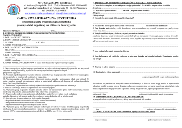 OTO SZCZĘŚLIWI GENIUSZE ul. Królowej Marysieńki 31/9 02-954 Warszawa NIP 5211166355 adres do korespondencji ul. Nałęczowska 34 02-922 Warszawa tel. 502379831; 510487971. www.otoszczesliwigeniusze.pl; [email protected] KARTA KWALIFIKACYJNA UCZESTNIKA Wypełnioną kartę kwalifikacyjną uczestnika prosimy oddać najpóźniej na zbiórce w dniu wyjazdu MIEJSCE IMPREZY:………………………………………. DATA:…………………………………..… I. WNIOSEK RODZICÓW/OPIEKUNÓW O SKIEROWANIE DZIECKA NA KOLONIĘ/OBÓZ 1. IMIĘ I NAZWISKO DZIECKA ..................................................................................................... 2. DATA I MIEJSCE URODZENIA .................................................................................................. 3. Nr PESEL .............................................. 4. KLASA ................................................. 5. ADRES ZAMIESZKANIA............................................................................................................ 6. IMIĘ I NAZWISKO MATKI/OPIEKUNA .................................................................................... TELEFON :………………………………………………………………….. ADRES e-mailowy……………………………………………………………………………………… 7. IMIĘ I NAZWISKO OJCA/OPIEKUNA........................................................................................ TELEFON :………………………………………………………………….. ADRES e-mailowy:………………………………………………………………………….…………. 8. ADRES RODZICÓW/OPIEKUNÓW w czasie pobytu dziecka w placówce wypoczynku ....................................................................................................................................................... 9. Wyrażam zgodę na wyjazd mojego syna/córki na wyżej wymienioną imprezę i jego udział we wszystkich zajęciach rekreacji ruchowej, wycieczkach turystycznych i innych przewidzianych programem zajęciach. 10. Wyrażam zgodę na przechowywanie telefonu komórkowego mojego dziecka u wychowawcy i udostępnianie mu go tylko w określonych godzinach w ciągu dnia. 11. Wyrażam zgodę na fotografowanie i filmowanie mojego dziecka i umieszczanie zdjęć oraz krótkich filmów z zajęć na stronach internetowych, a także w materiałach reklamowych dotyczących realizacji projektów firmy Oto Szczęśliwi Geniusze. 12. Stwierdzam, że podałam/em w niniejszej karcie kolonijnej wszystkie znane mi informacje o dziecku, które mogą pomóc w zapewnieniu mu właściwej opieki. 13. Wyrażam zgodę na podanie mojemu dziecku leków czy zastosowanie przez wykwalifikowany personel medyczny innej opieki, jeżeli zaistniałaby taka zdrowotna konieczność. 14. W przypadku podejrzenia spożywania alkoholu lub narkotyków wyrażam zgodę na badanie dziecka alkomatem lub testami narkotykowymi przez kadrę kolonijną lub w jej obecności. 15. Oświadczam, że zapoznałam/em się i w pełni akceptuję: – Regulamin kolonii/obozu zamieszczony na stronie internetowej, – Program kolonii/obozu oraz warunki uczestnictwa, – Ogólne Warunki Ubezpieczenia Signal Iduna Travel. 16. Wyrażam zgodę na przetwarzanie danych osobowych zawartych w karcie kwalifikacyjnej na potrzeby niezbędne do zapewnienia bezpieczeństwa i ochrony zdrowia uczestnika wypoczynku (zgodnie z ustawą z 29 sierpnia 1997 r. o ochronie danych osobowych (Dz.U. z 2015 r. poz. 2135, z późn. zm.)). ................................... miejscowość i data .............................................. ............................................. podpis matki/opiekuna i/lub podpis ojca/opiekuna II. INFORMACJA RODZICÓW /OPIEKUNÓW O DZIECKU I JEGO ZDROWIU 1. Czy dziecko cierpi na przewlekłą/nawracającą chorobę? TAK/NIE ( niepotrzebne skreślić) Symptomy……………………………………………………………………………………………………….. 2. Czy dziecko jest uczulone? TAK/NIE ( niepotrzebne skreślić) Alergeny………………………………………………………………………………………………………….. Objawy alergii……………………………………………………………………………………………………. 3. Czy dziecko przyjmuje leki (podać lek i dawkę)? ……………………………………………………………………………………………………………………. …………………………………………………………………………………………………………………… 4. Jak dziecko znosi: jazdę autokarem: dobrze/źle lot samolotem: dobrze/źle 5. Czy dziecko nosi: okulary, szkła kontaktowe, aparat ortodontyczny, wkładki ortopedyczne, podwyższony obcas buta, inne………………………………………………………………………………………………. 6. Dolegliwości lub objawy, które występują ostatnio u dziecka: omdlenia, drgawki z utratą przytomności, częste bóle głowy, zaburzenia równowagi, częste wymioty, krwotoki z nosa, ataki duszności, bezsenność, przewlekły kaszel, szybkie męczenie się, częste bóle brzucha, bóle stawów, lęki nocne, moczenie nocne, inne …………………………………………………………………………………………………………………… …………………………………………………………………………………………………………………… ………………………………………………………………………………………………………………….. 7. Inne ważne informacje o zdrowiu dziecka: ………………………………………………………………………………………………………………… 8. Inne informacje od rodziców związane z pob