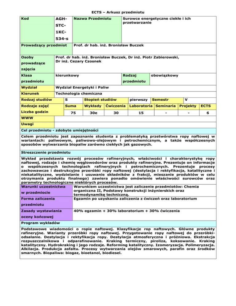 ECTS – Arkusz przedmiotu Kod AGH- Nazwa Przedmiotu Surowce energetyczne ciekłe i ich przetwarzanie STC1KC534-s Prowadzący przedmiot Osoby prowadzące Prof. dr hab. inż. Bronisław Buczek Prof. dr hab. inż. Bronisław Buczek, Dr inż. Piotr Zabierowski, Dr inż. Cezary Czosnek zajęcia Klasa kierunkowy Rodzaj przedmiotu obowiązkowy przedmiotu Wydział Wydział Energetyki i Paliw Kierunek Technologia chemiczna Rodzaj studiów S Stopień studiów pierwszy Rodzaje zajęć Suma Wykłady Ćwiczenia Laboratoria Seminaria Liczba godzin 75 30e 30 15 Semestr V Projekty - - ECTS 6 WWW Uwagi Cel przedmiotu - zdobyte umiejętności Celem przedmiotu jest zapoznanie studenta z problematyką przetwórstwa ropy naftowej w wariantach: paliwowym, paliwowo-olejowym i petrochemicznym, a także współczesnych sposobów wytwarzania biopaliw zarówno ciekłych jak gazowych. Streszczenie przedmiotu Wykład przedstawia rozwój procesów rafineryjnych, właściwości i charakterystykę ropy naftowej, rodzaje i chemię węglowodorów oraz produkty rafineryjne. Prezentuje on informacje o współczesnych technologiach rafineryjnych i petrochemicznych. Prezentuje procesy zachowawcze i destrukcyjne przeróbki ropy naftowej (destylacja i rektyfikacja, katalityczne i niekatalityczne, wydzielanie i usuwanie składników z frakcji, mieszanie produktów w celu otrzymania produktu finalnego) zawiera ponadto omówienie właściwości surowców oraz parametry technologiczne niektórych procesów. Warunki uczestnictwa Warunkiem uczestnictwa jest zaliczenie przedmiotów: Chemia organiczna II, Podstawy konstrukcji inżynierskich oraz w przedmiocie termodynamikę techniczną. Forma zaliczenia Egzamin po uzyskaniu zaliczenia z ćwiczeń oraz laboratorium przedmiotu Zasady wystawiania 40% egzamin + 30% laboratorium + 30% ćwiczenia oceny końcowej Program wykładów Podstawowe wiadomości o ropie naftowej. Klasyfikacje rop naftowych. Główne produkty rafineryjne. Warianty przeróbki ropy naftowej. Przygotowanie ropy naftowej do przeróbkiodsalanie. Destylacja i rektyfikacja ropy. Destylacja atmosferyczna i próżniowa. Ekstrakcja rozpuszczalnikowa i odparafinowanie. Kraking termiczny, piroliza, koksowanie. Kraking katalityczny. Hydrokraking i jego rodzaje. Reforming katalityczny. Izomeryzacja. Polimeryzacja. Alkilacja. Produkcja asfaltu. Procesy wytwarzania olejów smarowych, parafin oraz środków smarnych. Biopaliwa: biogaz, bioetanol, biodiesel. Program ćwiczeń laboratoryjnych Właściwości rop naftowych i ich frakcji, termodynamika, przebieg, sterowanie i bilansowanie procesów przeróbki ropy oraz konstrukcja reaktorów. Oznaczanie podstawowych parametrów jakościowych ropy naftowej i produktów naftowych. Bilans materiałowy procesu krakingu termicznego ciężkich frakcji. Bibliografia 1. 2. 3. 4. 5. E. Grzywa, J. Molenda: Technologia podstawowych syntez organicznych, WNT Warszawa 1996. Handbook of petroleum petrochemicals production processes”, (ed. R. A. Myers) McGRAWHILL, New York 2005. A. Podniało, Paliwa oleje i smary w ekologicznej eksploatacji, WNT Warszawa 2002. Ropa naftowa-właściwości-przetwarzanie-produkty, praca zbiorowa pod redakcją J. Surygały, WNT Warszawa 2006. J. Magiera, Rafinacja olejów przepracowanych, WNT Warszawa 2006. * Rodzaje zajęć: ćwiczenia – ćwiczenia audytoryjne, lektoraty, zajęcia wf, laboratoria – ćwiczenia laboratoryjne, zajęcia praktyczne, zajęcia terenowe, seminaria – seminaria, konwersatoria, projekty – ćwiczenia projektowe, prace kontrolne i przejściowe
