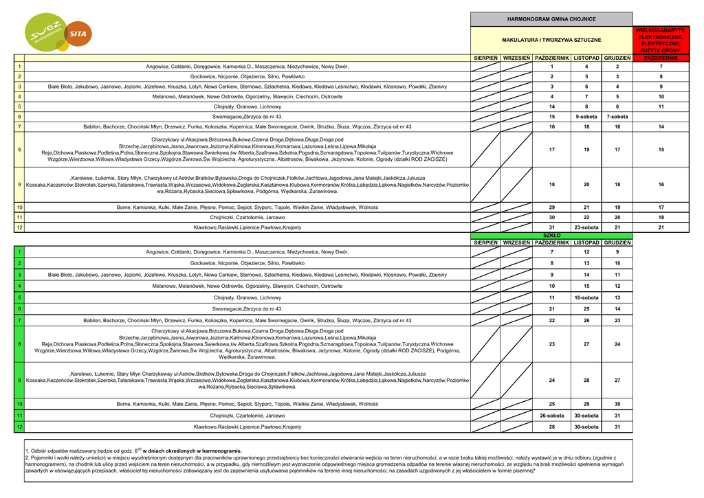 HARMONOGRAM GMINA CHOJNICE MAKULATURA I TWORZYWA SZTUCZNE SIERPIEŃ WRZESIEŃ PAŹDZIERNIK LISTOPAD GRUDZIEŃ WIELKOGABARYTY, ELEKTRONICZNE, ELEKTRYCZNE, ZUŻYTE OPONY. PAŹDZIERNIK 1 Angowice, Cołdanki, Doręgowice, Kamionka D., Moszczenica, Nieżychowice, Nowy Dwór, 1 4 2 7 2 Gockowice, Nicponie, Objezierze, Silno, Pawłówko 2 5 3 8 3 Białe Błoto, Jakubowo, Jasnowo, Jeziorki, Józefowo, Kruszka, Lotyń, Nowa Cerkiew, Sternowo, Szlachetna, Kłodawa, Kłodawa Leśnictwo, Kłodawki, Klosnowo, Powałki, Zbeniny 3 6 4 9 4 Melanowo, Melanówek, Nowe Ostrowite, Ogorzeliny, Sławęcin, Ciechocin, Ostrowite 4 7 5 10 5 Chojnaty, Granowo, Lichnowy 14 8 6 11 6 Swornegacie,Zbrzyca do nr 43. 15 9-sobota 7-sobota 7 Babilon, Bachorze, Chociński Młyn, Drzewicz, Funka, Kokoszka, Kopernica, Małe Swornegacie, Owink, Strużka, Śluza, Wączos, Zbrzyca od nr 43 16 18 16 14 8 Charzykowy ul:Akacjowa,Brzozowa,Bukowa,Czarna Droga,Dębowa,Długa,Droga pod Strzechę,Jarzębinowa,Jasna,Jaworowa,Jeziorna,Kalinowa,Klnonowa,Komarowa,Lazurowa,Leśna,Lipowa,Mikołaja Reja,Olchowa,Piaskowa,Podleśna,Polna,Słoneczna,Spokojna,Stawowa,Świerkowa,św Alberta,Szafirowa,Szkolna,Pogodna,Szmaragdowa,Topolowa,Tulipanów,Turystyczna,Wichrowe Wzgórze,Wierzbowa,Willowa,Władysława Grzecy,Wzgórze,Żwirowa,Św Wojciecha, Agroturystyczna, Albatrosów, Biwakowa, Jeżynowa, Kolonie, Ogrody (działki ROD ZACISZE) 17 19 17 15 18 20 18 16 ,Karolewo, Łukomie, Stary Młyn, Charzykowy ul:Astrów,Bratków,Bytowska,Droga do Chojniczek,Fiołków,Jachtowa,Jagodowa,Jana Matejki,Jaskółcza,Juliusza 9 Kossaka,Kaczeńców,Stokrotek,Szeroka,Tatarakowa,Trawiasta,Wąska,Wczasowa,Widokowa,Żeglarska,Kasztanowa,Klubowa,Kormoranów,Krótka,Łabędzia,Łąkowa,Nagietków,Narcyzów,Poziomko wa,Różana,Rybacka,Sieciowa,Spławikowa, Podgórna, Wędkarska, Żurawinowa. 10 Borne, Kamionka, Kulki, Małe Zanie, Płęsno, Pomoc, Sepiot, Styporc, Topole, Wielkie Zanie, Władysławek, Wolność 29 21 19 17 11 Chojniczki, Czartołomie, Jarcewo 30 22 20 18 12 Klawkowo,Racławki,Lipienice,Pawłowo,Krojanty 31 23-sobota 21 21 SIERPIEŃ SZKŁO WRZESIEŃ PAŹDZIERNIK LISTOPAD GRUDZIEŃ Angowice, Cołdanki, Doręgowice, Kamionka D., Moszczenica, Nieżychowice, Nowy Dwór, 7 12 9 2 Gockowice, Nicponie, Objezierze, Silno, Pawłówko 8 13 10 3 Białe Błoto, Jakubowo, Jasnowo, Jeziorki, Józefowo, Kruszka, Lotyń, Nowa Cerkiew, Sternowo, Szlachetna, Kłodawa, Kłodawa Leśnictwo, Kłodawki, Klosnowo, Powałki, Zbeniny 9 14 11 4 Melanowo, Melanówek, Nowe Ostrowite, Ogorzeliny, Sławęcin, Ciechocin, Ostrowite 10 15 12 5 Chojnaty, Granowo, Lichnowy 11 16-sobota 13 6 Swornegacie,Zbrzyca do nr 43. 21 25 14 7 Babilon, Bachorze, Chociński Młyn, Drzewicz, Funka, Kokoszka, Kopernica, Małe Swornegacie, Owink, Strużka, Śluza, Wączos, Zbrzyca od nr 43 22 26 23 8 Charzykowy ul:Akacjowa,Brzozowa,Bukowa,Czarna Droga,Dębowa,Długa,Droga pod Strzechę,Jarzębinowa,Jasna,Jaworowa,Jeziorna,Kalinowa,Klnonowa,Komarowa,Lazurowa,Leśna,Lipowa,Mikołaja Reja,Olchowa,Piaskowa,Podleśna,Polna,Słoneczna,Spokojna,Stawowa,Świerkowa,św Alberta,Szafirowa,Szkolna,Pogodna,Szmaragdowa,Topolowa,Tulipanów,Turystyczna,Wichrowe Wzgórze,Wierzbowa,Willowa,Władysława Grzecy,Wzgórze,Żwirowa,Św Wojciecha, Agroturystyczna, Albatrosów, Biwakowa, Jeżynowa, Kolonie, Ogrody (działki ROD ZACISZE), Podgórna, Wędkarska, Żurawinowa. 23 27 24 24 28 27 1 ,Karolewo, Łukomie, Stary Młyn Charzykoway ul:Astrów,Bratków,Bytowska,Droga do Chojniczek,Fiołków,Jachtowa,Jagodowa,Jana Matejki,Jaskółcza,Juliusza 9 Kossaka,Kaczeńców,Stokrotek,Szeroka,Tatarakowa,Trawiasta,Wąska,Wczasowa,Widokowa,Żeglarska,Kasztanowa,Klubowa,Kormoranów,Krótka,Łabędzia,Łąkowa,Nagietków,Narcyzów,Poziomko wa,Różana,Rybacka,Sieciowa,Spławikowa. 10 Borne, Kamionka, Kulki, Małe Zanie, Płęsno, Pomoc, Sepiot, Styporc, Topole, Wielkie Zanie, Władysławek, Wolność 25 29 30 11 Chojniczki, Czartołomie, Jarcewo 26-sobota 30-sobota 31 12 Klawkowo,Racławki,Lipienice,Pawłowo,Krojanty 28 30-sobota 31 1. Odbiór odpadów realizowany będzie od godz. 600 w dniach określonych w harmonogramie. 2. Pojemniki i worki należy umieścić w miejscu wyodrębnionym dostępnym dla pracowników uprawnionego przedsiębiorcy bez konieczności otwierania wejścia na teren nieruchomości, a w razie braku takiej możliwości, należy wystawić je w dniu odbioru (zgodnie z harmonogramem), na chodnik lub ulicę przed wejściem na teren nieruchomości, a w przypadku, gdy niemożliwym jest wyznaczenie odpowiedniego miejsca gromadzenia odpadów na terenie własnej nieruchomości, ze względu na brak możliwości spełnienia wymagań zawartych w obowiązujących przepisach, właściciel tej nieruchomości zobowiązany jest do zapewnienia usytuowania pojemników na terenie innej nieruchomości, na zasadach uzgodnionych z jej właścicielem w formie pisemnej*