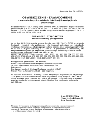 Stąporków, dnia 04.10.2010 r. OBWIESZCZENIE - ZAWIADOMIENIE o wydaniu decyzji o ustaleniu lokalizacji inwestycji celu publicznego Na podstawie art. 53 ust. 1 ustawy z dnia 27 marca 2003r. o planowaniu i zagospodarowaniu przestrzennym (Dz. U. z 2003r. Nr 80, poz. 717 z późn. zm. ) oraz art. 10 § 1, art. 49 ustawy z dnia 14 czerwca 1960r. Kodeks postępowania administracyjnego (t.j. Dz. U. z 2000r. Nr 98, poz. 1071 z późn. zm. ) BURMISTRZ STĄPORKOWA zawiadamia strony postępowania że w dniu 04.10.2010r. została wydana decyzja, znak: BIN. 7331P – G/7/09 o ustaleniu lokalizacji inwestycji celu publicznego dla inwestycji polegającej na rozbudowie wodociągu komunalnego obejmującego budowę odcinka sieci wodociągowej PE-100, Ø 90 mm o długości całkowitej L + 1100 m z przyłączami i uzbrojeniem, dla miejscowości Grzybów, gm. Stąporków, przewidzianego do realizacji na terenie działek : Grunty miasta Stąporków - działki o nr ewid.: 40, 46 Grunty wsi Czarna - działki o nr ewid. : 300 , 299/2, 861, 862, 863, 864, 866, 868, 870, 872, 874/1, 874/2, 874/3, 875, 865, 867, 869, 871, 873, 876, 880, 882, 884, 886, 888, 890, 892, 894/2, 894/1, 895/4, 895/1, 895/5, 895/6, 895/7, 891, 893 Postępowanie prowadzone na wniosek: Gmina Stąporków reprezentowana przez Burmistrz Stąporkowa 26 – 220 Stąporków ul. Marszałka Józefa Piłsudskiego 132a Pełnomocnik : Pan Janusz Kowalczyk Obsługa i Realizacja Inwestycji „CELIS” Niekłań Wielki ul. Partyzantów 75; 26 – 220 Stąporków W Wydziale Budownictwa i Inwestycji j Urzędu Miejskiego w Stąporkowie, ul. Piłsudskiego 132a (pokój nr 30), od poniedziałku do piątku w godzinach pracy Urzędu tj. od 730 do 1530 strony w sprawie mogą zapoznać się z treścią ww. decyzji , której doręczenie ze skutkiem prawnym uważa się za dokonane po upływie 14 dni od dnia publicznego ogłoszenia (art. 49 k.p.a.) . Z up. BURMISTRZA /-/ mgr Andrzej Głogowski Z-ca Burmistrza Niniejsze obwieszczenie zostaje podane do publicznej wiadomości przez zamieszczenie : - na tablicy ogłoszeń : Urzędu Miejskiego w Stąporkowie, w miejscowości Grzybów , - na stronie internetowej Urzędu Miejskiego w Stąporkowie - www.bip.staporkow.pl, - w pobliżu miejsca realizacji inwestycji.