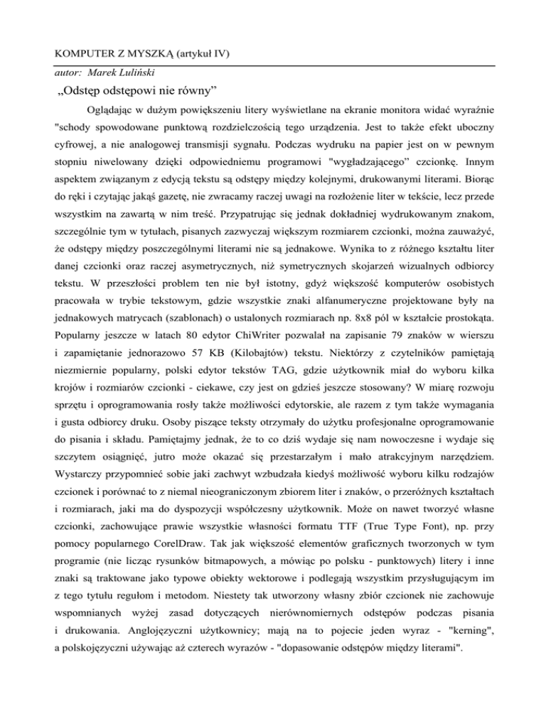 KOMPUTER Z MYSZKĄ (artykuł IV) autor: Marek Luliński „Odstęp odstępowi nie równy” Oglądając w dużym powiększeniu litery wyświetlane na ekranie monitora widać wyraźnie "schody spowodowane punktową rozdzielczością tego urządzenia. Jest to także efekt uboczny cyfrowej, a nie analogowej transmisji sygnału. Podczas wydruku na papier jest on w pewnym stopniu niwelowany dzięki odpowiedniemu programowi "wygładzającego” czcionkę. Innym aspektem związanym z edycją tekstu są odstępy między kolejnymi, drukowanymi literami. Biorąc do ręki i czytając jakąś gazetę, nie zwracamy raczej uwagi na rozłożenie liter w tekście, lecz przede wszystkim na zawartą w nim treść. Przypatrując się jednak dokładniej wydrukowanym znakom, szczególnie tym w tytułach, pisanych zazwyczaj większym rozmiarem czcionki, można zauważyć, że odstępy między poszczególnymi literami nie są jednakowe. Wynika to z różnego kształtu liter danej czcionki oraz raczej asymetrycznych, niż symetrycznych skojarzeń wizualnych odbiorcy tekstu. W przeszłości problem ten nie był istotny, gdyż większość komputerów osobistych pracowała w trybie tekstowym, gdzie wszystkie znaki alfanumeryczne projektowane były na jednakowych matrycach (szablonach) o ustalonych rozmiarach np. 8x8 pól w kształcie prostokąta. Popularny jeszcze w latach 80 edytor ChiWriter pozwalał na zapisanie 79 znaków w wierszu i zapamiętanie jednorazowo 57 KB (Kilobajtów) tekstu. Niektórzy z czytelników pamiętają niezmiernie popularny, polski edytor tekstów TAG, gdzie użytkownik miał do wyboru kilka krojów i rozmiarów czcionki - ciekawe, czy jest on gdzieś jeszcze stosowany? W miarę rozwoju sprzętu i oprogramowania rosły także możliwości edytorskie, ale razem z tym także wymagania i gusta odbiorcy druku. Osoby piszące teksty otrzymały do użytku profesjonalne oprogramowanie do pisania i składu. Pamiętajmy jednak, że to co dziś wydaje się nam nowoczesne i wydaje się szczytem osiągnięć, jutro może okazać się przestarzałym i mało atrakcyjnym narzędziem. Wystarczy przypomnieć sobie jaki zachwyt wzbudzała kiedyś możliwość wyboru kilku rodzajów czcionek i porównać to z niemal nieograniczonym zbiorem liter i znaków, o przeróżnych kształtach i rozmiarach, jaki ma do dyspozycji współczesny użytkownik. Może on nawet tworzyć własne czcionki, zachowujące prawie wszystkie własności formatu TTF (True Type Font), np. przy pomocy popularnego CorelDraw. Tak jak większość elementów graficznych tworzonych w tym programie (nie licząc rysunków bitmapowych, a mówiąc po polsku - punktowych) litery i inne znaki są traktowane jako typowe obiekty wektorowe i podlegają wszystkim przysługującym im z tego tytułu regułom i metodom. Niestety tak utworzony własny zbiór czcionek nie zachowuje wspomnianych wyżej zasad dotyczących nierównomiernych odstępów podczas pisania i drukowania. Anglojęzyczni użytkownicy; mają na to pojecie jeden wyraz - "kerning", a polskojęzyczni używając aż czterech wyrazów - "dopasowanie odstępów między literami".
