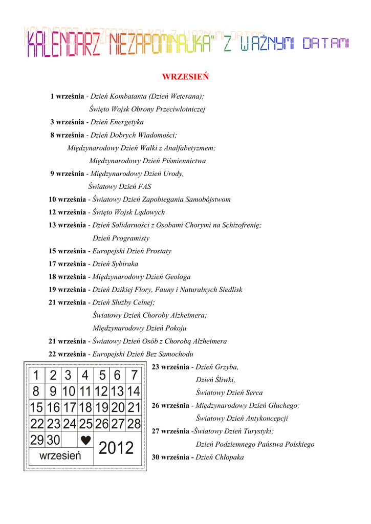 WRZESIEŃ 1 września - Dzień Kombatanta (Dzień Weterana); Święto Wojsk Obrony Przeciwlotniczej 3 września - Dzień Energetyka 8 września - Dzień Dobrych Wiadomości; Międzynarodowy Dzień Walki z Analfabetyzmem; Międzynarodowy Dzień Piśmiennictwa 9 września - Międzynarodowy Dzień Urody, Światowy Dzień FAS 10 września - Światowy Dzień Zapobiegania Samobójstwom 12 września - Święto Wojsk Lądowych 13 września - Dzień Solidarności z Osobami Chorymi na Schizofrenię; Dzień Programisty 15 września - Europejski Dzień Prostaty 17 września - Dzień Sybiraka 18 września - Międzynarodowy Dzień Geologa 19 września - Dzień Dzikiej Flory, Fauny i Naturalnych Siedlisk 21 września - Dzień Służby Celnej; Światowy Dzień Choroby Alzheimera; Międzynarodowy Dzień Pokoju 21 września - Światowy Dzień Osób z Chorobą Alzheimera 22 września - Europejski Dzień Bez Samochodu 23 września - Dzień Grzyba, Dzień Śliwki, Światowy Dzień Serca 26 września - Międzynarodowy Dzień Głuchego; Światowy Dzień Antykoncepcji 27 września -Światowy Dzień Turystyki; Dzień Podziemnego Państwa Polskiego 30 września - Dzień Chłopaka PAŹDZIERNIK 1 października - Międzynarodowy Dzień Wegetarianizmu; Międzynarodowy Dzień Lekarza; Międzynarodowy Dzień Ludzi Starszych 2 października - Międzynarodowy Dzień Bez Przemocy 4 października - Światowy Dzień Ochrony Zwierząt 5 października -Światowy Dzień Nauczycieli 6 października - Światowy Dzień Mieszkalnictwa 9 października - Światowy Dzień Poczty; Dzień Znaczka Pocztowego 10 października - Światowy Dzień Zdrowia Psychicznego, Światowy Dzień Drzewa 12 października - Dzień Bezpiecznego Komputera; Światowy Dzień Reumatyzmu 14 października - Dzień Edukacji Narodowej; Światowy Dzień Normalizacji 15 października - Międzynarodowy Dzień Niewidomych, Dzień Wolnego Oprogramowania 16 października - Światowy Dzień Żywności; Dzień Papieża Jana Pawła II (polskie, nie jest dniem wolnym od pracy) 17 października - Międzynarodowy Dzień Walki z Ubóstwem 18 października - Dzień Łącznościowca; Dzień Poczty Polskiej; Światowy Dzień Menopauzy i Andropauzy 22 października - Światowy Dzień Jąkających się 24 października - Dzień Walki z Otyłością; Dzień Organizacji Narodów Zjednoczonych; Światowy Dzień Informacji na temat Rozwoju 25 października - Dzień Kundelka 30 października - Narodowy Dzień Spódnicy 31 października - Światowy Dzień Oszczędności; Halloween ANIA, JULIA I OLA Z KLASY 5B