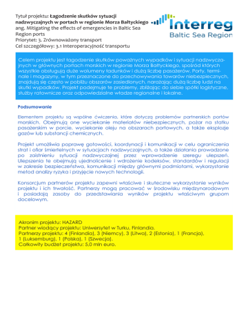 Tytuł projektu: Łagodzenie skutków sytuacji nadzwyczajnych w portach w regionie Morza Bałtyckiego ang. Mitigating the effects of emergencies in Baltic Sea Region ports Priorytet: 3. Zrównoważony transport Cel szczegółowy: 3.1 Interoperacyjność transportu Celem projektu jest łagodzenie skutków poważnych wypadków i sytuacji nadzwyczajnych w głównych portach morskich w regionie Morza Bałtyckiego, spośród których wszystkie obsługują duże wolumeny ładunków i dużą liczbę pasażerów. Porty, terminale i magazyny, w tym przeznaczone do przechowywania towarów niebezpiecznych, znajdują się często w pobliżu obszarów zasiedlonych, narażając dużą liczbę ludzi na skutki wypadków. Projekt podejmuje te problemy, zbliżając do siebie spółki logistyczne, służby ratownicze oraz odpowiedzialne władze regionalne i lokalne. Podsumowanie Elementem projektu są wspólne ćwiczenia, które dotyczą problemów partnerskich portów morskich. Obejmują one wyciekanie materiałów niebezpiecznych, pożar na statku pasażerskim w porcie, wyciekanie oleju na obszarach portowych, a także eksplozje gazów lub substancji chemicznych. Projekt umożliwia poprawę gotowości, koordynacji i komunikacji w celu ograniczenia strat i ofiar śmiertelnych w sytuacjach nadzwyczajnych, a także działania prowadzone po zaistnieniu sytuacji nadzwyczajnej przez wprowadzenie szeregu ulepszeń. Ulepszenia te obejmują ujednolicenie i wdrożenie kodeksów, standardów i regulacji w zakresie bezpieczeństwa, komunikacji między głównymi podmiotami, wykorzystanie metod analizy ryzyka i przyjęcie nowych technologii. Konsorcjum partnerów projektu zapewni właściwe i skuteczne wykorzystanie wyników projektu i ich trwałość. Partnerzy mogą pracować w środowisku międzynarodowym i posiadają zasoby do przedstawiania wyników projektu właściwym grupom docelowym. Akronim projektu: HAZARD Partner wiodący projektu: Uniwersytet w Turku, Finlandia. Partnerzy projektu: 4 (Finlandia), 3 (Niemcy), 3 (Litwa), 2 (Estonia), 1 (Francja), 1 (Luksemburg), 1 (Polska), 1 (Szwecja). Całkowity budżet projektu: 5,0 mln euro.