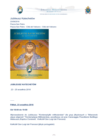 Jubileusz Katechetów 23/09/2016 Piazza San Pietro Piazza San Pietro - Città del Vaticano - Città del Vaticano JUBILEUSZ KATECHETÓW 23 - 25 wrze#nia 2016 Pi#tek, 23 wrze#nia 2016 Od 18:00 do 19:00 Wprowadzenie do Jubileuszu "Kontempluj#c mi#osierdzie" dla grup j#zykowych o "Miserando atque eligendo" "Kontemplacja Mi#osierdzia, pocz#wszy od prac Caravaggia Powo#anie #wi#tego Mateusza (Kaplica Contarelli, Ko#ció# San Luigi dei Francesi). Ko#ció# San Luigi dei Francesi (j#zyk portugalski) -1- Ko#ció# Santa Maria sopra Minerva (j#zyk francuski) Bazylika San Giovanni dei Fiorentini (j#zyk angielskim) Bazylika Sant'Andrea della Valle (w j#zyku hiszpa#ski) Katecheza w j#zyku w#oskim odb#dzie si# w sobot# 24 o godzinie 16:00 w bazylice #wi#tego Paw#a za Murami * W pi#tek i w sobot# ko#ció# #w. Ludwika pozostanie otwarty w godzinach (20:30 do 22:00), aby umo#liwi# pielgrzymom katechetom kontemplacj# obrazu Caravaggia. Sobota, 24 wrze#nia 2016 Od 9.00 do 14.00 W ko#cio#ach jubileuszowych: S. Salvatore in Lauro, S. Maria in Vallicella (Chiesa Nuova), Jana Chrzciciela z Florencji Adoracja eucharystyczna Sakrament Pojednania Od godziny 9,00 Pielgrzymka do Drzwi #wi#tych Mo#liwo## szlaku "#ladami #wi#tych i b#ogos#awionych katechezy" O godzinie 18:00 Nieszpory i #wiadectwo w bazylice #wi#tego Paw#a za Murami -2- Niedziela, 25 wrze#nia 2016 Godzina 10,30 Msza z Ojcem #wi#tym na Placu #wi#tego Piotra -3-