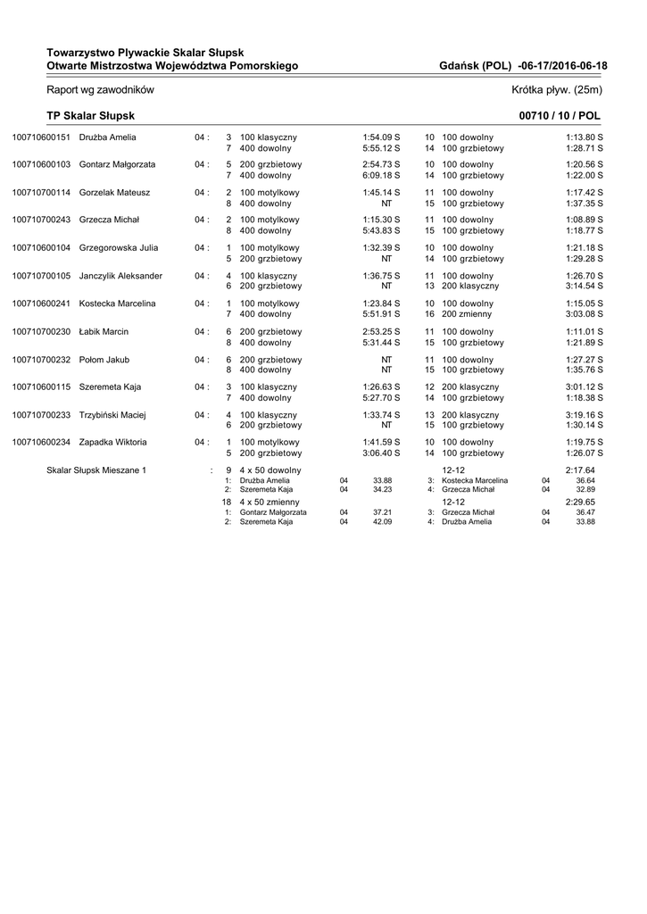 Towarzystwo Plywackie Skalar Słupsk Otwarte Mistrzostwa Województwa Pomorskiego Gdańsk (POL) -06-17/2016-06-18 Krótka pływ. (25m) Raport wg zawodników TP Skalar Słupsk 00710 / 10 / POL 100710600151 Drużba Amelia 04 : 3 7 100 klasyczny 400 dowolny 1:54.09 S 5:55.12 S 10 100 dowolny 14 100 grzbietowy 1:13.80 S 1:28.71 S 100710600103 Gontarz Małgorzata 04 : 5 7 200 grzbietowy 400 dowolny 2:54.73 S 6:09.18 S 10 100 dowolny 14 100 grzbietowy 1:20.56 S 1:22.00 S 100710700114 Gorzelak Mateusz 04 : 2 8 100 motylkowy 400 dowolny 1:45.14 S NT 11 100 dowolny 15 100 grzbietowy 1:17.42 S 1:37.35 S 100710700243 Grzecza Michał 04 : 2 8 100 motylkowy 400 dowolny 1:15.30 S 5:43.83 S 11 100 dowolny 15 100 grzbietowy 1:08.89 S 1:18.77 S 100710600104 Grzegorowska Julia 04 : 1 5 100 motylkowy 200 grzbietowy 1:32.39 S NT 10 100 dowolny 14 100 grzbietowy 1:21.18 S 1:29.28 S 100710700105 Janczylik Aleksander 04 : 4 6 100 klasyczny 200 grzbietowy 1:36.75 S NT 11 100 dowolny 13 200 klasyczny 1:26.70 S 3:14.54 S 100710600241 Kostecka Marcelina 04 : 1 7 100 motylkowy 400 dowolny 1:23.84 S 5:51.91 S 10 100 dowolny 16 200 zmienny 1:15.05 S 3:03.08 S 100710700230 Łabik Marcin 04 : 6 8 200 grzbietowy 400 dowolny 2:53.25 S 5:31.44 S 11 100 dowolny 15 100 grzbietowy 1:11.01 S 1:21.89 S 100710700232 Połom Jakub 04 : 6 8 200 grzbietowy 400 dowolny 11 100 dowolny 15 100 grzbietowy 1:27.27 S 1:35.76 S 100710600115 Szeremeta Kaja 04 : 3 7 100 klasyczny 400 dowolny 1:26.63 S 5:27.70 S 12 200 klasyczny 14 100 grzbietowy 3:01.12 S 1:18.38 S 100710700233 Trzybiński Maciej 04 : 4 6 100 klasyczny 200 grzbietowy 1:33.74 S NT 13 200 klasyczny 15 100 grzbietowy 3:19.16 S 1:30.14 S 100710600234 Zapadka Wiktoria 04 : 1 5 100 motylkowy 200 grzbietowy 1:41.59 S 3:06.40 S 10 100 dowolny 14 100 grzbietowy 1:19.75 S 1:26.07 S 9 4 x 50 dowolny 1: 2: Drużba Amelia Szeremeta Kaja Skalar Słupsk Mieszane 1 : 18 1: 2: NT NT 12-12 04 04 33.88 34.23 3: 4: 04 04 37.21 42.09 3: 4: 4 x 50 zmienny Gontarz Małgorzata Szeremeta Kaja Kostecka Marcelina Grzecza Michał 2:17.64 04 04 12-12 Grzecza Michał Drużba Amelia 36.64 32.89 2:29.65 04 04 36.47 33.88