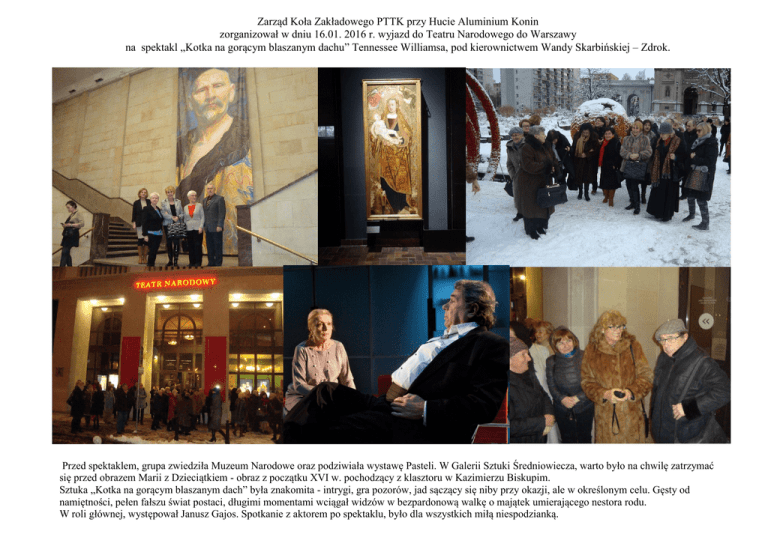 Zarząd Koła Zakładowego PTTK przy Hucie Aluminium Konin zorganizował w dniu 16.01. 2016 r. wyjazd do Teatru Narodowego do Warszawy na spektakl „Kotka na gorącym blaszanym dachu” Tennessee Williamsa, pod kierownictwem Wandy Skarbińskiej – Zdrok. Przed spektaklem, grupa zwiedziła Muzeum Narodowe oraz podziwiała wystawę Pasteli. W Galerii Sztuki Średniowiecza, warto było na chwilę zatrzymać się przed obrazem Marii z Dzieciątkiem - obraz z początku XVI w. pochodzący z klasztoru w Kazimierzu Biskupim. Sztuka „Kotka na gorącym blaszanym dach” była znakomita - intrygi, gra pozorów, jad sączący się niby przy okazji, ale w określonym celu. Gęsty od namiętności, pełen fałszu świat postaci, długimi momentami wciągał widzów w bezpardonową walkę o majątek umierającego nestora rodu. W roli głównej, występował Janusz Gajos. Spotkanie z aktorem po spektaklu, było dla wszystkich miłą niespodzianką. Zdjęcia: strona Teatru Narodowego, Wanda Skarbińska -Zdrok
