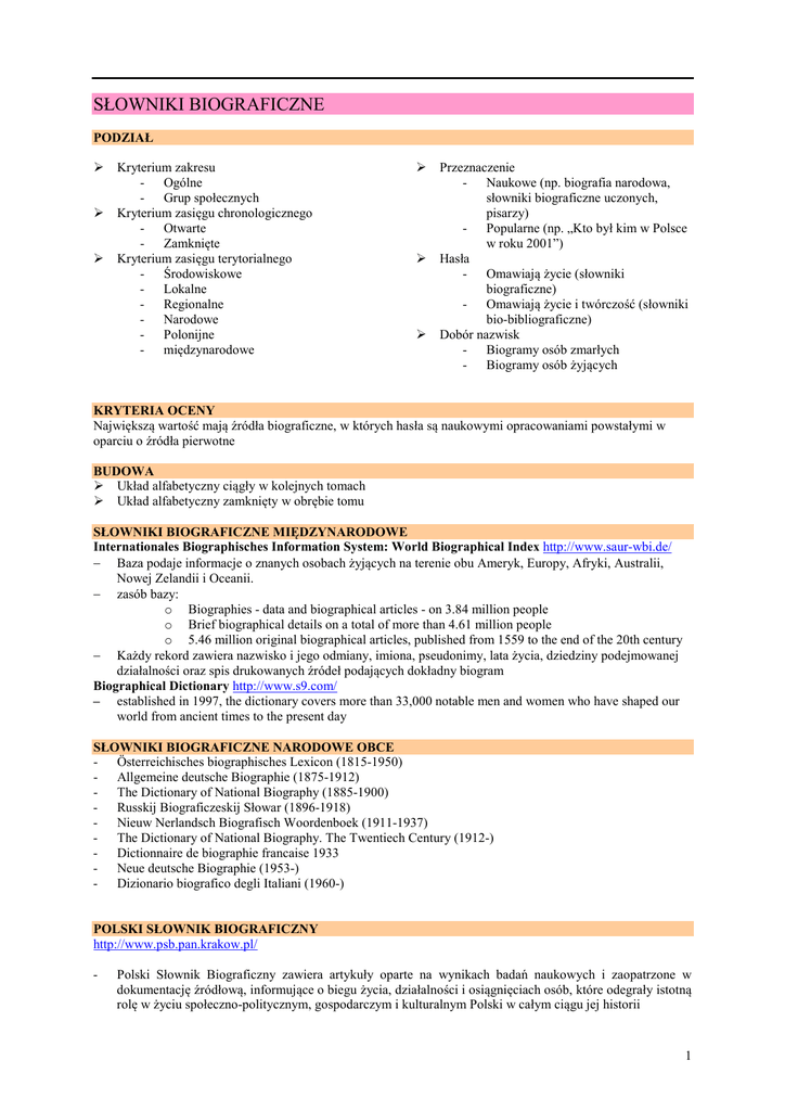SŁOWNIKI BIOGRAFICZNE PODZIAŁ Kryterium zakresu - Ogólne - Grup społecznych Kryterium zasięgu chronologicznego - Otwarte - Zamknięte Kryterium zasięgu terytorialnego - Środowiskowe - Lokalne - Regionalne - Narodowe - Polonijne - międzynarodowe Przeznaczenie - Naukowe (np. biografia narodowa, słowniki biograficzne uczonych, pisarzy) - Popularne (np. „Kto był kim w Polsce w roku 2001”) Hasła - Omawiają życie (słowniki biograficzne) - Omawiają życie i twórczość (słowniki bio-bibliograficzne) Dobór nazwisk - Biogramy osób zmarłych - Biogramy osób żyjących KRYTERIA OCENY Największą wartość mają źródła biograficzne, w których hasła są naukowymi opracowaniami powstałymi w oparciu o źródła pierwotne BUDOWA Układ alfabetyczny ciągły w kolejnych tomach Układ alfabetyczny zamknięty w obrębie tomu SŁOWNIKI BIOGRAFICZNE MIĘDZYNARODOWE Internationales Biographisches Information System: World Biographical Index http://www.saur-wbi.de/ − Baza podaje informacje o znanych osobach żyjących na terenie obu Ameryk, Europy, Afryki, Australii, Nowej Zelandii i Oceanii. − zasób bazy: o Biographies - data and biographical articles - on 3.84 million people o Brief biographical details on a total of more than 4.61 million people o 5.46 million original biographical articles, published from 1559 to the end of the 20th century − Każdy rekord zawiera nazwisko i jego odmiany, imiona, pseudonimy, lata życia, dziedziny podejmowanej działalności oraz spis drukowanych źródeł podających dokładny biogram Biographical Dictionary http://www.s9.com/ – established in 1997, the dictionary covers more than 33,000 notable men and women who have shaped our world from ancient times to the present day SŁOWNIKI BIOGRAFICZNE NARODOWE OBCE - Österreichisches biographisches Lexicon (1815-1950) - Allgemeine deutsche Biographie (1875-1912) - The Dictionary of National Biography (1885-1900) - Russkij Biograficzeskij Słowar (1896-1918) - Nieuw Nerlandsch Biografisch Woordenboek (1911-1937) - The Dictionary of National Biography. The Twentiech Century (1912-) - Dictionnaire de biographie francaise 1933 - Neue deutsche Biographie (1953-) - Dizionario biografico degli Italiani (1960-) POLSKI SŁOWNIK BIOGRAFICZNY http://www.psb.pan.krakow.pl/ - Polski Słownik Biograficzny zawiera artykuły oparte na wynikach badań naukowych i zaopatrzone w dokumentację źródłową, informujące o biegu życia, działalności i osiągnięciach osób, które odegrały istotną rolę w życiu społeczno-politycznym, gospodarczym i kulturalnym Polski w całym ciągu jej historii 1 - - - - - - - - - - - w 1928 roku Polskie Towarzystwo Historyczne we Lwowie przystąpiło do prac nad polskim Słownikiem biograficznym doby porozbiorowej, w Krakowie zaczęto prace nad tworzeniem Słownika biograficznego Polski przedrozbiorowej, obydwa te przedsięwzięcia połączono; prace nad POLSKIM SŁOWNIKIEM BIOGRAFICZNYM [dalej: PSB] ruszyły w 1931 roku. Pierwszym redaktorem był Władysław Konopczyński, kolejnymi Kazimierz Lepszy, Emanuel Rostworowski, Henryk Markiewicz Pierwszy tom wydała w 1935 roku Polska Akademia Umiejętności. Składają się nań cztery zeszyty po ok. 90 biogramów każdy. Obecnie PSB jest opracowywany w Instytucie Historii PAN, w Zakładzie PSB, Redaktorem Naczelnym PSB jest prof. dr hab. Andrzej Romanowski. Nakładem PAU i PAN co roku ukazują się, trzy zeszyty (najnowszy z numerem 185). Polski Słownik Biograficzny składa się z 29 tys. zadrukowanych stron i 25 tys. życiorysów wybitnych Polaków. Jest to najwybitniejsze tego typu wydawnictwo w świecie. Ukończenie dzieła planuje się na ok. 2035 rok. Od 1994 r. PSB jest dotowany przez Fundację na Rzecz Nauki Polskiej. Nakład nigdy nie przekraczał 4000 egzemplarzy Kiedyś do PSB można było trafić piec lat po śmierci. Aby przyspieszyć edycje, zmieniono kryteria. Obecnie słownik (www.psb.pan.krakow.pl) ma obejmować tylko biogramy zmarłych przed 2000 rokiem. PSB miał dwie przerwy wydawnicze, spowodowane najpierw przez okupację hitlerowską, następnie przez stalinizm (1949-1955) oraz dwie próby zawieszenia (1968, 1983 – gen. Kiszczak) PSB był tworzony w odmiennych warunkach politycznych, na jego powstawanie miała wpływ cenzura. Biogramy niektórych osób są pozbawione miejsc i dat śmierci. Licząc na domyślność czytelników, zaczęto umieszczać w dołączonej do życiorysów bibliografii listę ofiar katyńskich. Erraty dołączone do tomu 32 (1991) usunęły fałszerstwa. Mimo to PSB wychodził zawsze na zasadzie cenzuralnej taryfy ulgowej, wywodzącej się z przekonania o elitarnym charakterze tego wydawnictwa. PSB wystartował pod znakiem całkowitego obiektywizmu. We wstępie do tomu pierwszego Władysław Konopczyński pisał: „Nie wysławia ani zniesławia, nie jest „Plutarchem” polskim, nie ubiega się za rewelacją ani rewizją starych poglądów”. Od początku słownik miał spełniać ambitniejsze, bardziej dalekosiężne zadania. Zdaniem redakcji PSB powinien on „poza informacją i popularyzacją wiedzy (...) mieć na oku cele naukowe. (...) Ustalenie tożsamości mnóstwa osób, umieszczenie ich w dokładnych ramach czasu i przestrzeni uwolni badaczy życia zbiorowego od kłopotliwej pogoni za jednostkami”. Redakcji PSB przyszło starać się o dane w parafiach, urzędach stanu cywilnego, zarządach cmentarzy, archiwach, odnotowywać i wyzyskiwać wspomnienia pośmiertne i nekrologi, akta studenckie wyższych uczelni, akta personalne instytucji, w których pracowała dana osoba Do współpracy pozyskuje się najlepszych znawców przedmiotu. Z PSB współpracuje ok. 1000 autorów reprezentujących różne ośrodki i różne pokolenia Nad doborem nazwisk pracuje zespół. Dobierane są na podstawie publikowanych nekrologów Każdy życiorys zawiera podstawowe, zawsze te same elementy, przez co można odnieść wrażenie, że wszystkie hasła pozostają na tym samym poziom