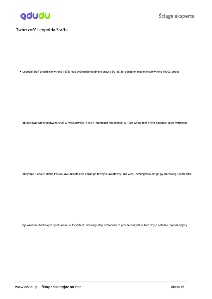 Ściąga eksperta Twórczość Leopolda Staffa Leopold Staff urodził się w roku 1878; jego twórczość obejmuje prawie 60 lat; jej początek miał miejsce w roku 1900; poeta opublikował wtedy pierwsze liryki w miesięczniku "Teka"; natomiast rok później, w 1901 wydał tom Sny o potędze; jego twórczość obejmuje 3 epoki: Młodą Polskę, dwudziestolecie i czas po II wojnie światowej; dla wielu, szczególnie dla grupy literackiej Skamander, był wzorem, duchowym opiekunem i autorytetem; pierwszy etap twórczości to przede wszystkim tom Sny o potędze, najważniejszy www.edudu.pl - filmy edukacyjne on-line Strona 1/8 Ściąga eksperta w tomie jest chyba wiersz Kowal wiersz Kowal Leopolda Staffa pochodzi z tomu Sny o potędze, zbioru debiutanckiego, opublikowanego w roku 1901; takie umiejscowienie wiersza nie jest przypadkowe, bowiem tom ten został napisany w duchu postawy witalistyczno-aktywistycznej, zainspirowanej filozofią Nietzschego; Sny o potędze obfitują w postaci mocarzy, herosów, jedną z nich jest ów tytułowy Kowal, zatem można potraktować tytuł jako odniesienie do całości, wpisanie w cykl; podmiotem lirycznym wiersza jest www.edudu.pl - filmy edukacyjne on-line Strona 2/8 Ściąga eksperta bohater tytułowy, czyli kowal; charakteryzuje go przestrzeń pracy, która stworzona jest właściwie z samych sugestii: stalowe kowadło, młot, kruszce drogocenne, wulkan, otchłań; to obrazowanie zaczerpnięte zostało z mitologii greckiej, w której istniał mit boga Hefajstosa, opiekuna kowali, złotników, ognia Całą bezkształtną masę kruszców drogocennych, Które zaległy piersi mej głąb nieodgadłą, www.edudu.pl - filmy edukacyjne on-line Strona 3/8 Ściąga eksperta Jak wulkan z swych otchłani wyrzucam bezdennych I ciskam ją na twarde, stalowe kowadło. adresatem wiersza, pojawiającym się w trzeciej strofie, jest serce; świadczy o tym bezpośredni zwrot do niego Lecz gdy ulegniesz, serce, pod młota żelazem, zaimek cię, formy czasownikowe ulegniesz, pękniesz, giń, niżbyś Bo lepiej giń, zmiażdżone cyklopowym razem, Niżbyś żyć miało własną słabością przeklęte, Rysą chorej niemocy skażone, pęknięte. Kowal prezentuje postawę typową dla filozofii Nietzschego; prezentuje jednostkę, która używa woli mocy, aby pracować nad własną siłą, indywidualnością i osobowością; Kowal jest tu metaforą postawy nadczłowieka, drogocenne kruszce, które wrzuca www.edudu.pl - filmy edukacyjne on-line Strona 4/8 Ściąga eksperta na kowadło to cechy ludzkie z nich powstanie mężne, dumne serce; człowiek, podobanie jak kowal musi i może wypracować sobie własną siłę i osobowość wiersz Deszcz jesienny pochodzi z tomu Dzień duszy opublikowanego w roku 1903; Staff prezentuje w nim typowo dekadencki światopogląd opierający się na triadzie: melancholia, monotonia, powtarzalność; odzwierciedla ją budowa, treść i przesłanie wiersza; klimat melancholii, smutku i monotonnej powtarzalności buduje powtarzający się fragment: O szyby deszcz dzwoni, deszcz dzwoni jesienny I pluszcze jednaki, miarowy, niezmienny, Dżdżu krople padają i tłuką w me okno... Jęk szklany... płacz szklany... a szyby w mgle mokną I światła szarego blask sączy się senny... O szyby deszcz dzwoni, deszcz dzwoni jesienny... charakterystyczne brzmienie tekstu, upodobnienie słów do deszczu, to podstawowy zabieg stylistyczny w utworze o nazwie www.edudu.pl - filmy edukacyjne on-line Strona 5/8 Ściąga eksperta onomatopeja, czyli właśnie dźwiękonaśladowczość; dalej maluje obraz świata, który podmiot liryczny ogląda przez zamazane deszczem szyby, na obraz składają się III wizje: 1. korowód mar idących pochodem przez ogród wśród płaczu i zawodzenia 2. niejasne wspomnienie pogrzebu, niespełnionej miłości, tragedii pożaru, płaczu ludzkiego 3. obraz diabła płaczącego na widok zniszczenia którego sam dokonał w pięknym ogrodzie część druga opisuje odchodzenie ludzi, bliższych i dalszych, lubianych i kochanych; nie mówi się wprost kto to, używa się wymiennie zaimków kto, ktoś; chodzi nie tylko o odchodzenie, ale i umieranie oraz rezygnację z drugiej osoby, rezygnację z uczucia www.edudu.pl - filmy edukacyjne on-line Strona 6/8 Ściąga eksperta na rzecz nieczułości i niewrażliwości, a więc postawy bezpiecznej i ochronnej wobec siebie; takie ubezpieczanie się ma także głębszy wymiar: jest to rezygnacja z wyzwań, z aktywności, z kształtowania samego siebie, a więc Deszcz jesienny niejako przeczy idei czynu zawartej w Kowalu; podmiot liryczny mówi również o bezgranicznej samotności, w której teraz żyje; filozofii Nietzschego używał poeta w sposób przemyślany, aby za jej pomocą odgonić dekadencki klimat i poczucie niemocy; Leopold www.edudu.pl - filmy edukacyjne on-line Strona 7/8 Ściąga eksperta Staff był tłumaczem tekstów tego filozofa, więc znal je świetnie i również dlatego odegrały one w jego życiu i twórczości ważną rolę ostatni- trzeci etap twórczości Staffa - nazywany okresem franciszkańskim www.edudu.pl - filmy edukacyjne on-line Powered by TCPDF (www.tcpdf.org) Strona 8/8