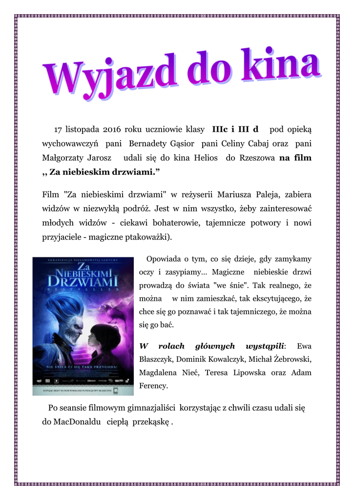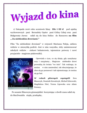 17 listopada 2016 roku uczniowie klasy IIIc i III d pod opieką wychowawczyń pani Bernadety Gąsior pani Celiny Cabaj oraz pani Małgorzaty Jarosz udali się do kina Helios do Rzeszowa na film ,, Za niebieskim drzwiami.” Film "Za niebieskimi drzwiami" w reżyserii Mariusza Paleja, zabiera widzów w niezwykłą podróż. Jest w nim wszystko, żeby zainteresować młodych widzów - ciekawi bohaterowie, tajemnicze potwory i nowi przyjaciele - magiczne ptakoważki). Opowiada o tym, co się dzieje, gdy zamykamy oczy i zasypiamy… Magiczne niebieskie drzwi prowadzą do świata "we śnie". Tak realnego, że można w nim zamieszkać, tak ekscytującego, że chce się go poznawać i tak tajemniczego, że można się go bać. W rolach głównych wystąpili: Ewa Błaszczyk, Dominik Kowalczyk, Michał Żebrowski, Magdalena Nieć, Teresa Lipowska oraz Adam Ferency. Po seansie filmowym gimnazjaliści korzystając z chwili czasu udali się do MacDonaldu ciepłą przekąskę .