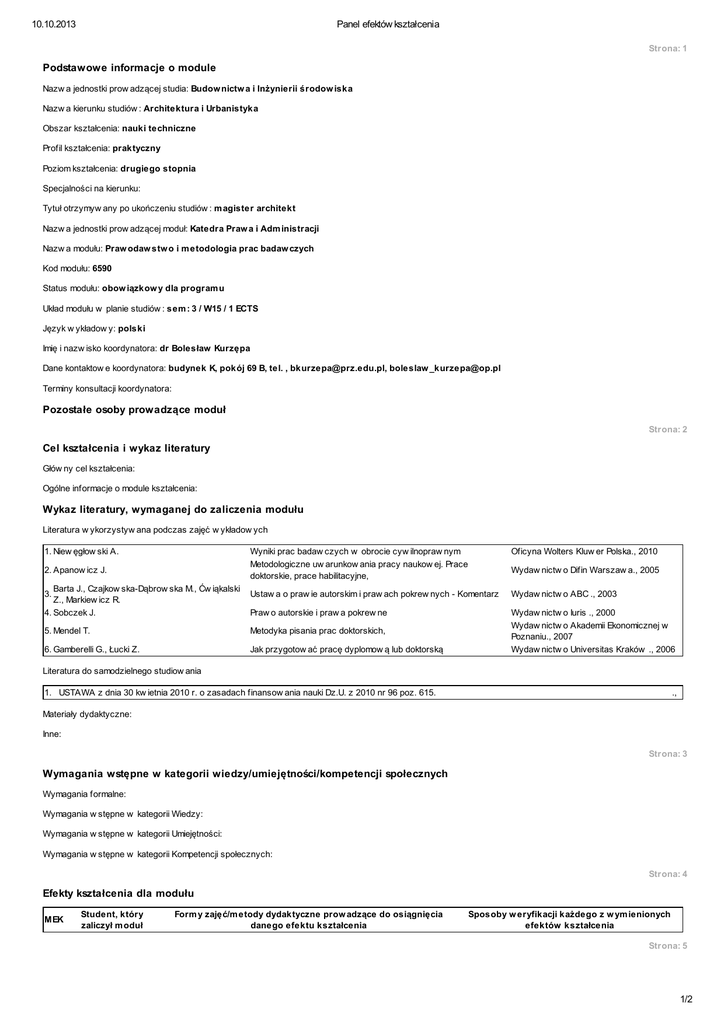 10.10.2013 Panel efektów kształcenia Strona: 1 Podstawowe informacje o module Nazw a jednostki prow adzącej studia: Budow nictw a i Inżynierii środow iska Nazw a kierunku studiów : Architektura i Urbanistyka Obszar kształcenia: nauki techniczne Profil kształcenia: praktyczny Poziom kształcenia: drugiego stopnia Specjalności na kierunku: Tytuł otrzymyw any po ukończeniu studiów : m agister architekt Nazw a jednostki prow adzącej moduł: Katedra Praw a i Adm inistracji Nazw a modułu: Praw odaw stw o i m etodologia prac badaw czych Kod modułu: 6590 Status modułu: obow iązkow y dla program u Układ modułu w planie studiów : sem : 3 / W15 / 1 ECTS Język w ykładow y: polski Imię i nazw isko koordynatora: dr Bolesław Kurzępa Dane kontaktow e koordynatora: budynek K, pokój 69 B, tel. , [email protected], boleslaw [email protected] Terminy konsultacji koordynatora: Pozostałe osoby prowadzące moduł Strona: 2 Cel kształcenia i wykaz literatury Głów ny cel kształcenia: Ogólne informacje o module kształcenia: Wykaz literatury, wymaganej do zaliczenia modułu Literatura w ykorzystyw ana podczas zajęć w ykładow ych 1. Niew ęgłow ski A. 2. Apanow icz J. Barta J., Czajkow ska-Dąbrow ska M., Ćw iąkalski Z., Markiew icz R. 4. Sobczek J. 3. Wyniki prac badaw czych w obrocie cyw ilnopraw nym Metodologiczne uw arunkow ania pracy naukow ej. Prace doktorskie, prace habilitacyjne, Oficyna Wolters Kluw er Polska., 2010 Ustaw a o praw ie autorskim i praw ach pokrew nych - Komentarz Wydaw nictw o ABC ., 2003 Praw o autorskie i praw a pokrew ne Wydaw nictw o Iuris ., 2000 Wydaw nictw o Akademii Ekonomicznej w Poznaniu., 2007 Wydaw nictw o Universitas Kraków ., 2006 5. Mendel T. Metodyka pisania prac doktorskich, 6. Gamberelli G., Łucki Z. Jak przygotow ać pracę dyplomow ą lub doktorską Wydaw nictw o Difin Warszaw a., 2005 Literatura do samodzielnego studiow ania 1. USTAWA z dnia 30 kw ietnia 2010 r. o zasadach finansow ania nauki Dz.U. z 2010 nr 96 poz. 615. ., Materiały dydaktyczne: Inne: Strona: 3 Wymagania wstępne w kategorii wiedzy/umiejętności/kompetencji społecznych Wymagania formalne: Wymagania w stępne w kategorii Wiedzy: Wymagania w stępne w kategorii Umiejętności: Wymagania w stępne w kategorii Kompetencji społecznych: Strona: 4 Efekty kształcenia dla modułu MEK Student, który zaliczył m oduł Form y zajęć/m etody dydaktyczne prow adzące do osiągnięcia danego efektu kształcenia Sposoby w eryfikacji każdego z w ym ienionych efektów kształcenia Strona: 5 1/2 10.10.2013 Panel efektów kształcenia Treści kształcenia dla modułu Sem . TK Treści kształcenia Realizow ane na 3 TK01 Zarządzanie jako działalność komercyjna, w yniki prac badaw czych w obrocie cyw ilnopraw nym W01, W02 3 TK02 Finansow anie programów i przedsięw zięć naukow ych W03 3 TK03 Zarządzanie i definicja projektu W04, W05 3 TK04 Uw arunkow ania praw ne w działalności architektonicznej (praw o budow lane i inne) W06, W07 3 TK05 Podstaw y praw ne podejmow ania decyzji w architekturze, urbanistyce i planow aniu przestrzennym W08, W09 3 TK06 Analizy praw ne przedsięw zięć W10, W11 3 TK07 Metodologia pracy naukow ej, etapy pracy badaw czej W12 3 TK08 Studia doktoranckie jako przygotow anie do pracy naukow e W13, W14 3 TK09 Metodyka pracy doktorskiej zagadnienia ogólne W15 Strona: 6 Nakład pracy studenta Form a zajęć Praca przed zajęciam i Wykład (sem. 3) Udział w zajęciach Praca po zajęciach Godziny kontaktow e: 15.00 godz./sem. Konsultacje (sem. 3) Zaliczenie (sem. 3) Strona: 7 Warunki zaliczenia modułu Student, który zaliczył moduł Student, który osiągnął zakładany poziom wiedzy, posiadł wymagane umiejętności ,które są zdefiniowane w efektach kształcenia dla modułu, zalicza moduł kształcenia Student, który nie osiągnął zakładanych efektów kształcenia, nie zalicza modułu kształcenia Sposób wystawiania ocen składowych modułu i oceny końcowej Form a zajęć Sposób w ystaw iania oceny podsum ow ującej Wykład Ocena końcow a Strona: 8 Przykładowe zadania Wymagane podczas egzaminu/zaliczenia Realizow ane podczas zajęć ćw iczeniow ych/laboratoryjnych/projektow ych Inne Czy podczas egzaminu/zaliczenia student ma możliw ość korzystania z materiałów pomocniczych: nie 2/2