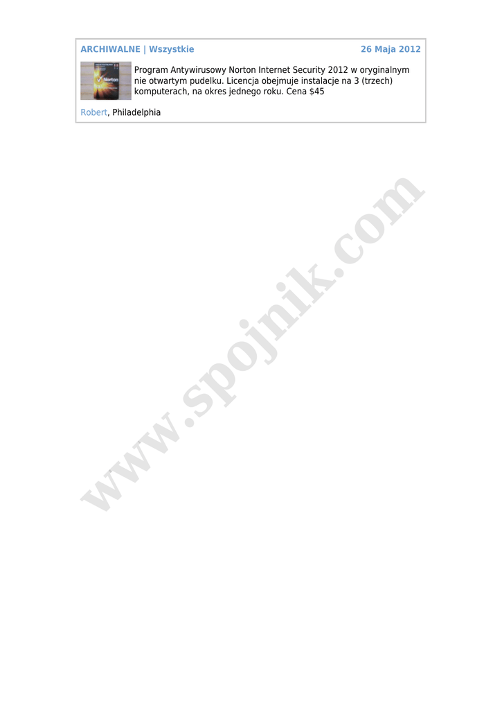 ARCHIWALNE | Wszystkie 26 Maja 2012 Program Antywirusowy Norton Internet Security 2012 w oryginalnym nie otwartym pudelku. Licencja obejmuje instalacje na 3 (trzech) komputerach, na okres jednego roku. Cena $45 w w w .s po jn ik .c o m Robert, Philadelphia