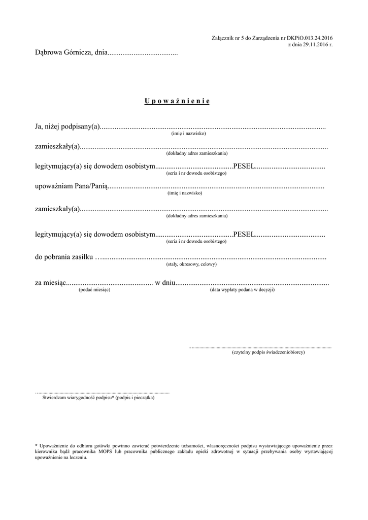 Załącznik nr 5 do Zarządzenia nr DKPiO.013.24.2016 z dnia 29.11.2016 r. Dąbrowa Górnicza, dnia...................................... Upoważnienie Ja, niżej podpisany(a).......................................................................................................................... (imię i nazwisko) zamieszkały(a)...................................................................................................................................... (dokładny adres zamieszkania) legitymujący(a) się dowodem osobistym..........................................PESEL...................................... (seria i nr dowodu osobistego) upoważniam Pana/Panią..................................................................................................................... (imię i nazwisko) zamieszkały(a)...................................................................................................................................... (dokładny adres zamieszkania) legitymujący(a) się dowodem osobistym..........................................PESEL...................................... (seria i nr dowodu osobistego) do pobrania zasiłku …......................................................................................................................... (stały, okresowy, celowy) za miesiąc............................................... w dniu................................................................................... (podać miesiąc) (data wypłaty podana w decyzji) …................................................................................................................ (czytelny podpis świadczeniobiorcy) …......................................................................................................... Stwierdzam wiarygodność podpisu* (podpis i pieczątka) * Upoważnienie do odbioru gotówki powinno zawierać potwierdzenie tożsamości, własnoręczności podpisu wystawiającego upoważnienie przez kierownika bądź pracownika MOPS lub pracownika publicznego zakładu opieki zdrowotnej w sytuacji przebywania osoby wystawiającej upoważnienie na leczeniu.