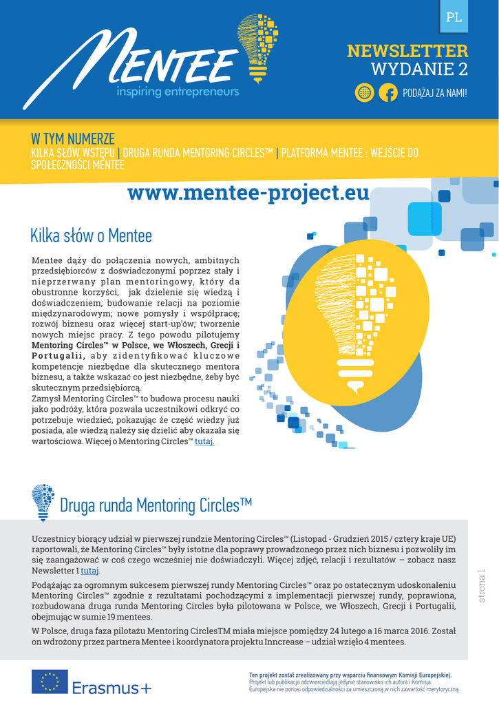 PL NEWSLETTER WYDANIE 2 ENTEE inspiring entrepreneurs PODĄŻAJ ZA NAMI! W TYM NUMERZE KILKA SŁÓW WSTĘPU | DRUGA RUNDA MENTORING CIRCLES™ | PLATFORMA MENTEE : WEJŚCIE DO SPOŁECZNOŚCI MENTEE www.mentee-project.eu Kilka słów o Mentee Mentee dąży do połączenia nowych, ambitnych przedsiębiorców z doświadczonymi poprzez stały i nieprzer wany plan mentoringowy, któr y da obustronne korzyści, jak dzielenie się wiedzą i doświadczeniem; budowanie relacji na poziomie międzynarodowym; nowe pomysły i współpracę; rozwój biznesu oraz więcej start-up'ów; tworzenie nowych miejsc pracy. Z tego powodu pilotujemy Mentoring Circles™ w Polsce, we Włoszech, Grecji i Portugalii, aby zidentyfikować kluczowe kompetencje niezbędne dla skutecznego mentora biznesu, a także wskazać co jest niezbędne, żeby być skutecznym przedsiębiorcą. Zamysł Mentoring Circles™ to budowa procesu nauki jako podróży, która pozwala uczestnikowi odkryć co potrzebuje wiedzieć, pokazując że część wiedzy już posiada, ale wiedzą należy się dzielić aby okazała się wartościowa. Więcej o Mentoring Circles™ tutaj. Uczestnicy biorący udział w pierwszej rundzie Mentoring Circles™ (Listopad - Grudzień 2015 / cztery kraje UE) raportowali, że Mentoring Circles™ były istotne dla poprawy prowadzonego przez nich biznesu i pozwoliły im się zaangażować w coś czego wcześniej nie doświadczyli. Więcej zdjęć, relacji i rezultatów – zobacz nasz Newsletter 1 tutaj. Podążając za ogromnym sukcesem pierwszej rundy Mentoring Circles™ oraz po ostatecznym udoskonaleniu Mentoring Circles™ zgodnie z rezultatami pochodzącymi z implementacji pierwszej rundy, poprawiona, rozbudowana druga runda Mentoring Circles była pilotowana w Polsce, we Włoszech, Grecji i Portugalii, obejmując w sumie 19 mentees. W Polsce, druga faza pilotażu Mentoring CirclesTM miała miejsce pomiędzy 24 lutego a 16 marca 2016. Został on wdrożony przez partnera Mentee i koordynatora projektu Inncrease – udział wzięło 4 mentees. Ten projekt został zrealizowany przy wsparciu finansowym Komisji Europejskiej. Projekt lub publikacja odzwierciedlają jedynie stanowisko ich autora i Komisja Europejska nie ponosi odpowiedzialności za umieszczoną w nich zawartość merytoryczną. strona 1 Druga runda Mentoring Circles™ PL NEWSLETTER WYDANIE 2 ENTEE inspiring entrepreneurs PODĄŻAJ ZA NAMI! We Włoszech, partner Quality Program przeprowadził Mentoring CirclesTM w Materze pomiędzy 9 marca a 12 kwietnia 2016 - udział wzięło 5 mentees. Mentortec w Portugalii zorganizował drugą rundę sesji Mentoring CirclesTM od 1 do 16 marca 2016 - udział wzięło 5 mentees. Druga runda greckiej sesji Mentoring CirclesTM zorganizowana i przeprowadzona przez partnera knowl rozpoczęła się 24 marca a zakończyła 8 kwietnia 2016- udział wzięło 5 mentees. Oczekiwania stawiane przed sesjami Mentoring CirclesTM ponownie zostały osiągnięte, jako że uczestnicy mieli możliwość zastanawiać się nad ważnymi aspektami ich planów przedsiębiorczości i wizji vis-à-vis ich osobowości, które są wartościowy kapitałem na przyszłość. Wszystko to było ułatwione przez możliwość spotkania innych, z którymi mogli dzielić podobne wizje; uczyć się jak się na nich skupiać i ustalać krótko i długo terminowe cele; stać się świadomym swoich mocnych stron i stać się bardziej pewnym siebie; zrozumieć zalety networking'u i wymiany poglądów z innymi ambitnymi przedsiębiorcami; w pełni akceptować siebie jakimi są i skłaniać się do działania. Spójrzmy na kilka relacji. “ AR: “Teraz mam mocny ale elastyczny plan działania. Program przypomniał mi, że im więcej rozmawiam z ludźmi to więcej ludzi chce mi pomóc. Po kilku sesjach zdecydowałam zacząć działać. Program dał mi siłę nauczył mnie działać oraz stawiać realistyczne mierzalne cele. Mentoring Circles pomógł mi uporządkować wiedzę. Co więcej grupa dała mi wiele siły. Bardzo wartościowe jest znać inne punkty widzenia zaczynając nowy biznes.”. NK: “Stworzyłam plan jak rozwijać moją ścieżkę kariery. Najbardziej wartościowa była część o zarządzaniu czasem i efektywności pracy. W mojej opinii grupa i prowadzący dali duży wkład dla nowego rozwoju biznesu”. ZU: “Otrzymałam dużo rad podczas sesji MC. Rozwinęłam moje umiejętności przywódcze. Dodatkowo ustaliłam cele i teraz próbuję je realizować. Jestem bardzo zadowolona, że to robię”. “ Ten projekt został zrealizowany przy wsparciu finansowym Komisji Europejskiej. Projekt lub publikacja odzwierciedlają jedynie stanowisko ich autora i Komisja Europejska nie ponosi odpowiedzialności za umieszczoną w nich zawartość merytoryczną. strona 2 Druga runda Mentoring Circles™ w Polsce (Warszawa) // Inncrease PL NEWSLETTER WYDANIE 2 ENTEE inspiring entrepreneurs “ PODĄŻAJ ZA NAMI! Druga runda Mentoring Circles™ w Portugalii // Mentortech “ NP: “Mentoring Circle doświadczeniem dojącym wartość dodaną dla tych którzy są odważnymi przedsiębiorcami!” CS: “Mentoring Circle było szansą na dzielenie się osobistymi i zawodowymi doświadczeniami, które bazując na pytaniach do przemyślenia, pojawiły się nowe inspiracje i innowacyjne pomysły!” RP: “Mentoring Circle był istotny jasnej i konkretnej definicji jakie powinny być następne kroki w moim biznesie!” “ Druga runda Mentoring Circles™ we Włoszech (Matera) // Quality Program “ “ Druga runda Mentoring Circles™ w Grecji (Athens) // knowl “ KV: „Chciałbym zdecydowanie zarekomendować Mentoring Circles™ innym ambitnym przedsiębiorcom ponieważ podniesie się ich samoświadomość, pewność siebie, wzbogaci się ich idea biznesu oraz otworzą się nowe horyzonty w tym znaczeniu, że pomoże im wykorzystać w pełni mocne strony i radzić sobie ze słabościami. KT: „Workshop pomógł mi zaplanować konkretne cele do osiągni