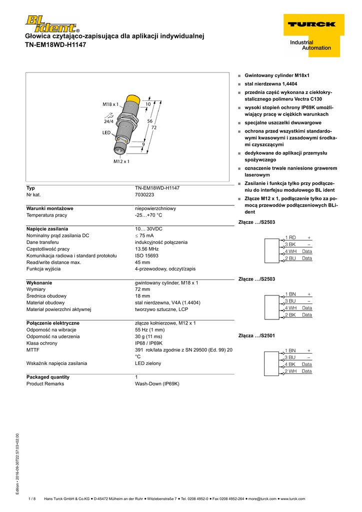 Głowica czytająco-zapisująca dla aplikacji indywidualnej TN-EM18WD-H1147 ■ Gwintowany cylinder M18x1 ■ stal nierdzewna 1,4404 ■ przednia część wykonana z ciekłokrystalicznego polimeru Vectra C130 ■ wysoki stopień ochrony IP69K umożliwiający pracę w ciężkich warunkach ■ specjalne uszczelki dwuwargowe ■ ochrona przed wszystkimi standardowymi kwasowymi i zasadowymi środkami czyszczącymi ■ dedykowane do aplikacji przemysłu spożywczego ■ oznaczenie trwale naniesione grawerem laserowym TN-EM18WD-H1147 7030223 Warunki montażowe Temperatura pracy niepowierzchniowy -25…+70 °C Napięcie zasilania Nominalny prąd zasilania DC Dane transferu Częstotliwość pracy Komunikacja radiowa i standard protokołu Read/write distance max. Funkcja wyjścia 10… 30VDC ð 75 mA indukcyjność połączenia 13.56 MHz ISO 15693 45 mm 4-przewodowy, odczyt/zapis Wykonanie Wymiary Średnica obudowy Materiał obudowy Materiał powierzchni aktywnej gwintowany cylinder, M18 x 1 72 mm 18 mm stal nierdzewna, V4A (1.4404) tworzywo sztuczne, LCP Połączenie elektryczne Odporność na wibracje Odporność na uderzenia Klasa ochrony MTTF Wskaźnik napięcia zasilania złącze kołnierzowe, M12 x 1 55 Hz (1 mm) 30 g (11 ms) IP68 / IP69K 391 rok/lata zgodnie z SN 29500 (Ed. 99) 20 °C LED zielony Packaged quantity Product Remarks 1 Wash-Down (IP69K) ■ Zasilanie i funkcja tylko przy podłączeniu do interfejsu modułowego BL ident ■ Złącze M12 x 1, podłączenie tylko za pomocą przewodów podłączeniowych BLident Złącze …/S2503 Złącze …/S2503 Złącza …/S2501 Edition • 2016-09-30T22:57:03+02:00 Typ Nr kat. 1/8 Hans Turck GmbH & Co.KG ñ D-45472 Mülheim an der Ruhr ñ Witzlebenstraße 7 ñ Tel. 0208 4952-0 ñ Fax 0208 4952-264 ñ [email protected] ñ www.turck.com Głowica czytająco-zapisująca dla aplikacji indywidualnej TN-EM18WD-H1147 Zasada działania Kształt strefy transmisji (0…500 mm) głowic czytająco-zapisujących HF o częstotliwości pracy 13,56 MHz zależny jest od samej głowicy i nośnika danych. Podane odległości odczytu/zapisu są wartościami standardowymi zmierzonymi w warunkach laboratoryjnych. Odległość odczytu/zapisu nośnika danych TW-R**-M(MF) określana była po jego zainstalowaniu w metalu. Odległości te mogą ulec zmianie o 30% z uwagi na tolerancję komponentów, warunki montażowe, warunki otoczenia oraz wpływ materiałów (szczególnie metalu). Edition • 2016-09-30T22:57:03+02:00 Dlatego niezbędny jest test aplikacji w rzeczywistych warunkach (szczególnie z wykonaniem zapisu/odczytu "w locie")! 2/8 Hans Turck GmbH & Co.KG ñ D-45472 Mülheim an der Ruhr ñ Witzlebenstraße 7 ñ Tel. 0208 4952-0 ñ Fax 0208 4952-264 ñ [email protected] ñ www.turck.com Głowica czytająco-zapisująca dla aplikacji indywidualnej TN-EM18WD-H1147 Data carrier Dimensions Type designation Ident - no. TW-R7.5-B128 Read-write distance Transfer zone Minimum distance between two read-write heads Recommended (mm) max. [mm] length max. [mm] width offset max. [mm] [mm] 8 16 20 10 54 9 18 22 11 54 9 20 23 11 54 12 23 26 13 54 10 22 26 13 54 12 20 24 12 54 10 25 34 17 54 16 31 32 16 54 7030231 TW-R9.5-B128 7030252 TW-R9.5-K2 7030558 TW-R16-B128 6900501 TW-R20-B128 6900502 TW-R20-K2 6900505 TW-R30-B128 6900503 TW-R30-K2 Edition • 2016-09-30T22:57:03+02:00 6900506 3/8 Hans Turck GmbH & Co.KG ñ D-45472 Mülheim an der Ruhr ñ Witzlebenstraße 7 ñ Tel. 0208 4952-0 ñ Fax 0208 4952-264 ñ [email protected] ñ www.turck.com Głowica czytająco-zapisująca dla aplikacji indywidualnej TN-EM18WD-H1147 Data carrier Dimensions Type designation Ident - no. TW-R50-B128 Read-write distance Transfer zone Minimum distance between two read-write heads Recommended (mm) max. [mm] length max. [mm] width offset max. [mm] [mm] 20 41 70 35 54 12 30 60 30 54 21 38 37 18 54 17 34 61 30 54 5 16 22 11 54 6 14 16 8 54 6 13 10 5 54 6900504 TW-R50-K2 6900507 TW-L49-46-F-B128 7030390 TW-L80-50-P-B128 7030389 TW-SPP18X1-B128 6901062 TW-R30-M-B128 7030210 TW-R30-M-K2 Edition • 2016-09-30T22:57:03+02:00 7030206 4/8 Hans Turck GmbH & Co.KG ñ D-45472 Mülheim an der Ruhr ñ Witzlebenstraße 7 ñ Tel. 0208 4952-0 ñ Fax 0208 4952-264 ñ [email protected] ñ www.turck.com Głowica czytająco-zapisująca dla aplikacji indywidualnej TN-EM18WD-H1147 Data carrier Dimensions Type designation Ident - no. TW-R50-M-B128 Read-write distance Transfer zone Minimum distance between two read-write heads Recommended (mm) max. [mm] length max. [mm] width offset max. [mm] [mm] 10 22 22 11 54 10 22 32 16 54 5 13 20 10 54 15 39 74 37 54 5 12 14 7 54 5 12 14 7 54 7030209 TW-R50-M-K2 7030229 TW-R4-22-B128 7030237 TW-L86-54-C-B128 6900479 TW-R10-M-B146 7030545 TW-R12-M-B146 Edition • 2016-09-30T22:57:03+02:00 7030500 5/8 Hans Turck GmbH & Co.KG ñ D-45472 Mülheim an der Ruhr ñ Witzlebenstraße 7 ñ Tel. 0208 4952-0 ñ Fax 0208 4952-264 ñ [email protected] ñ www.turck.com Głowica czytająco-zapisująca dla aplikacji indywidualnej TN-EM18WD-H1147 Data carrier Dimensions Type designation Ident - no. TW-L18-18-F-B128 Read-write distance Transfer zone Minimum distance between two read-write heads Recommended (mm) max. [mm] length max. [mm] width offset max. [mm] [mm] 15 30 29 14 54 7 15 18 9 54 7030634 TW-BS8x1.25-19-K2 Edition • 2016-09-30T22:57:03+02:00 7030638 6/8 Hans Turck GmbH & Co.KG ñ D-45472 Mülheim an der Ruhr ñ Witzlebenstraße 7 ñ Tel. 0208 4952-0 ñ Fax 0208 4952-264 ñ [email protected] ñ www.turck.com Głowica czytająco-zapisująca dla aplikacji indywidualnej TN-EM18WD-H1147 Mounting instructions Średnica powierzchni aktywnej B Szerokość powierzchni aktywnej B Ø 18 18 Edition • 2016-09-30T22:57:03+02:00 montaż niepowierzchniowy 7/8 Hans Turck GmbH & Co.KG ñ D-45472 Mülheim an der Ruhr ñ Witzlebenstraße 7 ñ Tel. 0208 4952-0 ñ Fax 0208 4952-264 ñ [email protected] ñ www.turck.com Głowica czytająco-zapisująca dla aplikacji indywidualnej TN-EM18WD-H1147 Akcesoria monta