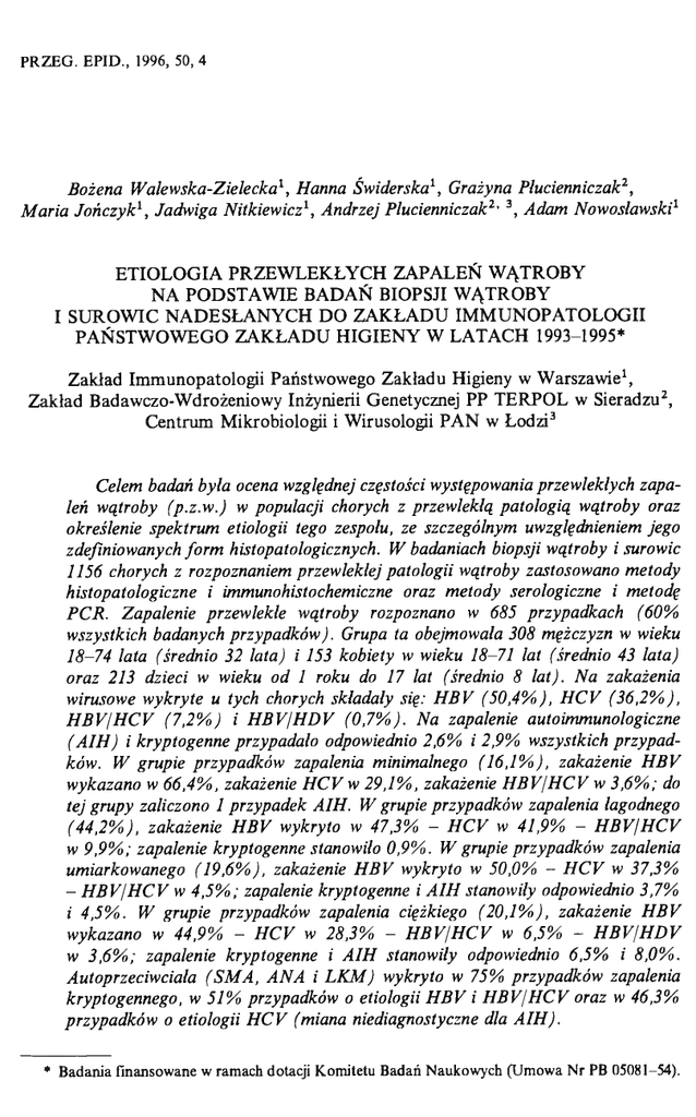 PR ZE G . E PID ., 1996, 50, 4 Bożena Walewska-Zielecka1, Hanna Świderska}, Grażyna Plucienniczak2, Maria Jończyk1, Jadwiga Nitkiewicz1, Andrzej Plucienniczak1, 3, Adam Nowosławski1 ETIOLOGIA PRZEWLEKŁYCH ZAPALEŃ WĄTROBY NA PODSTAWIE BADAŃ BIOPSJI WĄTROBY I SUROWIC NADESŁANYCH DO ZAKŁADU IMMUNOPATOLOGII PAŃSTWOWEGO ZAKŁADU HIGIENY W LATACH 1993-1995* Zakład Immunopatologii Państwowego Zakładu Higieny w Warszawie1, Zakład Badawczo-Wdrożeniowy Inżynierii Genetycznej PP TERPOL w Sieradzu2, Centrum Mikrobiologii i Wirusologii PAN w Łodzi3 Celem badań była ocena względnej częstości występowania przewlekłych zapa leń wątroby (p.z.w.) w populacji chorych z przewlekłą patologią wątroby oraz określenie spektrum etiologii tego zespołu, ze szczególnym uwzględnieniem jego zdefiniowanych form histopatologicznych. W badaniach biopsji wątroby i surowic 1156 chorych z rozpoznaniem przewlekłej patologii wątroby zastosowano metody histopatologiczne i immunohistochemiczne oraz metody serologiczne i metodę PCR. Zapalenie przewlekłe wątroby rozpoznano w 685 przypadkach (60% wszystkich badanych przypadków). Grupa ta obejmowała 308 mężczyzn w wieku 18-74 lata (średnio 32 lata) i 153 kobiety w wieku 18-71 lat (średnio 43 lata) oraz 213 dzieci w wieku od 1 roku do 17 lat (średnio 8 lat). Na zakażenia wirusowe wykryte u tych chorych składały się: H B V (50,4%), H C V (36,2%), H B V /H C V (7,2% ) i HBV/H D V (0,7%). Na zapalenie autoimmunologiczne (A IH ) i kryptogenne przypadało odpowiednio 2,6% i 2,9% wszystkich przypad ków. W grupie przypadków zapalenia minimalnego (16,1%), zakażenie H BV wykazano w 66,4%, zakażenie H C V w 29,1%, zakażenie H BV/H CV w 3,6%; do tej grupy zaliczono 1 przypadek AIH. W grupie przypadków zapalenia łagodnego (44,2%), zakażenie H B V wykryto w 47,3% - H C V w 41,9% - H BV/H CV w 9,9%; zapalenie kryptogenne stanowiło 0,9%. W grupie przypadków zapalenia umiarkowanego (19,6%), zakażenie H B V wykryto w 50,0% - H C V w 37,3% - H B V/H C V w 4,5%; zapalenie kryptogenne i A IH stanowiły odpowiednio 3,7%> i 4,5%. W grupie przypadków zapalenia ciężkiego (20,1%), zakażenie H BV wykazano w 44,9% - H C V w 28,3% - H BV/H CV w 6,5% - H BV/H D V w 3,6%; zapalenie kryptogenne i A IH stanowiły odpowiednio 6,5% i 8,0%. Autoprzeciwciała (S M A, A N A i LK M ) wykryto w 75% przypadków zapalenia kryptogennego, w 51% przypadków o etiologii H B V i H BV/H CV oraz w 46,3% przypadków o etiologii H C V (miana niediagnostyczne dla AIH). * Badania finansowane w ramach dotacji Komitetu Badań Naukowych (Umowa N r PB 05081-54). 354 В. Walewska-Zielecka i inni Nr 4 WSTĘP Przewlekłe zapalenie wątroby (p.z.w.) jest trwającym dłużej niż 6 mies. zespołem zaburzeń czynności wątroby w następstwie zmian martwiczo-zapalnych (16). Zgodnie z tą definicją, rozpoznanie p.z.w. jest uwarunkowane wynikiem badania histopatologicz nego biopsji wątroby, które umożliwia ponadto ocenę stopnia nasilenia procesu zapalnego oraz stadium zaawansowania zmian (6, 13). Ustalenie etiologii p.z.w. jest domeną badań serologicznych oraz badań metodami biologii molekularnej zarówno surowicy, jak i biopsji wątroby (7, 9). Zróżnicowane postaci zapalenia w przebiegu zakażeń HBV, HBV/HDV i HCV oraz zapalenie autoimmunologiczne i polekowe (toksyczne) spełniają kryteria histopatologiczne rozpoznania p.z.w. Przypadki, których nie udaje się odnieść do żadnej z tych etiologii są określane jako zapalenie kryptogenne (6). Przyjmuje się, że przewlekłe zakażenie HBV rozwija się u 5% - 12% osób po przebyciu ostrego wzw typu В (21) i u około 70% osób po przebyciu ostrego wzw typu С (30). Oszacowano, że na świecie żyje obecnie co najmniej 300 min osób zakażonych HBV (8) i około 300 min osób zakażonych HCV (3), a około 5% zakażonych HBV jest jednocześnie zakażonych HDV (24). W badaniach prospektywnych wykazano, że u znacznego odsetka osób zakażonych przewlekle HBV i HCV rozwija się p.z.w. (1, 28). Celem badań retrospektywnych podjętych w tej pracy była ocena względnej częstości występowania p.z.w. w populacji chorych z przewlekłą patologią wątroby oraz określenie spektrum etiologii tego zespołu, ze szczególnym uwzględnieniem jego zdefiniowanych form histopatologicznych. MATERIAŁ I METODY Materiał badany stanowiły biopsje igłowe wątroby i próbki surowic od 1156 cho rych hospitalizowanych w 6 Klinikach AM w Warszawie oraz w 9 szpitalach w W ar szawie i poza Warszawą w okresie od lutego 1993 do grudnia 1995 r. We wszystkich przypadkach rozpoznanie przewlekłej patologii wątroby było uzasadnione wynikami badań klinicznych i biochemicznych. W części przypadków etiologię sugerowały wyniki wstępnych badań serologicznych w kierunku zakażenia HBY i HCV. Biopsje dzielono na dwie części, z których jedną utrwalano w formalinie i zata piano w parafinie, a drugą zamrażano i przechowywano w temp. -40°C. Skrawki parafinowe barwiono hematoksyliną i eozyną, chromotropem 2R i srebrzono met. Gomori. W skrawkach parafinowych i skrawkach z zamrożonych fragmentów biopsji poszukiwano ekspresji antygenów HBV i HDV metodą pośredniej immunofluorescencji lub metodą PAP stosując przeciwciała poliklonalne anty-HBs i anty-HBc (Dako) oraz anty-HDV (20, 22, 29). Zamrożone fragmenty biopsji wykorzystano do badań metodą reakcji łańcuchowej polimerazy (PCR) w kierunku obecności HBV DNA i HCV RNA w przypadkach, w których wyniki badania próbek surowic tymi metodami były wątpliwe lub ujemne. Próbki surowic dzielono na dwie części, z których jedną zamrażano i przecho wywano do badań met. PCR w temp. -40°C, a drugą używano do badań met. immunoenzymatyczną (EIA) w kierunku obecności HBsAg, anty-HBc, HBeAg i anty-HBe (IMx, Abbott) oraz anty-HCV (HCV EIA 3,0, Abbott) i anty-HDV Nr 4 Etiologia przewlekłych zapaleń wątroby 355 (Hepanostica, Organon). W nielicznych przypadkach (histopatologiczn