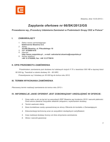 Skawina, dnia 13.03.2012 r. Zapytanie ofertowe nr 66/SK/2012/GS Prowadzone wg „Procedury Udzielania Zamówień w Podmiotach Grupy CEZ w Polsce” I. ZAMAWIAJĄCY 1. Pełna nazwa zamawiającego: Elektrownia Skawina S.A. 2. Adres: 32-050 Skawina, ul. Piłsudskiego 10 3. NIP: 6750001478 4. Internet: http://www.cezpolska.pl ., e-mail: [email protected] 5. Numer telefonu: +48 12 2762000, fax: +48 12 2778618 II. OPIS PRZEDMIOTU ZAMÓWIENIA Przedmiotem zamówienia jest dostawa kul stalowych kutych fi 70 o twardości 500 HB w łącznej ilości 90 000 kg. Twardość w stanie dostawy 54 – 60 HRC. Przewidywane są 3 dostawy po 30 000 kg do końca roku 2012. III. TERMIN WYKONANIA ZAMÓWIENIA Planowany termin realizacji zamówienia do końca roku 2012 r. IV. INFORMACJE JAKIE OFERENT JEST ZOBOWIĄZANY UWZGLĘDNIĆ W OFERCIE: 1. Cenę netto w pln za kg kul na warunkach DDP Skawina wg Incoterms 2010 i warunki płatności. Cena winna zawierać wszystkie składniki związane z wykonaniem dostawy. 2. Termin ważności oferty. 3. Dane kontaktowe osoby upoważnionej ze strony Oferenta do kontaktu z Zamawiającym. 4. Dokumentację techniczną wraz ze wszystkimi niezbędnymi certyfikatami. 5. Czas realizacji dostawy liczony od dnia otrzymania zamówienia. 6. Okres i warunki gwarancji. 1 7. Aktualny odpis z właściwego rejestru albo aktualne zaświadczenie o wpisie do ewidencji działalności gospodarczej, wystawiony nie wcześniej niż 6 miesięcy przed upływem terminu składania ofert. V. SZCZEGÓLNE WYMAGANIA W STOSUNKU DO WYKONAWSTWA: 1. Oświadczenie akceptujące postanowienia Ogólnych Warunków Realizacji Zamówień stanowiące załącznik nr 1 do niniejszego zapytania. 2. Akceptacja terminu płatności wynoszącego 30 dni liczonych od daty otrzymania faktury przez Zamawiającego. VI. MIEJSCE ORAZ TERMIN SKŁADANIA OFERT 1. Oferta powinna być przesłana za pośrednictwem: poczty, kuriera lub też dostarczona osobiście na adres: CEZ Polska sp. z o.o., Centrum Usług Wspólnych, ul. Piłsudskiego 10, 32-050 Skawina, na nazwisko: Grażyna Seweryn, z dopiskiem: „Oferta na kule” do godz. 12.00, do dnia 20 marca 2012 roku. VII. SPOSÓB UDZIELANIA WYJAŚNIEŃ DOTYCZĄCYCH ZAPYTANIA OFERTOWEGO: 1. Każdy oferent ma prawo zwrócić się do zamawiającego o wyjaśnienie treści warunków zapytania ofertowego w terminie nie późniejszym niż 2 dni przed terminem składania ofert. 2. Korespondencja w toku procesu wyboru dostawcy, w tym pytania oferentów mogą mieć formę emailową. VIII. PRACOWNICY ZAMAWIAJĄCEGO UPRAWNIENI DO BEZPOSREDNIEGO KONTAKTOWANIA SIĘ Z OFERENTAMI: Sprawy merytoryczne: Imię i nazwisko: Zbigniew Hachlowski Stanowisko służbowe: Starszy specjalista ds. Produkcji Numer telefonu: +48 12 277 85 11 E-mail: [email protected] Imię i nazwisko: Józef Kozioł Stanowisko służbowe: Główny Specjalista ds Produkcji Numer telefonu: +48 12 277 87 50 E-mail: [email protected] 2 Sprawy handlowe: Imię i nazwisko: Grażyna Seweryn Stanowisko służbowe: Specjalista ds. Kontraktów i Przetargów Numer telefonu: +48 12 277 8295 E-mail: [email protected] Osoba na stanowisku Specjalista ds. Kontraktów o Przetargów posiada umocowanie do samodzielnej reprezentacji ZAMAWIAJĄCEGO i składania oświadczeń woli wymaganych trybem procedury zakupowej. IX. ŚRODKI ODWOŁAWCZE: 1. Oferentom nie przysługuje prawo uczestnictwa w otwarciu ofert. 2. W postępowaniu oferentom nie przysługują żadne środki odwoławcze. X. POSTAWNOWIENIA KOŃCOWE: 1. O wyborze najkorzystniejszej oferty Zamawiający zawiadomi oferentów za pośrednictwem poczty elektronicznej (e-mail). 2. Drugi etap postępowania może zostać przeprowadzony za pomocą aukcji elektronicznej. Regulamin przeprowadzania aukcji oraz instrukcja obsługi znajduje się na stronie internetowej pod adresem: http://www.cezpolska.pl/pl/dla-dostavcow/pozostale-postepowania/aukcjeelektroniczne.html 3. Zamawiający zastrzega sobie prawo do odstąpienia bez podania przyczyny od wyboru oferty (ofert) i powierzenia komukolwiek wykonania prac objętych niniejszym zapytaniem bez prawa oferentów do dochodzenia od Zamawiającego roszczeń z odszkodowawczych. 4. Zamawiający zastrzega sobie prawo do negocjowania warunków z kilkoma dostawcami jednocześnie. 5. Oferent może przed upływem terminu składania ofert zmienić lub wycofać swoją ofertę. 6. W toku badania i oceny ofert Zamawiający może żądać od oferentów wyjaśnień dotyczących treści złożonych ofert. 7. Koszty przygotowania oferty ponosi Oferent. 3 8. Zamawiający, ma prawo swobodnego wyboru oferty, może przeprowadzić dodatkowe negocjacje z wybranymi oferentami, a także unieważnić postępowanie bez podania przyczyny. 9. Niniejsze zapytanie, stanowi zaproszenie dla Dostawców do wzięcia udziału w procesie składania 3 ofert w rozumieniu art. 70 § 1 k.c., mające na celu dostarczenie konkretnego produktu lub usługi. XIV. ZAŁĄCZNIKI Załącznik nr 1-Ogólne Warunki Realizacji Zamówień 4