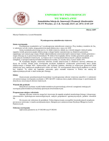 UNIWERSYTET PRZYRODNICZY WE WROCŁAWIU Samodzielna Sekcja ds. Innowacji i Promocji Absolwentów 50-375 Wrocław, ul. C.K. Norwida 25/27, tel. (071) 32 05 219 Oferta 14/07 Maciej Charkiewicz, Leszek Romański Wysokosprawna minisiłownia wiatrowa Istota rozwiązania Przedmiotem wynalazków są 2 wysokosprawne minisiłownie wiatrowe. Przy średnicy wirników do 2m, w zależności od siły wiatru, mogą generować prąd elektryczny o mocy do 1kW. Istotą wynalazku pierwszego jest to, że silnik wiatrowy składa się z dwóch śmigieł z których jedno napędza wirnik generatora prądu elektrycznego a drugie będzie zamontowane na obudowie generatora napędzając tym samym jego stojan. Dzięki odpowiedniemu ustawieniu kątów natarcia łopat, wirnik generatora i stojan obracają się w przeciwnych kierunkach. W efekcie bezwzględne obroty wirnika generatora prądu, przy tych samych warunkach wiatrowych, są większe niż w rozwiązaniach klasycznych z jednym wirnikiem (śmigłem). Z przeprowadzonych badań modelowych wynika, że zwyżka mocy wynosi około 25%. W wynalazku drugim, omawiana siłownia została umieszczona w obudowie rurowej (zbliżonej do dyszy de Lavala). Dzięki temu rozwiązaniu uzyskano dodatkowe zwiększenie generowanej mocy prądu elektrycznego o kolejne 40%. Jednocześnie, jak wykazały badania, siłownia ta rozpoczyna generować prąd elektryczny przy mniejszych prędkościach wiatru niż 6m/s. W rozwiązaniach klasycznych prędkości te muszą być większe. Ta zaleta ma kapitalne znaczenie, gdyż warunki wiatrowe w Polsce nie należą do najkorzystniejszych tak w skali świata jak i Europy. Efekty Zastosowanie przedstawionych konstrukcji wysokosprawnej siłowni wiatrowej umożliwi w zależności od zastosowanego rozwiązania uzyskanie o 40% lub 65% większej mocy prądu elektrycznego w porównaniu do dotychczas stosowanych siłowni wiatrowych. Wnioski dla praktyki Dotychczas uzyskane wyniki badań modelowych potwierdzają celowość zastąpienia istniejących rozwiązań jednowirnikowych bardziej sprawnymi dwuwirnikowymi. Proponowane miejsce wdrożenia Opisane siłownie wiatrowe mogą być stosowane do napędu urządzeń monitoringu leśnego i drogowego, obserwatoriów hydrologiczno-meteorologicznych, małych gospodarstw agroturystycznych, jachtów morskich itp. Do tej pory nie wdrożono do produkcji. Celem dopracowania szczegółów konstrukcyjnych urządzenie jest jeszcze testowane w tunelu aerodynamicznym. Zakupem jest zainteresowana Dyrekcja Okręgowa Lasów Państwowych. Ochrona rozwiązania Zgłoszenia patentowe nr: P-382100 oraz P-382101