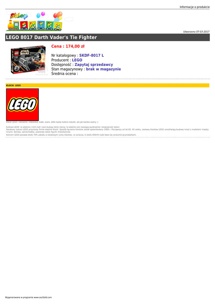 Informacje o produkcie Utworzono 07-03-2017 LEGO 8017 Darth Vader's Tie Fighter Cena : 174,00 zł Nr katalogowy : SKDF-8017 L Producent : LEGO Dostępność : Zapytaj sprzedawcy Stan magazynowy : brak w magazynie Średnia ocena : KLOCKI LEGO Klocki LEGO czerwone, niebieskie, białe, szare, żółte każdy koleck malutki, ale jak bardzo ważny :) Kultowe LEGO to właśnie z nich mali i duzi budują różne rzeczy, to właśnie one rozwijają wyobraźnię i kreatywność dzieci. Światowy sukces LEGO przyniosły firmie właśnie klocki. Sposób łączenia klocków został opatentowany 1958 r. Począwszy od lat 60. XX wieku, zestawy klocków LEGO umożliwiają budowę miast z modelami między innymi: domów, samochodów, zawierały także figurki mieszkańców. Koncern LEGO posiada około 70% udziału w światowym rynku klocków, co oznacza, iż około 400mln ludzi bawi się corocznie jej produktami. Wygenerowano w programie www.oscGold.com