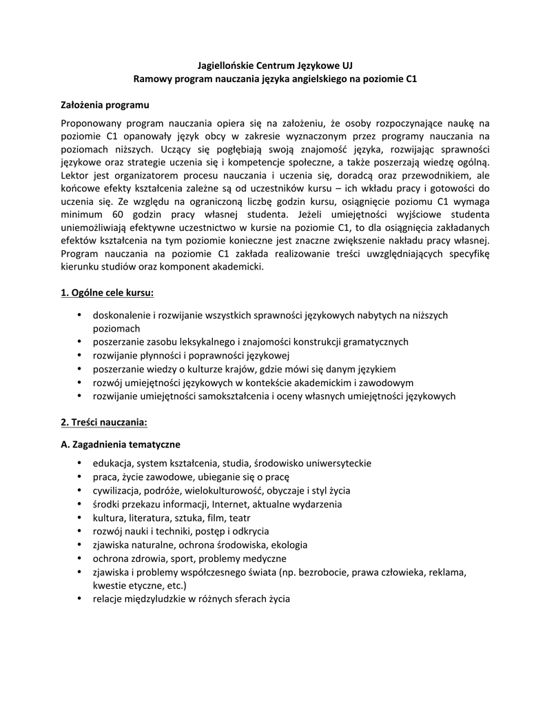 Jagiellońskie Centrum Językowe UJ Ramowy program nauczania języka angielskiego na poziomie C1 Założenia programu Proponowany program nauczania opiera się na założeniu, że osoby rozpoczynające naukę na poziomie C1 opanowały język obcy w zakresie wyznaczonym przez programy nauczania na poziomach niższych. Uczący się pogłębiają swoją znajomość języka, rozwijając sprawności językowe oraz strategie uczenia się i kompetencje społeczne, a także poszerzają wiedzę ogólną. Lektor jest organizatorem procesu nauczania i uczenia się, doradcą oraz przewodnikiem, ale końcowe efekty kształcenia zależne są od uczestników kursu – ich wkładu pracy i gotowości do uczenia się. Ze względu na ograniczoną liczbę godzin kursu, osiągnięcie poziomu C1 wymaga minimum 60 godzin pracy własnej studenta. Jeżeli umiejętności wyjściowe studenta uniemożliwiają efektywne uczestnictwo w kursie na poziomie C1, to dla osiągnięcia zakładanych efektów kształcenia na tym poziomie konieczne jest znaczne zwiększenie nakładu pracy własnej. Program nauczania na poziomie C1 zakłada realizowanie treści uwzględniających specyfikę kierunku studiów oraz komponent akademicki. 1. Ogólne cele kursu: • • • • • • doskonalenie i rozwijanie wszystkich sprawności językowych nabytych na niższych poziomach poszerzanie zasobu leksykalnego i znajomości konstrukcji gramatycznych rozwijanie płynności i poprawności językowej poszerzanie wiedzy o kulturze krajów, gdzie mówi się danym językiem rozwój umiejętności językowych w kontekście akademickim i zawodowym rozwijanie umiejętności samokształcenia i oceny własnych umiejętności językowych 2. Treści nauczania: A. Zagadnienia tematyczne • • • • • • • • • • edukacja, system kształcenia, studia, środowisko uniwersyteckie praca, życie zawodowe, ubieganie się o pracę cywilizacja, podróże, wielokulturowość, obyczaje i styl życia środki przekazu informacji, Internet, aktualne wydarzenia kultura, literatura, sztuka, film, teatr rozwój nauki i techniki, postęp i odkrycia zjawiska naturalne, ochrona środowiska, ekologia ochrona zdrowia, sport, problemy medyczne zjawiska i problemy współczesnego świata (np. bezrobocie, prawa człowieka, reklama, kwestie etyczne, etc.) relacje międzyludzkie w różnych sferach życia B. Zagadnienia gramatyczno-‐leksykalne • • • • • • • • • • • • • • • • • • • • • • • czasyFuture Perfect i Continuous oraz wyrażenia opisujące przyszłość: be about to, be due to, be bound/ sure to, be on the point/ verge of, be (un)likely to, itp. Czasy Past Simple, Past Perfect, Past Perfect Continuous, Past Continuous, used to/would w opowiadaniu zdania podrzędne (względne, określające, okolicznikowe) zaimki względne (who, which, that, whose, etc.) i pomijanie ich wszystkie formy strony biernej czasowniki modalne w teraźniejszości, przyszłości i przeszłości mowa zależna z wyrażeniami np. It’s said to be formy czasownikowe (‘to infinitive., gerund, perfect infinitive) ze zmianą znaczenia formy imiesłowu: present participle, past participle, to-‐infinitive zdania warunkowe, tryby mieszane, pomijanie if, formy zastępcze do if wyrażenia typu wish, if only, as if, it’s high time, would rather/sooner wyrażenie emfatyczne: It is ... that ..., What is ...,The thing that ..., The reason why ... , the place where ... wyrażenia emfatyczne ze słowami przeczącymi, inwersja po wyrażeniach: No sooner ... than, Seldom, Rarely, Little, Barely, Never before, Not (even) once, On no account, Only by, Only in this way, Only then, Hardly (ever) ... when, Not only … but also, Not until, In no way, Under no circumstances przymiotniki mocne i słabe, stopniowanie i intensyfikacja przymiotnika czasowniki złożone (phrasal verbs) rozdzielne i nierozdzielne budowa słowotwórcza czasownika z uwzględnieniem stosowania przedrostków do tworzenia form o znaczeniu przeciwnym – przedrostki un-‐, dis-‐, over-‐, mis-‐, under-‐ – przyrostki -‐ify, -‐en, -‐ise budowa słowotwórcza rzeczownika z uwzględnieniem stosowania przedrostków do tworzenia form o znaczeniu przeciwnym – przedrostki un-‐, dis-‐, in-‐, im-‐, ir-‐, re-‐, ex-‐, mis-‐, under-‐, over-‐ – przyrostki -‐ment, -‐ation, -‐ion, -‐al, -‐ness, -‐ity, -‐ence, -‐ance, -‐ce, -‐y, -‐ship, -‐hood budowa słowotwórcza przymiotnika z uwzględnieniem stosowania przedrostków do tworzenia form o znaczeniu przeciwnym – przedrostki un-‐, dis-‐, in-‐, im-‐, ir-‐, re-‐, ex-‐, mis-‐, under-‐, over-‐ – przyrostki -‐ful, -‐less, -‐able, -‐ible budowa słowotwórcza przysłówka z uwzględnieniem stosowania przedrostków do tworzenia form o znaczeniu przeciwnym łączniki (markers) umożliwiające porządkowanie i sygnalizowanie (signposting) kolejnych części wypowiedzi pisemnej i ustnej zarówno formalnej i nieformalnej np. as a result, therefore, consequently / as a consequence, so, so / such ... that, but, although / even, though, in spite of / despite, however, while / whereas, yet / still, nevertheless, on the other hand kolokacje idiomy rozróżnienie stylu formalnego i nieformalnego • zasady interpunkcji C. Funkcje językowe • precyzyjne wyrażanie opinii i uczuć, np. I couldn’t care less whether... or not. This is something I feel quite strongly about. • wyrażanie pewności, prawdopodobieństwa i wątpliwości, np. It’s highly likely that… Surely, you don’t think it was my fault? • wyrażanie przypuszczeń i przekonania na temat przyczyn i skutków, np. Supposing he had misses his train? What if she hadn’t even tried? • wyrażenie opinii w sposób nie wprost, wymijający (hedging), np. Am I right to think you’re responsible? I ‘m just not so sure, it could be okay. I assume you’ll be going home for Christmas. Am I right to thin