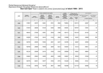Wydział Statystycznej Informacji Zarządczej Departament Strategii i Deregulacji Ministerstwa Sprawiedliwości Stan kart Opm */(stan w ostatnim dniu okresu sprawozdawczego) w latach 1989 – 2013 Liczba małoletnich pod opieką Lata 0 Ogółem (rubr. 2+6) 1 ogółem (rubr. 3 do 5) których rodziców pozbawiono władzy rodzicielskiej których rodzicom zawieszono władzę rodzicielską sieroty naturalne 2 3 4 5 Liczba małoletnich, których rodzicom ograniczono władzę rodzicielską zawodowego społecznego 6 7 8 W tym (rubr. 6) przez stałą kontrolę kuratora sądowego Liczba małoletnich wobec których zarządzono umieszczenie którzy oczekują na umieszczenie w rodzinie zastępczej 9 10 1989 178557 29574 16991 6781 5802 148983 • 109115 32087 247 1990 174519 28258 16100 6350 5808 146261 • 106757 31881 61 1991 166432 27259 15951 5539 5769 139173 • 100134 32130 62 1992 162990 27002 15910 5148 5944 135988 • 94291 32968 552 1993 160750 26255 14943 5091 6221 134495 • 92007 34565 44 1994 159795 25698 14636 4848 6214 134097 • 91014 34801 214 1995 162134 25298 14374 4794 6130 136836 • 94081 36894 42 1996 164800 25953 14650 4800 6498 138847 • 96520 37839 47 1997 169776 26451 14977 4702 6772 143325 • 99983 37341 47 1998 172183 26784 15279 4651 6854 145399 • 101718 38496 74 Wydział Statystycznej Informacji Zarządczej Departament Strategii i Deregulacji Ministerstwa Sprawiedliwości Stan kart Opm */ (stan w ostatnim dniu okresu sprawozdawczego) w latach 1989 – 2013 dok. Liczba małoletnich pod opieką Lata 0 Ogółem (rubr. 2+6) 1 ogółem (rubr. 3 do 5) których rodziców pozbawiono władzy rodzicielskiej których rodzicom zawieszono władzę rodzicielską sieroty naturalne 2 3 4 5 Liczba małoletnich, których rodzicom ograniczono władzę rodzicielską zawodowego społecznego 6 7 8 W tym (rubr. 6) przez stałą kontrolę kuratora sądowego Liczba małoletnich wobec których zarządzono umieszczenie którzy oczekują na umieszczenie w rodzinie zastępczej 9 10 1999 172880 26867 15636 4405 6826 146013 42614 56688 40434 43 2000 171729 27222 16104 4264 6854 144507 42624 60937 40650 73 2001 177994 27868 16511 4500 6857 150126 45142 63478 41925 43 2002 165777 26105 15682 4360 6063 139672 38291 59343 39683 50 2003 163231 25272 15546 3972 5754 137959 37921 60742 40197 39 2004 173784 25626 16054 4044 5528 148158 37301 67830 41754 157 2005 182182 25930 16603 3927 5400 156245 36136 76805 42855 257 2006 189234 25450 16965 3687 4798 163775 37724 83627 43785 296 2007 201257 25817 17492 3625 4700 175425 38928 90614 44412 596 2008 201663 25877 18103 3366 4408 175765 40006 92104 45150 372 2009 210350 26961 19239 3456 4266 183389 41017 96664 45907 95 */ liczba małoletnich objętych na podstawie prawomocnego orzeczenia sądu opieką, kuratelą lub nadzorem wynikającym z ograniczenia władzy rodzicielskiej. Wydział Statystycznej Informacji Zarządczej Departament Strategii i Deregulacji Ministerstwa Sprawiedliwości Stan kart Opm */ (stan w ostatnim dniu okresu sprawozdawczego) w latach 1989 – 2013 dok. Liczba małoletnich pod opieką Lata 0 Ogółem (rubr. 2+6) 1 ogółem (rubr. 3 do 5) których rodziców pozbawiono władzy rodzicielskiej których rodzicom zawieszono władzę rodzicielską sieroty naturalne 2 3 4 5 Liczba małoletnich, których rodzicom ograniczono władzę rodzicielską zawodowego społecznego 6 7 8 W tym (rubr. 6) przez stałą kontrolę kuratora sądowego Liczba małoletnich wobec których zarządzono umieszczenie którzy oczekują na umieszczenie w rodzinie zastępczej 9 10 2010 210515 27669 20198 3416 4055 182846 39023 96294 46145 172 2011 211653 27598 20783 3022 3793 184055 39961 94960 46197 198 2012 208319 27902 21522 2917 3463 180417 40590 91195 45946 136 2013 210474 28977 23063 2678 3236 181497 41348 92592 44379 332 */ liczba małoletnich objętych na podstawie prawomocnego orzeczenia sądu opieką, kuratelą lub nadzorem wynikającym z ograniczenia władzy rodzicielskiej. opracowanie: /-/ Joanna Kasprzak St. specjalista /-/ Karolina Orowiecka specjalista Naczelnik Wydziału Statystycznej Informacji Zarządczej /-/ Justyna Kowalczyk
