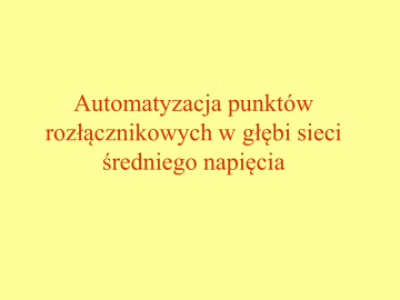 Automatyzacja punktów rozłącznikowych w głębi sieci średniego napięcia Rodzaje automatyzacji 1. Automatyzacja wykorzystująca przekładniki prądowe oraz zabezpieczenia 2. Automatyzacja bez wykorzystania przekładników prądowych i zabezpieczeń Automatyzacja wykorzystująca przekładniki prądowe oraz zabezpieczenia t GPZ t GPZ Odgałęzienia sieci eliminowane w drugim cykluSPZ Sekcje sieci eliminowane w trzecim cyklu SPZ Fragment toru zasilającego eliminowany w czwartym cyklu SPZ Fragment toru zasilającego eliminowany w piątym cyklu SPZ GPZ Eliminacja uszkodzonego odgałęzienia sieci t GPZ 1 w t GPZ 2 w z t GPZ 3 w z w t GPZ 4 w z w t GPZ 5 w z w z t GPZ Eliminacja uszkodzonej sekcji sieci t GPZ t GPZ 1 w t GPZ 2 w z t GPZ 3 w z w t GPZ 4 w z w z t GPZ 5 w z w z w t GPZ 6 w z w z w t GPZ 7 w z w z w z t GPZ Odgałęzienia sieci eliminowane w drugim cykluSPZ Sekcje sieci eliminowane w trzecim cyklu SPZ Fragment toru zasilającego eliminowany w czwartym cyklu SPZ Fragment toru zasilającego eliminowany w piątym cyklu SPZ GPZ Właściwości automatyzacji z wykorzystaniem zabezpieczeń Zalety 1. Mała liczba operacji łączeniowych rozłącznikami, 2.Rozłączniki pracują bezprądowo, 3. Szybka eliminacja zwarć w odgałęzieniach i sekcjach sieci, 4. Cykl automatycznego lokalizowania uszkodzonego odcinka nie angażuje łączności radiowej, Wady 1. Przy dużej liczbie rozłączników pracujących w kaskadzie zwiększa się nadmiernie liczba potrzebnych cykli SPZ. Automatyzacja bez wykorzystania przekładników prądowych i zabezpieczeń Zasada działania 1. Rozłącznik otwiera się po czasie około 2 s od momentu zaniku napięcia, warunek ten jest spełniony np. w drugiej przerwie SPS-tu, 2. Rozłącznik otrzymuje sygnał załącz, jeśli pojawi się od strony zasilania napięcie i nie zaniknie przez dostatecznie długi czas. t GPZ t GPZ 1 w t GPZ 2 w z t GPZ 3 w z w t GPZ 4 w z w t GPZ 5 w z w t GPZ 6 w z w t GPZ 7 w z w t GPZ 8 w z w t GPZ 9 w z w t GPZ 10 w z w t GPZ 11 w z w t GPZ 12 w z w t GPZ 13 w z w t GPZ 14 w z w t GPZ 15 w z w z t GPZ 16 w z w z w t GPZ 17 w z w z w t GPZ 18 w z w z w t GPZ w z w z w t GPZ Teraz cały cykl sekwencyjnego załączania rozłączników powtarza się, rozłącznik, który spowodował zwarcie jest zablokowany. Proces łączeniowy zostanie zakończony po 27 cyklach łączeniowych Właściwości automatyki nie korzystającej z zabezpieczeń zalety 1. Działa sprawnie przy dużej liczbie połączonych kaskadowo rozłączników, wady 1. Dokonuje bardzo wielu operacji łączeniowych rozłącznikami 2. Łączniki muszą być przygotowane do załączania prądów zwarciowych 3. Przy łączeniach manewrowych powoduje rozłączanie i ponowne złączanie się sieci, może temu zapobiec tylko sprawna łączność, 4. Czas eliminowania uszkodzonego odcinka sieci jest dłuższy niż w metodzie poprzedniej. Proponowane zasady współdziałania obu automatyk 1.Odgałęzienia sieci wyłączane będą w drugiej przerwie SPZ, tak jak w metodzie pierwszej, 2. W trzeciej przerwie SPZ-tu otworzą się tylko łączniki, które zarejestrowały przepływ prądu zwarciowego 3. Po załączeniu wyłącznika w GPZ-cie nastąpi kaskadowe zamykanie się łączników t GPZ 1 w t GPZ 2 w z t GPZ 3 w z w t GPZ 4 w z w z t GPZ 5 w z w z w t GPZ 6 w z w z w t GPZ 7 w z w z w z t GPZ 8 w z w z w z t GPZ 9 w z w z w z t GPZ 10 w z w z w z t GPZ 11 w z w z w z w t GPZ 12 w z w z w z w t GPZ 13 w z w z w z w z t GPZ 14 w z w z w z w z t GPZ 15 w z w z w z w z t GPZ PRZEKŁADNIK PRĄDOWY Opis zabezpieczenia 1. Zabezpieczenie wykonane w technice mikroprocesorowej pełni funkcje zabezpieczeniowe i sterownicze, 2. Zabezpieczenie ziemnozwarciowe zrealizowane jako nadprądowe, jast zasilane z układu Holmgreena, 3. Przewidziana została możliwość zdalnego blokowania funkcji wyłączeniowych zabezpieczeń lub przełączania banku nastaw, 4. W miejsce klasycznego łącza z komputerem typu RS zastosowano łącze radiowe Dodatkowe korzyści wynikające ze stosowania przekładników prądowych 1. Pomiary prądów dostępne są lokalnie i zdalnie, 2. Istnieje możliwość wyliczania skumulowanego prądu wyłączanego przez rozłącznik 3. Istnieje możliwość realizacji wykresów obciążenia tygodniowego lub miesięcznego, 4. Realizowane są zabezpieczenia od asymetrii obciążenia, które mogą wykryć przerwy w fazach. WNIOSKI 1. W ramach dwukrotnego cyklu SPZ można automatycznie eliminować tylko odgałęzienia sieci (końcowe odcinki) 2. W ramach trzykrotnego SPZ-tu można: przy zastosowaniu techniki wykorzystującej zabezpieczenia, automatycznie eliminować uszkodzone odgałęzienia i sekcje sieci przy zastosowaniu automatyki bez zabezpieczeń eliminować dowolne fragmenty sieci, 3. Zwiększając dalej liczbę cykli SPZ-tu można bardzo efektywnie eliminować uszkodzony odcinek nawet w bardzo rozbudowanych sieciach