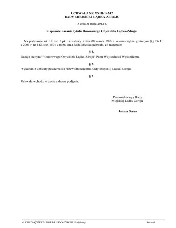 UCHWAŁA NR XXIII/142/12 RADY MIEJSKIEJ LĄDKA-ZDROJU z dnia 31 maja 2012 r. w sprawie nadania tytułu Honorowego Obywatela Lądka-Zdroju Na podstawie art. 18 ust. 2 pkt 14 ustawy z dnia 08 marca 1990 r. o samorządzie gminnym (t.j. Dz.U. z 2001 r. nr 142, poz. 1591 z późn. zm.) Rada Miejska uchwala, co następuje: § 1. Nadaje się tytuł "Honorowego Obywatela Lądka-Zdroju" Panu Wojciechowi Wysockiemu. § 2. Wykonanie uchwały powierza się Przewodniczącemu Rady Miejskiej Lądka-Zdroju. § 3. Uchwała wchodzi w życie z dniem podjęcia. Przewodniczący Rady Miejskiej Lądka-Zdroju Janusz Sosna —————————————————————————————————————————————————————— Id: ZZHJY-QXWXP-LRORJ-RHRNX-ZPWBR. Podpisany Strona 1 Uzasadnienie do Uchwały Nr XXIII/142/12 Rady Miejskiej Lądka-Zdroju z dnia 31 maja 2012 r. Ukończył warszawską PWST w 1976 roku.Związany był z Teatrem Współczesnym ..Zadebiutował w roli Krzysztofa w 1975 roku na szklanym ekranie w telefilmie "Dom moich snów"Gerarda Zalewskiego.Stworzył niezapomnianą kreację egoistycznego młodego pianisty Grzegorza,który mając do wyboru karierę czy opiekę nad chorą Ewą(w tej roli Małgorzata Snopkiewicz) wybiera to pierwsze w melodramacie "Con... amore"(1976)Jana Batorego.W serialu TV "Punkt widzenia"(1980)Janusza Zaorskiego zagrał Sewera. WAŻNIEJSZE FILMY: "Ekstradycja" (1995) TV Serial jako Szawlowski, Nic śmiesznego (1995), "Stella Stellaris"(miniserial TV,1994), 'La'Belle de Varsovie (TV,1993), Polski Crash (1993)jako Daniel Bury , Straszny sen Dzidziusia Gorkiewicza (1993) ' Zwolnieni z zycia (1992) jako Janek, Déjà vu (1988) , Do domu (TV,1988), Życie wewnetrzne (1987), Jezioro Bodenskie (1986) , Pismak (1985) , Wierna rzeka (1983) , W biały dzień (1981) , Wyrok śmierci (1980) , Bez znieczulenia (1979) , Dyrygent (1979) jako muzyk Kwiatkowski.Od dzieciństwa związany z Ladkiem -Zdrojem.Tu mieszkała Jego babcia a obecnie brat.W swoich wystąpieniach publicznych ,wywiadach wielokrotnie podkreślał swoje związki z Ziemią Lądecką podkresląjąc urok tych terenów ,walory klimatyczne.W 2011 roku Gość Honorowy Lądeckiego Kina Pod Pręgierzem.Duże zainteresowanie mieszkańców i gości pozwoliło na przekształcenie imprezyw coroczny cykl filmowy pod osobistym patronatem Pana WYSOCKIEGO.. Przewodniczący Kapituły Honorowego Obywatela Lądka-Zdroju Janusz Sosna —————————————————————————————————————————————————————— Id: ZZHJY-QXWXP-LRORJ-RHRNX-ZPWBR. Podpisany Strona 1