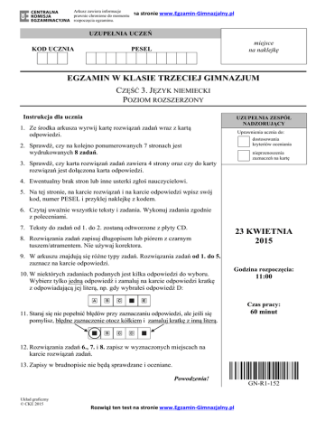 Arkusz zawiera informacje Rozwiąż ten test na prawnie chronione do momentu rozpoczęcia egzaminu. stronie www.Egzamin-Gimnazjalny.pl UZUPEŁNIA UCZEŃ KOD UCZNIA miejsce na naklejkę PESEL EGZAMIN W KLASIE TRZECIEJ GIMNAZJUM CZĘŚĆ 3. JĘZYK NIEMIECKI POZIOM ROZSZERZONY Instrukcja dla ucznia UZUPEŁNIA ZESPÓŁ NADZORUJĄCY 1. Ze środka arkusza wyrwij kartę rozwiązań zadań wraz z kartą odpowiedzi. Uprawnienia ucznia do: dostosowania kryteriów oceniania 2. Sprawdź, czy na kolejno ponumerowanych 7 stronach jest wydrukowanych 8 zadań. nieprzenoszenia zaznaczeń na kartę 3. Sprawdź, czy karta rozwiązań zadań zawiera 4 strony oraz czy do karty rozwiązań jest dołączona karta odpowiedzi. 4. Ewentualny brak stron lub inne usterki zgłoś nauczycielowi. 5. Na tej stronie, na karcie rozwiązań i na karcie odpowiedzi wpisz swój kod, numer PESEL i przyklej naklejkę z kodem. 6. Czytaj uważnie wszystkie teksty i zadania. Wykonuj zadania zgodnie z poleceniami. 7. Teksty do zadań od 1. do 2. zostaną odtworzone z płyty CD. 23 KWIETNIA 2015 8. Rozwiązania zadań zapisuj długopisem lub piórem z czarnym tuszem/atramentem. Nie używaj korektora. 9. W arkuszu znajdują się różne typy zadań. Rozwiązania zadań od 1. do 5. zaznacz na karcie odpowiedzi. 10. W niektórych zadaniach podanych jest kilka odpowiedzi do wyboru. Wybierz tylko jedną odpowiedź i zamaluj na karcie odpowiedzi kratkę z odpowiadającą jej literą, np. gdy wybrałeś odpowiedź D: Godzina rozpoczęcia: 11:00 Czas pracy: 11. Staraj się nie popełnić błędów przy zaznaczaniu odpowiedzi, ale jeśli się pomylisz, błędne zaznaczenie otocz kółkiem i zamaluj kratkę z inną literą. 60 minut 12. Rozwiązania zadań 6., 7. i 8. zapisz w wyznaczonych miejscach na karcie rozwiązań zadań. 13. Zapisy w brudnopisie nie będą sprawdzane i oceniane. Powodzenia! Układ graficzny © CKE 2015 Rozwiąż ten test na stronie www.Egzamin-Gimnazjalny.pl GN-R1-152 Rozwiąż ten test na stronie www.Egzamin-Gimnazjalny.pl Zadanie 1. (0–6) Usłyszysz dwukrotnie dwa teksty. Na podstawie informacji zawartych w nagraniu w zadaniach 1.1.–1.6. z podanych odpowiedzi wybierz właściwą. Zakreśl literę A, B albo C. Zadania 1.1.–1.3. odnoszą się do pierwszego tekstu, a zadania 1.4.–1.6. do drugiego. Tekst 1. Usłyszysz rozmowę dwóch osób. 1.1. Was hat der Junge in der Stadt gekauft? А. Ein Geschenk. В. Eine Geburtstagskarte. С. Etwas für das Abendessen. 1.2. Was für ein Geschenk bekommt die Oma? А. Ein Kleidungsstück. В. Einen Kuchen. С. Ein Buch. 1.3. Wo sprechen Mutter und Sohn? А. Im Garten. В. In der Küche. С. Im Lebensmittelgeschäft. Tekst 2. Usłyszysz informację radiową. 1.4. Wer hat die Maschine konstruiert? А. Gymnasiasten. В. Ingenieure. С. Studenten. 1.5. Was macht die Maschine? А. Sie macht Marmeladenbrote. В. Sie macht heißen Kakao. С. Sie macht Obstsalat. 1.6. Der Reporter möchte А. zur technischen Ausstellung einladen. В. das neue Gerät präsentieren. С. die Maschine kritisieren. Strona 2 z 7 Rozwiąż ten test na stronie www.Egzamin-Gimnazjalny.pl GN-R1 Rozwiąż ten test na stronie www.Egzamin-Gimnazjalny.pl Zadanie 2. (0–4) Usłyszysz dwukrotnie cztery wypowiedzi nastolatków na temat mody. Na podstawie informacji zawartych w nagraniu dopasuj do każdej wypowiedzi (2.1.–2.4.) odpowiadające jej zdanie (A–E). Wpisz rozwiązania do tabeli. Uwaga! Jedno zdanie zostało podane dodatkowo i nie pasuje do żadnej wypowiedzi. A. Im Schrank habe ich ein paar Markenklamotten. B. Manchmal gebe ich die gekaufte Kleidung zurück. C. In der Schule trage ich eine Jeansjacke. D. Bei guter Laune ziehe ich mich gern bunt an. E. Ich will nicht so aussehen wie die anderen Jugendlichen. 2.1. 2.2. 2.3. 2.4. PRZENIEŚ ROZWIĄZANIA ZADAŃ 1. ORAZ 2. NA KARTĘ ODPOWIEDZI! GN-R1 Strona 3 z 7 Rozwiąż ten test na stronie www.Egzamin-Gimnazjalny.pl Rozwiąż ten test na stronie www.Egzamin-Gimnazjalny.pl Zadanie 3. (0–3) Przeczytaj tekst. Do każdego akapitu (3.1.–3.3.) dopasuj właściwy nagłówek (A–E). Wpisz odpowiednią literę obok numeru każdego akapitu. Uwaga! Dwa nagłówki zostały podane dodatkowo i nie pasują do żadnego akapitu. A. Die populärsten Sachen beim Online-Shopping B. Risiko bei Online-Einkäufen reduzieren C. Die bekanntesten Online-Shops D. Vorteile bei Online-Einkäufen E. Online-Shopping mit Rabatt ONLINE-EINKÄUFE 3.1. ____ Einkäufe per Internet sind in Deutschland immer bequem und einfach. Warum? Man sitzt zu Hause und kauft alles, was man braucht. Man kann sich schnell Produkte von mehreren Shops ansehen. Man verliert dabei auch nicht so viel Zeit. Man kann im Internet die Preise prüfen und die billigsten Artikel nehmen. 3.2. ____ Es gibt aber auch bei Online-Shopping viele Probleme. Man kann zum Beispiel sein Geld verlieren. Das passiert manchmal. Deshalb muss man sich zuerst über den gewählten OnlineShop informieren. Man braucht auch ein gutes Antivirenprogramm, wenn man online zahlt. So kann man ruhig sein, dass alles gut geht. 3.3. ____ Immer mehr Menschen kaufen per Internet. Bei den Online-Einkäufen sind Bücher die Nummer Eins. Rund 70 Prozent der Kunden kaufen Bücher in Online-Shops. Sehr beliebt sind auch Kleidung, Schuhe und Elektronikartikel von bekannten Marken. PRZENIEŚ ROZWIĄZANIA NA KARTĘ ODPOWIEDZI! Strona 4 z 7 Rozwiąż ten test na stronie www.Egzamin-Gimnazjalny.pl GN-R1 Rozwiąż ten test na stronie www.Egzamin-Gimnazjalny.pl Zadanie 4. (0–4) Przeczytaj tekst, z którego usunięto cztery zdania. Wpisz w luki 4.1.–4.4. litery, którymi oznaczono brakujące zdania (A–E), tak aby otrzymać logiczny i spójny tekst. Uwaga! Jedno zdanie zostało podane dodatkowo i nie pasuje do żadnej luki. Tobias verbringt den Sommer zusammen mit seinen Eltern wieder an der Ostsee. 4.1. ____ Dort reservieren sie immer das gleiche Zimmer mit einem schönen Ausblick aufs Meer. Schon am ersten Tag wollen die Eltern sofort an den Stran