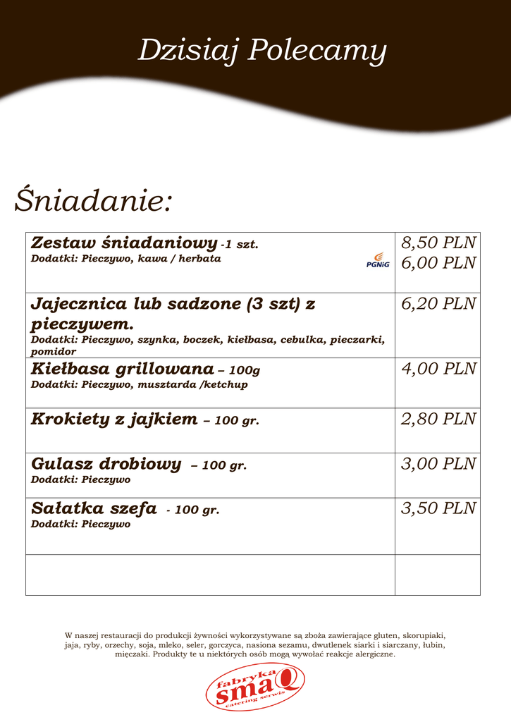 Dzisiaj Polecamy Śniadanie: Zestaw śniadaniowy -1 szt. Dodatki: Pieczywo, kawa / herbata Jajecznica lub sadzone (3 szt) z pieczywem. 8,50 PLN 6,00 PLN 6,20 PLN Dodatki: Pieczywo, szynka, boczek, kiełbasa, cebulka, pieczarki, pomidor Kiełbasa grillowana – 100g 4,00 PLN Dodatki: Pieczywo, musztarda /ketchup Krokiety z jajkiem Gulasz drobiowy – 100 gr. – 100 gr. Dodatki: Pieczywo Sałatka szefa - 100 gr. 2,80 PLN 3,00 PLN 3,50 PLN Dodatki: Pieczywo W naszej restauracji do produkcji żywności wykorzystywane są zboża zawierające gluten, skorupiaki, jaja, ryby, orzechy, soja, mleko, seler, gorczyca, nasiona sezamu, dwutlenek siarki i siarczany, łubin, mięczaki. Produkty te u niektórych osób mogą wywołać reakcje alergiczne. Dzisiaj Polecamy Obiad: Fasolowa - 250 ml. Kotlety rybne - 150 gr. 14,50 PLN 13,50 PLN Ziemniaki, surówka/jarzyna, kompot Pomidorowa - 350 ml. Pulpety w sosie pomidorowym - 180 gr. 18,50 PLN Ziemniaki, surówka/jarzyna, kompot, Fasolowa - 250 ml. Kaczka pieczona z wiśniami -200gr. 19,50 PLN Ziemniaki, surówka/jarzyna, kompot Pomidorowa - 350 ml. Brokuły zapiekane w sosie beszamelowym – 350 gr. 12,90 PLN Surówka/jarzyna, kompot W naszej restauracji do produkcji żywności wykorzystywane są zboża zawierające gluten, skorupiaki, jaja, ryby, orzechy, soja, mleko, seler, gorczyca, nasiona sezamu, dwutlenek siarki i siarczany, łubin, mięczaki. Produkty te u niektórych osób mogą wywołać reakcje alergiczne.