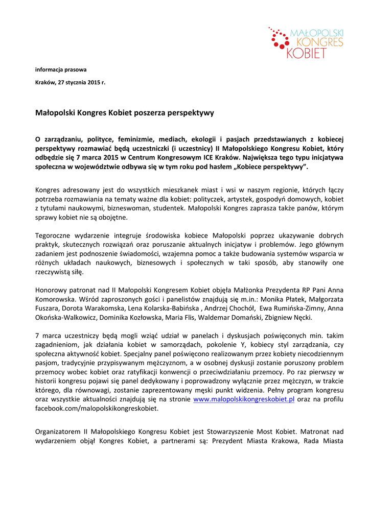 informacja prasowa Kraków, 27 stycznia 2015 r. Małopolski Kongres Kobiet poszerza perspektywy O zarządzaniu, polityce, feminizmie, mediach, ekologii i pasjach przedstawianych z kobiecej perspektywy rozmawiać będą uczestniczki (i uczestnicy) II Małopolskiego Kongresu Kobiet, który odbędzie się 7 marca 2015 w Centrum Kongresowym ICE Kraków. Największa tego typu inicjatywa społeczna w województwie odbywa się w tym roku pod hasłem „Kobiece perspektywy”. Kongres adresowany jest do wszystkich mieszkanek miast i wsi w naszym regionie, których łączy potrzeba rozmawiania na tematy ważne dla kobiet: polityczek, artystek, gospodyń domowych, kobiet z tytułami naukowymi, bizneswoman, studentek. Małopolski Kongres zaprasza także panów, którym sprawy kobiet nie są obojętne. Tegoroczne wydarzenie integruje środowiska kobiece Małopolski poprzez ukazywanie dobrych praktyk, skutecznych rozwiązań oraz poruszanie aktualnych inicjatyw i problemów. Jego głównym zadaniem jest podnoszenie świadomości, wzajemna pomoc a także budowania systemów wsparcia w różnych układach naukowych, biznesowych i społecznych w taki sposób, aby stanowiły one rzeczywistą siłę. Honorowy patronat nad II Małopolski Kongresem Kobiet objęła Małżonka Prezydenta RP Pani Anna Komorowska. Wśród zaproszonych gości i panelistów znajdują się m.in.: Monika Płatek, Małgorzata Fuszara, Dorota Warakomska, Lena Kolarska-Babińska , Andrzej Chochół, Ewa Rumińska-Zimny, Anna Okońska-Walkowicz, Dominika Kozłowska, Maria Flis, Waldemar Domański, Zbigniew Nęcki. 7 marca uczestniczy będą mogli wziąć udział w panelach i dyskusjach poświęconych min. takim zagadnieniom, jak działania kobiet w samorządach, pokolenie Y, kobiecy styl zarządzania, czy społeczna aktywność kobiet. Specjalny panel poświęcono realizowanym przez kobiety niecodziennym pasjom, tradycyjnie przypisywanym mężczyznom, a w osobnej dyskusji zostanie poruszony problem przemocy wobec kobiet oraz ratyfikacji konwencji o przeciwdziałaniu przemocy. Po raz pierwszy w historii kongresu pojawi się panel dedykowany i poprowadzony wyłącznie przez mężczyzn, w trakcie którego, dla równowagi, zostanie zaprezentowany męski punkt widzenia. Pełny program kongresu oraz wszystkie aktualności znajdują się na stronie www.malopolskikongreskobiet.pl oraz na profilu facebook.com/malopolskikongreskobiet. Organizatorem II Małopolskiego Kongresu Kobiet jest Stowarzyszenie Most Kobiet. Matronat nad wydarzeniem objął Kongres Kobiet, a partnerami są: Prezydent Miasta Krakowa, Rada Miasta Krakowa, Krakowskie Biuro Festiwalowe. Patronat medialny nad wydarzeniem sprawują: TVP Kraków, Radio Kraków, Gazeta Krakowska, Wrota Małopolski, Miasto Kobiet, Gazeta Gdowianin. Stowarzyszenie Most Kobiet: Stowarzyszenie jest głównym organizatorem II Małopolskiego Kongresu Kobie. Nazwa „Most Kobiet” zawiera w swojej symbolice potrzebę łączenia różnych środowisk w celu poznawania, budowania porozumienia, współdziałania i współpracy. Most to też przechodzenie na drugi brzeg – zrozumienie drugiej strony i zamiana utartych schematów myślenia. Oficjalna strona : www.malopolskikongreskobiet.pl Odwiedź nas i polub na FB: facebook.com/malopolskikongreskobiet Kontakt dla mediów: Justyna Ożóg, Rzeczniczka Prasowa II Małopolskiego Kongresu Kobiet tel. 605574235 e-mail: [email protected]