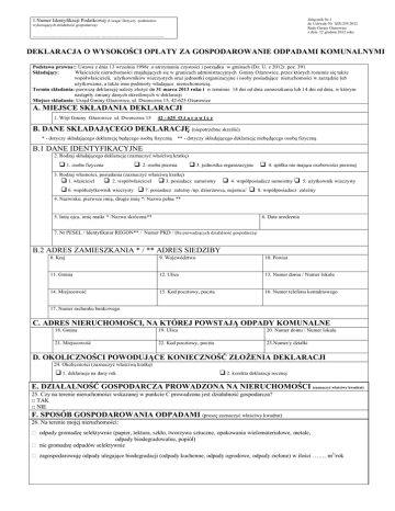 1.Numer Identyfikacji Podatkowej (Uwaga! Dotyczy Załącznik Nr 1 do Uchwały Nr XIX/255/2012 Rady Gminy Ożarowice z dnia 12 grudnia 2012 roku podmiotów wykonujących działalność gospodarczą) ................................................................................................... DEKLARACJA O WYSOKOŚCI OPŁATY ZA GOSPODAROWANIE ODPADAMI KOMUNALNYMI Podstawa prawna:: Ustawa z dnia 13 września 1996r. o utrzymaniu czystości i porządku w gminach (Dz. U. z 2012r. poz. 391 Składający: Właściciele nieruchomości znajdujących się w granicach administracyjnych Gminy Ożarowice, przez których rozumie się także współwłaścicieli, użytkowników wieczystych oraz jednostki organizacyjne i osoby posiadające nieruchomości w zarządzie lub użytkowania, a także inne podmioty władające nieruchomością. Termin składania: pierwszą deklarację należy złożyć do 31 marca 2013 roku i w terminie 14 dni od dnia zamieszkania lub 14 dni od dnia, w którym nastąpiły zmiany danych określonych w deklaracji Miejsce składania: Urząd Gminy Ożarowice, ul. Dworcowa 15, 42-625 Ożarowice A. MIEJSCE SKŁADANIA DEKLARACJI 1. Wójt Gminy Ożarowice ul. Dworcowa 15 42 - 625 O ż a r o w i c e B. DANE SKŁADAJĄCEGO DEKLARACJĘ (niepotrzebne skreślić) * - dotyczy składającego deklarację będącego osobą fizyczną ** - dotyczy składającego deklarację niebędącego osobą fizyczną B.1 DANE IDENTYFIKACYJNE 2. Rodzaj składającego deklarację (zaznaczyć właściwą kratkę) 1. osoba fizyczna 2. osoba prawna 3. jednostka organizacyjna 3. Rodzaj własności, posiadania (zaznaczyć właściwą kratkę) 1. właściciel 2. współwłaściciel 3. posiadacz samoistny 6. współużytkownik wieczysty 7. posiadacz 4. spółka nie mająca osobowości prawnej 4. współposiadacz samoistny 5. użytkownik wieczysty zależny /np. dzierżawca, najemca/ 8. współposiadacz zależny 4. Nazwisko, pierwsze imię, drugie imię */ Nazwa pełna ** 5. Imię ojca, imię matki * /Nazwa skrócona** 6. Data urodzenia 7. Nr PESEL / Identyfikator REGON** / Numer PKD / Dla prowadzących działalność gospodarczą/ B.2 ADRES ZAMIESZKANIA * / ** ADRES SIEDZIBY 8. Kraj 9. Województwo 10. Powiat 11. Gmina 12. Ulica 13. Numer domu / Numer lokalu 14. Miejscowość 15. Kod pocztowy, poczta 16. Numer telefonu kontaktowego 17. Numer rachunku bankowego C. ADRES NIERUCHOMOŚCI, NA KTÓREJ POWSTAJĄ ODPADY KOMUNALNE 18. Gmina 19. Ulica 20. Numer domu / Numer lokalu 21. Miejscowość 22. Kod pocztowy, poczta 23.Numer/y działki D. OKOLICZNOŚCI POWODUJĄCE KONIECZNOŚĆ ZŁOŻENIA DEKLARACJI 24. Okoliczności (zaznaczyć właściwą kratkę) 1. deklaracja na dany rok 2. korekta deklaracji rocznej E. DZIAŁALNOŚĆ GOSPODARCZA PROWADZONA NA NIERUCHOMOŚCI (zaznaczyć właściwy kwadrat) 25. Czy na terenie nieruchomości wskazanej w punkcie C prowadzona jest działalność gospodarcza? □ TAK □ NIE F. SPOSÓB GOSPODAROWANIA ODPADAMI (proszę zaznaczyć właściwy kwadrat) 26. Na terenie mojej nieruchomości: odpady gromadzę selektywnie (papier, tektura, szkło, tworzywa sztuczne, opakowania wielomateriałowe, metale, odpady biodegradowalne, popiół) nie gromadzę odpadów selektywnie zagospodarowuję odpady ulegające biodegradacji (odpady kuchenne, odpady ogrodowe, odpady zielone) w ilości ……. m3/rok G. OŚWIADCZENIE WŁAŚCICIELI NIERUCHOMOŚCI ZAMIESZKAŁYCH 27. Oświadczam, że na terenie nieruchomości na której powstają odpady zamieszkuje: ………………….………………………. (liczba mieszkańców) 28. Wyliczenie miesięcznej opłaty: …………………………………… X ………………………………….. = ………………………..…………………………….. zł (liczba mieszkańców) (stawka opłaty) (iloczyn liczby mieszkańców i stawki opłaty) 29. Wysokość opłaty miesięcznej za gospodarowanie odpadami komunalnymi wynosi ……………………….. zł (słownie …..………………………………………………………………………………………………………………………………………..…………….) H. OŚWIADCZENIE WŁAŚCICIELI NIERUCHOMOŚCI NIEZAMIESZKAŁYCH, NA KTÓRYCH POWSTAJĄ ODPADY 30. Oświadczam, że na terenie nieruchomości na której powstają odpady komunalne gromadzone są: …………………………………………………………………………………………………………………………………………………………………… (liczba i rodzaj pojemników) 31. Wyliczenie miesięcznej opłaty: ……………………………………………X …………………………………………=……………………………………………………………zł (liczba pojemników) (stawka opłaty) (iloczyn liczby pojemników i stawki opłaty) 32. Wysokość opłaty miesięcznej za gospodarowanie odpadami komunalnymi wynosi ………………………. zł ( słownie…………………………………………………………………………………………………………………………………………………………) I. ZAŁĄCZNIKI (należy wymienić rodzaj załącznika) 33. 1.Kopia umowy z Przedsiębiorcą na odbieranie odpadów komunalnych – obowiązkowo przy pierwszej deklaracji 2. …………………………………. J. OŚWIADCZENIE I PODPIS SKŁADAJĄCEGO / OSOBY REPREZENTUJĄCEJ SKŁADAJĄCEGO Oświadczam, że podane przeze mnie dane są zgodne z prawdą. 34. Imię 36. Data wypełnienia (dzień - miesiąc - rok) 35. Nazwisko 37. Podpis (pieczęć) składającego / osoby reprezentującej składającego K. ADNOTACJE ORGANU PODATKOWEGO 38. Uwagi organu podatkowego W wyniku wstępnej kontroli przypada : do przypisu.......................................................zł ; do odpisu..........................................................zł Przypisano – odpisano kwotę ...................................................d