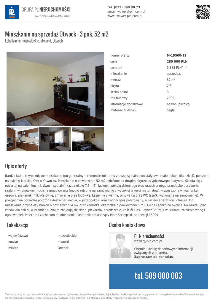 tel. (022) 398 90 73 email: [email protected] www: wawer.pln.com.pl Mieszkanie na sprzedaż Otwock - 3 pok. 52 m2 Lokalizacja: mazowieckie, otwocki, Otwock numer oferty M-19500-12 cena 280 000 PLN cena m 5 385 PLN/m2 mieszkanie sprzedaż, metraż 52 m2 piętro 2/3 liczba pokoi 3 rok budowy 2009 informacje dodatkowe balkon, piwnica materiał budynku cegła 2 Opis oferty Bardzo ładne trzypokojowe mieszkanie (po generalnym remoncie rok temu z dużej sypialni powstały dwa małe pokoje dla dzieci), położone na osiedlu Morskie Oko w Otwocku. Mieszkanie o powierzchni 52 m2 położone na drugim piętrze trzypiętrowego budynku. Składa się z otwartej na salon kuchni, dwóch sypialni (każda około 7,5 m2), łazienki, pokoju dziennego oraz przestronnego przedpokoju z dwoma szafami wnękowymi. Kuchnia umeblowana (meble robione na zamówienie z wysokiej jakości materiałów), wyposażona w kuchenkę gazową, piekarnik, mikrofalówkę, zmywarkę oraz lodówkę. Łazienka z wanną, umywalką oraz WC (szafki wykonane na zamówienie). W pokojach na podłodze położona deska barlinecka, w przedpokoju oraz kuchni gres polerowany, w łazience terakota i glazura. Do mieszkania przynależy balkon o powierzchni 4 m2 oraz komórka lokatorska o powierzchni 5 m2. Cicha i spokojna okolica. Na osiedlu plac zabaw dla dzieci, w promieniu 200 m znajdują się sklep, piekarnia, przedszkole, kościół i las. Czynsz 350zł (z zaliczkami za ciepłą wodę i ogrzewanie). Polecam i zachęcam do obejrzenia Pośrednik prowadzący Piotr Szczypski, nr licencji 15099 Lokalizacja Osoba kontaktowa PL Nieruchomości województwo mazowieckie powiat otwocki [email protected] miasto Otwock Chętnie udzielę dodatkowych informacji związanych z tą ofertą. Zapraszam do kontaktu! tel. 509 000 003 Zawsze dążymy do tego, aby informacje o proponowanych przez nas ofertach były jak najbardziej dokładne. Niekiedy jednak, ze względu na fakt, iż uzyskujemy je od osób trzecich nie jest możliwe ich zweryfikowanie, wobec czego należy traktować je orientacyjnie i nie stanowią one oferty w rozumieniu kodeksu cywilnego.