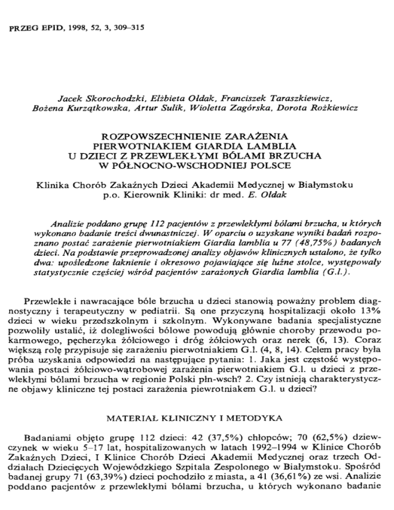 PRZEG EPID , 1998, 52, 3, 309-315 Jacek Skorochodzki, Elżbieta Oldak, Franciszek Taraszkiewicz, Bożena Kurzątkowska, Artur Sulik, Wioletta Zagórska, Dorota Rożkiewicz ROZPOWSZECHNIENIE ZARAŻENIA PIERW OTNIAKIEM GIARDIA LAMBLIA U DZIECI Z PRZEWLEKŁYMI BÓLAMI BRZUCHA W PÓŁNOCNO-WSCHODNIEJ POLSCE Klinika Chorób Zakaźnych Dzieci Akademii Medycznej w Białymstoku p.o. Kierownik Kliniki: dr med. E. Oldak Analizie poddano grupę 112 pacjentów z przewlekłymi bólami brzucha, u których wykonano badanie treści dwunastniczej. W oparciu o uzyskane wyniki badań rozpo znano postać zarażenie pierwotniakiem Giardia lamblia u 77 (48,75%) badanych dzieci. Na podstawie przeprowadzonej analizy objawów klinicznych ustalono, że tylko dwa: upośledzone łaknienie i okresowo pojawiające się luźne stolce, występowały statystycznie częściej wśród pacjentów zarażonych Giardia lamblia (G.I.). Przewlekłe i nawracające bóle brzucha u dzieci stanowią poważny problem diag nostyczny i terapeutyczny w pediatrii. Są one przyczyną hospitalizacji około 13% dzieci w wieku przedszkolnym i szkolnym. Wykonywane badania specjalistyczne pozwoliły ustalić, iż dolegliwości bólowe powodują głównie choroby przewodu po karmowego, pęcherzyka żółciowego i dróg żółciowych oraz nerek (6, 13). Coraz większą rolę przypisuje się zarażeniu pierwotniakiem G.l. (4, 8, 14). Celem pracy była próba uzyskania odpowiedzi na następujące pytania: 1. Jaka jest częstość występo wania postaci żółciowo-wątrobowej zarażenia pierwotniakiem G.l. u dzieci z prze wlekłymi bólami brzucha w regionie Polski płn-wsch? 2. Czy istnieją charakterystycz ne objawy kliniczne tej postaci zarażenia piewrotniakem G.l. u dzieci? MATERIAL KLINICZNY I METODYKA Badaniami objęto grupę 112 dzieci: 42 (37,5%) chłopców; 70 (62,5%) dziew czynek w wieku 5-17 lat, hospitalizowanych w latach 1992-1994 w Klinice Chorób Zakaźnych Dzieci, I Klinice Chorób Dzieci Akademii Medycznej oraz trzech Od działach Dziecięcych Wojewódzkiego Szpitala Zespolonego w Białymstoku. Spośród badanej grupy 71 (63,39%) dzieci pochodziło z miasta, a 41 (36,61 %) ze wsi. Analizie poddano pacjentów z przewlekłymi bólami brzucha, u których wykonano badanie 310 J. Skorochodzki i in. Nr 3 T a b e l a 1. C harakterystyka badanej grupy 112 dzied treści dwunatniczej. Na podstawie obecności trofozoitów Giardia lamblia w poszcze gólnych frakcjach żółci wydzielono dwie podgrupy: - podgrupa A: dzieci z potwierdzoną postacią żółciowo-wątrobową zarażenia pierwotniakiem G.l. - podgrupa B: dzieci bez zarażenia pierwotniakiem G.l. Charakterystykę badanych dzieci przedstawiono w tabeli I. Analizie statystycznej poddano lokalizację bólu w obrębie jamy brzusznej, jak również inne towarzyszące niejednokrotnie zarażeniu pierwotniakowemu objawy, tj.: upośledzone łaknienie, nudności, ból głowy, wymioty, luźne stolce, stany podgorącz kowe, zaparcia, zmiany skórne pod postacią alergicznych wysypek. Obliczenia doko nano za pomocą pakietu statystycznego CSS-statistica, testu niezależności chi2 oraz testu dokładnego Fishera. W Y N IK I B A D A Ń Postać wątrobowo-pęcherzykową zarażenia pierwotniakiem G.l. spośród 112 (100%) badanych, stwierdzono u 77 (68,75%) pacjentów. Średnia arytmetyczna wieku wyniosła w badanej grupie dzieci 12,3 lat. Chłopców było 30 (38,96%), dziewcząt 47 (61,04%). Wśród 77 (100%) dzieci, 49 (63,64%) zamieszkiwało w mieście, a 28 (36,36%) na wsi. W grupie 28 (100%) dzieci zarażonych G.l., zamieszkałych na wsi, było 11 chłopców (39,29%) i 17 (60,71%) dziewcząt. Spośród 49 (100%) mieszkających w mieście, 14 (28,57%) było płci męskiej a 35 (71,43%) płci żeńskiej. Nie wykazano istotnych różnic w częstości występowania zarażenia G.l. u dzieci w zależności od wieku (p>0,05). Również płeć oraz miejsce zamieszkania nie były wartościami znamiennymi dla żadnej z grup (p>0,05). Populacja 112 badanych pacjentów stanowiła w pewnym stopniu grupę wyselek cjonowaną. Byli to pacjenci hospitalizowani z powodu przewlekłych bólów brzucha. Bólom brzucha towarzyszyło najczęściej upośledzone łaknienie. Obserwowano je u 45 (58,00%) pacjentów zarażonych G.l. i u 13 (37,14%) bez zarażenia. Różnica ta jest statystycznie znamienna dla grupy dzieci zarażonych G.l. (p<0,05). Drugą war tością znamienną dla tej grupy była częstość występowania luźnych stołów (p<0,05). Obserwowano je u 14 (18,18%) dzieci. Nie stwierdzano tego objawu u pacjentów bez JS]Г 3 Rozpowszechnienie zarażenia pierwotniakiem G iardia lablia 311 T a b e l a 11. Charakterystyka objawów klinicznych występujących w badanej grupie dzieci * p < 0,05 postaci wątrobowo-pęcherzykowej zarażenia. Pozostałe objawy w częstości swego występowania nie były wartościami statystycznie znamiennymi dla żadnej z badanych grup (p>0,05). Powyższe dane przedstawiono w tabeli II. Analizie statystycznej poddano również lokalizację bólów brzucha (rycina 1). W obu badanych grupach większość dzieci nie potrafiła dokładnie zlokalizować miejsca występowania dolegliwości bólowych. Rozlane bóle brzucha zgłaszało 37 (48,05%) pacjentów zarażonych G.l. wobec 16 (45,71%) dzieci bez zarażenia. Nadbrzusze było miejscem lokalizacji bólu u 11 (14,29%) dzieci z infekcją pierwotniakową i u 8 (22,86%) hospitalizowanych, u których nie stwierdzono wątrobowo-pęcherzykowej postaci za rażenia. Częstość występowania wyżej wymienionych lokalizacji nie była wartością 312 J. Skorochodzki i in. Nr 3 znamienną dla żadnej z hospitalizowanych grup (p>0,05). Natomiast lokalizacja dolegliwości w nadbrzuszu łącznie ze śródbrzuszem, była drugą w częstości umiej scowienia bólu, zgłaszaną przez dzieci z G.l. Występowała ona u 21 (27,27%) pacjen tów, wobec tylko 1 (2,86%) pacjenta bez zarażenia. Częstość bólu brzucha o tej lokalizacji jest wartością is