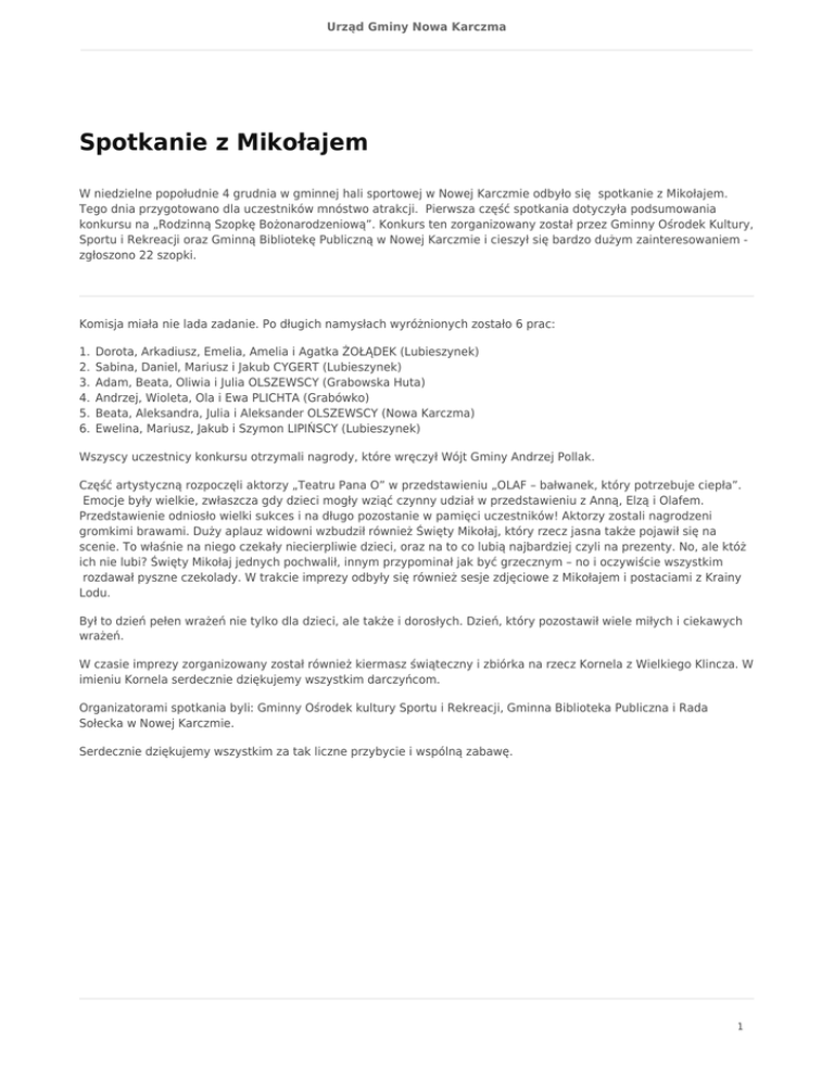 Urząd Gminy Nowa Karczma Spotkanie z Mikołajem W niedzielne popołudnie 4 grudnia w gminnej hali sportowej w Nowej Karczmie odbyło się spotkanie z Mikołajem. Tego dnia przygotowano dla uczestników mnóstwo atrakcji. Pierwsza część spotkania dotyczyła podsumowania konkursu na „Rodzinną Szopkę Bożonarodzeniową”. Konkurs ten zorganizowany został przez Gminny Ośrodek Kultury, Sportu i Rekreacji oraz Gminną Bibliotekę Publiczną w Nowej Karczmie i cieszył się bardzo dużym zainteresowaniem zgłoszono 22 szopki. Komisja miała nie lada zadanie. Po długich namysłach wyróżnionych zostało 6 prac: 1. 2. 3. 4. 5. 6. Dorota, Arkadiusz, Emelia, Amelia i Agatka ŻOŁĄDEK (Lubieszynek) Sabina, Daniel, Mariusz i Jakub CYGERT (Lubieszynek) Adam, Beata, Oliwia i Julia OLSZEWSCY (Grabowska Huta) Andrzej, Wioleta, Ola i Ewa PLICHTA (Grabówko) Beata, Aleksandra, Julia i Aleksander OLSZEWSCY (Nowa Karczma) Ewelina, Mariusz, Jakub i Szymon LIPIŃSCY (Lubieszynek) Wszyscy uczestnicy konkursu otrzymali nagrody, które wręczył Wójt Gminy Andrzej Pollak. Część artystyczną rozpoczęli aktorzy „Teatru Pana O” w przedstawieniu „OLAF – bałwanek, który potrzebuje ciepła”. Emocje były wielkie, zwłaszcza gdy dzieci mogły wziąć czynny udział w przedstawieniu z Anną, Elzą i Olafem. Przedstawienie odniosło wielki sukces i na długo pozostanie w pamięci uczestników! Aktorzy zostali nagrodzeni gromkimi brawami. Duży aplauz widowni wzbudził również Święty Mikołaj, który rzecz jasna także pojawił się na scenie. To właśnie na niego czekały niecierpliwie dzieci, oraz na to co lubią najbardziej czyli na prezenty. No, ale któż ich nie lubi? Święty Mikołaj jednych pochwalił, innym przypominał jak być grzecznym – no i oczywiście wszystkim rozdawał pyszne czekolady. W trakcie imprezy odbyły się również sesje zdjęciowe z Mikołajem i postaciami z Krainy Lodu. Był to dzień pełen wrażeń nie tylko dla dzieci, ale także i dorosłych. Dzień, który pozostawił wiele miłych i ciekawych wrażeń. W czasie imprezy zorganizowany został również kiermasz świąteczny i zbiórka na rzecz Kornela z Wielkiego Klincza. W imieniu Kornela serdecznie dziękujemy wszystkim darczyńcom. Organizatorami spotkania byli: Gminny Ośrodek kultury Sportu i Rekreacji, Gminna Biblioteka Publiczna i Rada Sołecka w Nowej Karczmie. Serdecznie dziękujemy wszystkim za tak liczne przybycie i wspólną zabawę. 1