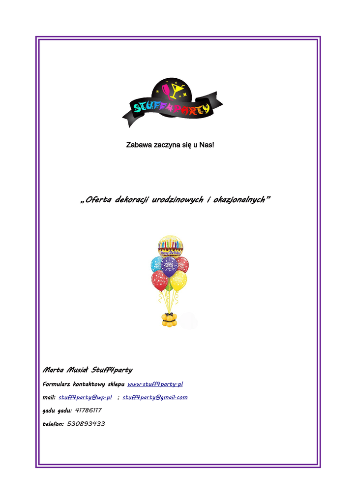 Zabawa zaczyna się u Nas! „Oferta dekoracji urodzinowych i okazjonalnych” Marta Musiał Stuff4party Formularz kontaktowy sklepu www.stuff4party.pl mail: [email protected] ; [email protected] gadu gadu: 41786117 telefon: 530893433 Szanowni Państwo Moją wieloletnią pasją są dekoracje, które zapewnią przeżycie wyjątkowych chwil każdemu dziecku podczas balu, zabawy, imprez tematycznych oraz okolicznościowych. Wyszukuje artykuły wyjątkowe, łącząc je tematycznie by stworzyć idealny bajkowy świat stanowiący obraz marzeń dzieci, dzięki którym zabawy karnawałowe, przyjęcia okazjonalne, bale oraz organizacja imprez urodzinowych stanie się przyjemnością dla Państwa oraz okazją do uczestnictwa dzieci w niezwykłych przygodach. Chętnie pomagam i doradzam, tak by spełnić oczekiwania nawet najmłodszego klienta a zarazem by przyjęcie wyróżniło się spośród innych spotkań. Z zaangażowaniem śledzę najnowsze trendy świata dziecięcego dzięki czemu mogę zaproponować wyszukane artykuły przenoszące wyobraźnie do krainy czarów, gdzie czekają ich niezapomniane chwile. Przede wszystkim najważniejsza dla mnie jest satysfakcja Naszych Klientów, dlatego mogę zapewnić o swojej rzetelności i odpowiedzialności jako partner w interesach. Każdego klienta i każde zamówienie traktuje indywidualnie i dokładam wszelkich starań do spełnienia wymogów i sugestii Klienta. Zapraszam do zapoznania się z ofertą sklepu na www.stuff4party.pl Poniżej przedstawiamy Państwu niewielką część naszej oferty dla Dzieci. Serdecznie zapraszam do zapoznania się z wybranymi dekoracjami, które zostały stworzone specjalnie na przyjęcia urodzinowe, zabawy dla dzieci oraz przedstawienia. Balony gumowe jednokolorowe w szerokiej gamie kolorystycznej oraz z nadrukiem Balony foliowe (kształty, postacie z bajek, zwierzątka, auta i wiele innych) w różnych rozmiarach oraz możliwością napompowania helem. świeczki urodzinowe, cyferki, pikery, świecące, magiczne, grające, z motywem pirackim, księżniczki, zwierzątek, licencjonowanych i nie tylko, Banery "Sto Lat" , "Happy Birthday" zwykłe metaliczne jak i z ulubionymi postaciami bajkowymi, flagi, girlandy, serpentyny, gwizdki, kolorowe czapeczki, trąbki, dekoracje do lodów, tortów, ciast, potraw i napojów, całą gamę zestawów urodzinowych (talerzyki, kubeczki, serwetki, obrusy) z najbardziej popularnych bajek, licencjonowanych kreskówek, motywów dla chłopców i dziewczynek, charakteryzacje (wąsy, brwi, okulary, maski), farbki, kredki, brokat do twarzy i ciała. unikalne bajkowe stroje i dodatki dla dzieci dekoracje na zabawy tematyczne Wkrótce w naszej ofercie pojawią się również: wypożyczalnia strojów, sukienek oraz dodatków i rekwizytów Przebrania na przedstawienia , pokazy oraz tańce Pomoc, inspiracje, propozycje, propozycje gotowe pomysły oraz dobór odpowiednich dekoracji przy imprezach i przyjęciach okolicznościowych. Bukiety balonowe czyli alternatywa dla kwiatów; aranżacje na każdą okazje, gotowe wzory oraz na zamówienie. Usługi dekorowania przyjęć (urodzinowych, okolicznościowych) Zaproszenia oraz kartki okolicznościowe Personalizowane Zachęcamy do zapoznania się bliżej z produktami na naszej stronie internetowej www.stuff4party.pl . Decydując się na współpracę z moją firmą możecie Państwo liczyć na ekspresowe terminy realizacji, miłą i fachową pomoc w doborze produktów, jeśli nasza oferta wzbudza Państwa zainteresowanie uprzejmie prosimy o kontakt byśmy mogli przedstawić więcej szczegółów oraz zaprezentować konkretne ceny oraz produkty.