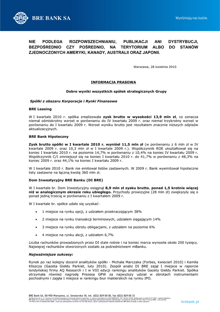 NIE PODLEGA ROZPOWSZECHNIANIU, PUBLIKACJI ANI BEZPOŚREDNIO CZY POŚREDNIO, NA TERYTORIUM ALBO ZJEDNOCZONYCH AMERYKI, KANADY, AUSTRALII ORAZ JAPONII. DYSTRYBUCJI, DO STANÓW Warszawa, 28 kwietnia 2010 INFORMACJA PRASOWA Dobre wyniki wszystkich spółek strategicznych Grupy Spółki z obszaru Korporacje i Rynki Finansowe BRE Leasing W I kwartale 2010 r. spółka zrealizowała zysk brutto w wysokości 13,9 mln zł, co oznacza niemal ośmiokrotny wzrost w porównaniu do IV kwartału 2009 r. oraz niemal trzykrotny wzrost w porównaniu do I kwartału 2009 r. Wzrost wyniku brutto jest rezultatem znacznie niższych odpisów aktualizacyjnych. BRE Bank Hipoteczny Zysk brutto spółki w I kwartale 2010 r. wyniósł 11,5 mln zł (w porównaniu z 6 mln zł w IV kwartale 2009 r. oraz 10,3 mln zł w I kwartale 2009 r.). Współczynnik ROE ukształtował się na koniec I kwartału 2010 r. na poziomie 14,7% w porównaniu z 10,4% na koniec IV kwartału 2009 r. Współczynnik C/I zmniejszył się na koniec I kwartału 2010 r. do 41,7% w porównaniu z 48,3% na koniec 2009 r. oraz 44,1% na koniec I kwartału 2009 r. W I kwartale 2010 r. Bank nie emitował listów zastawnych. W 2009 r. Bank wyemitował hipoteczne listy zastawne na łączną kwotę 360 mln zł. Dom Inwestycyjny BRE Banku (DI BRE) W I kwartale br. Dom Inwestycyjny osiągnął 8,9 mln zł zysku brutto, ponad 1,5 krotnie więcej niż w analogicznym okresie roku ubiegłego. Przychody prowizyjne (28 mln zł) zwiększyły się o ponad jedną trzecią w porównaniu z I kwartałem 2009 r. W I kwartale br. spółce udało się uzyskać: • 1 miejsce na rynku opcji, z udziałem przekraczającym 38% • 2 miejsce na rynku transakcji terminowych, udziałem sięgającym 14% • 3 miejsce na rynku obrotu obligacjami, z udziałem na poziomie 6% • 4 miejsce na rynku akcji, z udziałem 6,7% Liczba rachunków prowadzonych przez DI stale rośnie i na koniec marca wynosiła około 200 tysięcy. Najwięcej rachunków otworzonych zostało za pośrednictwem mBanku. Najważniejsze sukcesy: Rynek po raz kolejny docenił analityków spółki - Michała Marczaka (Forbes, kwiecień 2010) i Kamila Kliszcza (Gazeta Giełdy Parkiet, luty 2010). Zespół analiz DI BRE zajął I miejsce w raporcie londyńskiej firmy AQ Research i I w VIII edycji rankingu analityków Gazety Giełdy Parkiet. Spółka otrzymała również nagrodę Prezesa GPW za najwyższy udział w obrotach instrumentami pochodnymi i zajęła I miejsce w rankingu biur maklerskich na rynku IPO. BRE Bank SA, 00-950 Warszawa, ul. Senatorska 18, tel. (022) 829 00 00, fax (022) 829 00 33 Sąd Rejonowy dla m. st. Warszawy XII Wydział Gospodarczy Krajowego Rejestru Sądowego, nr rejestru przedsiębiorców KRS 0000025237, NIP: 526-021-50-88. Według stanu na dzień 01.01.2010 r. kapitał zakładowy BRE Banku SA (w całości wpłacony) wynosi 118.763.528 złotych. W związku z realizacją warunkowego podwyższenia kapitału zakładowego, na podstawie uchwały XXI WZ z dnia 14 marca 2008r., oraz uchwały XVI NWZ z dnia 27 października 2008r., może ulec podwyższeniu do kwoty 123.763.528 złotych. Akcje w podwyższonym kapitale zakładowym BRE Banku SA będą w całości opłacone. brebank.pl brebank.pl Polfactor Faktoring – Grupa Intermarket W I kwartale 2010 r. spółki Grupy Intermarket zrealizowały obroty o łącznej wartości 1,25 mld EUR (wzrost rok do roku o 8%). Najwyższy wzrost obrotów w ujęciu wartościowym dotyczył spółek austriackiej (+8% r/r) oraz polskiej (+ 26% r/r). Wartym podkreślenia jest fakt, że spółki węgierska i czeska, które ucierpiały najbardziej w czasie kryzysu ubiegłego roku, również wykazują tendencje wzrostowe (odpowiednio 9% i 3% r/r). W I kwartale 2010 r. spółki Grupy Intermarket konsolidowane z BRE Bankiem zrealizowały zysk brutto w kwocie 5,7 mln zł wobec 13,1 mln zł straty w I kwartale 2009 r., na którą wpływ miały wówczas zdarzenia jednorazowe (utworzone rezerwy na spółkę rumuńską, sprzedaną w IV kwartale 2009 r.). Znacznemu obniżeniu uległy odpisy na należności faktoringowe (spadek o 34% r/r oraz 60% w stosunku do IV kwartału 2009 r.) oraz koszty działalności (spadek odpowiednio o 20% i 9%). Polfactor utrzymuje dynamiczny wzrost obrotów, które po I kwartale 2010 r. wyniosły 985 mln zł (+26% r/r). Podobnie jak w 2009 r. Polfactor rozwija się szybciej niż polski rynek faktoringowy, który w I kwartale 2010 r. odnotował 22% wzrost osiągając wartość 8,6 mld PLN. Warto zaznaczyć, że w faktoringu krajowym Polfactor odnotował aż 35% wzrost r/r. Dzięki znacznie niższym odpisom na należności oraz utrzymaniu kosztów na stałym poziomie zysk brutto po I kwartale 2010 r. wyniósł 2,1 mln zł. Najważniejsze sukcesy: W 2010 roku Polfactor obchodzi jubileusz 15-lecia. Jest jedną z największych, a zarazem najstarszych spółek faktoringowych w Polsce. Podstawowym produktem oferowanym przez Polfactor jest faktoring z regresem, który w I kwartale 2010 r. stanowił blisko 85% całości obrotów tej spółki. Spółki z obszaru Bankowości Detalicznej BRE Ubezpieczenia TUiR i BRE Ubezpieczenia Zysk brutto Spółki w ujęciu skonsolidowanym (łącznie z BRE Ubezpieczenia sp. z o.o.) za I kwartał br. wyniósł 10 mln zł, co stanowi 21% wzrost w porównaniu z I kwartałem 2009 r. Przychody z działalności ubezpieczeniowej oraz pomocniczej wyniosły w sumie 42 mln zł. W ramach platformy internetowej spółka BRE Ubezpieczenia zebrała w I kwartale 2010 r. łącznie 20,3 mln zł przypisu składki brutto, co stanowi 30% wzrost w porównaniu z analogicznym okresem roku ubiegłego. Bancassurance osiągnął przypis składki na poziomie 164,3 mln zł, co stanowi 115% wzrost w porównaniu z analogicznym okresem 2009 r. Wzrost wynika ze zwiększenia sprzedaży polis lokacyjnych o blisko 200%. W marcu 2010 r. liczba ubezpieczonych kredytów hipotecznych w mBanku i MultiBanku była wyższa o ponad 25% od średniej z ubiegłego roku. BRE Weal