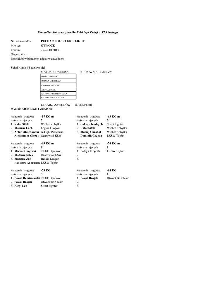 Komunikat Końcowy zawodów Polskiego Związku Kickboxingu Nazwa zawodów: PUCHAR POLSKI KICKLIGHT Miejsce: OTWOCK Termin: 25-26.10.2013 Organizator: Ilość klubów biorących udział w zawodach: Skład Komisji Sędziowskiej MATUSIK DARIUSZ KIEROWNIK PLANSZY JASIŃSKI MAREK KUTYŁA MIROSŁAW WRZOSEK MARCIN ŚLIWKA JACEK SUŁKOWSKI PRZEMYSŁAW SUŁKOWSKI JAROSŁAW LEKARZ ZAWODÓW Wyniki: KICKLIGHT JUNIOR kategoria wagowa ilość startujących 1. Rafał Sitek 2. Mariusz Lach 3. Artur Obuchowski Aleksander Olczak -57 KG m 7 Wicher Kobyłka Legion Głogów X-Fight Piaseczno Ożarowski KSW kategoria wagowa ilość startujących 1. Michał Chojecki 2. Mateusz Nitek 3. Mateusz Zoń -69 KG m 8 TKKF Ognisko Ożarowski KSW Beskid Dragon Radosław Andrusiak LKSW Tajfun kategoria wagowa ilość startujących 1. Paweł Remiszewski 2. Paweł Brojek 3. Kirył Len -79 KG 3 TKKF Ognisko Otwock KO Team Street Fighter BUDEK PIOTR kategoria wagowa ilość startujących 1. Łukasz Jendrych 2. Rafał Sitek 3. Maciej Chraboł Dominik Grzęda -63 KG m 5 Street Fighter Wicher Kobyłka Wicher Kobyłka LKSW Tajfun kategoria wagowa ilość startujących 1. Patryk Hrycak 2. 3. -74 KG m 1 LKSW Tajfun kategoria wagowa ilość startujących 1. Paweł Brojek 2. 3. -84 KG 1 Otwock KO Team kategoria wagowa ilość startujących 1. Emilia Sender 2. 3. -55 KG k 1 Beskid Dragon kategoria wagowa ilość startujących 1. Kamila Hermanowska 2. Aneta Kaczmarczyk 3. Weronika Pytlarz kategoria wagowa ilość startujących 1. Martyna Dzięciołowska 2. Aneta Kaczmarczyk 3. -70 KG 2 Wicher Kobyłka Otwock KO Team kategoria wagowa +70 KG ilość startujących 1 1. Martyna Dzięciołowska Wicher Kobyłka 2. 3. kategoria wagowa ilość startujących 1. 2. 3. kategoria wagowa ilość startujących 1. 2. 3. kategoria wagowa ilość startujących 1. 2. 3. kategoria wagowa ilość startujących 1. 2. 3. kategoria wagowa ilość startujących 1. 2. 3. kategoria wagowa ilość startujących 1. 2. 3. kategoria wagowa ilość startujących 1. 2. 3. kategoria wagowa ilość startujących 1. 2. 3. NAJLEPSZA ZAWODNICZKA: NAJLEPSZY ZAWODNIK: NAJLEPSZY KLUB: -65 KG k 3 KS Nadstal Otwock KO Team Beskid Dragon KAMILA HERMANOWSKA RAFAŁ SITEK WICHER KOBYŁKA