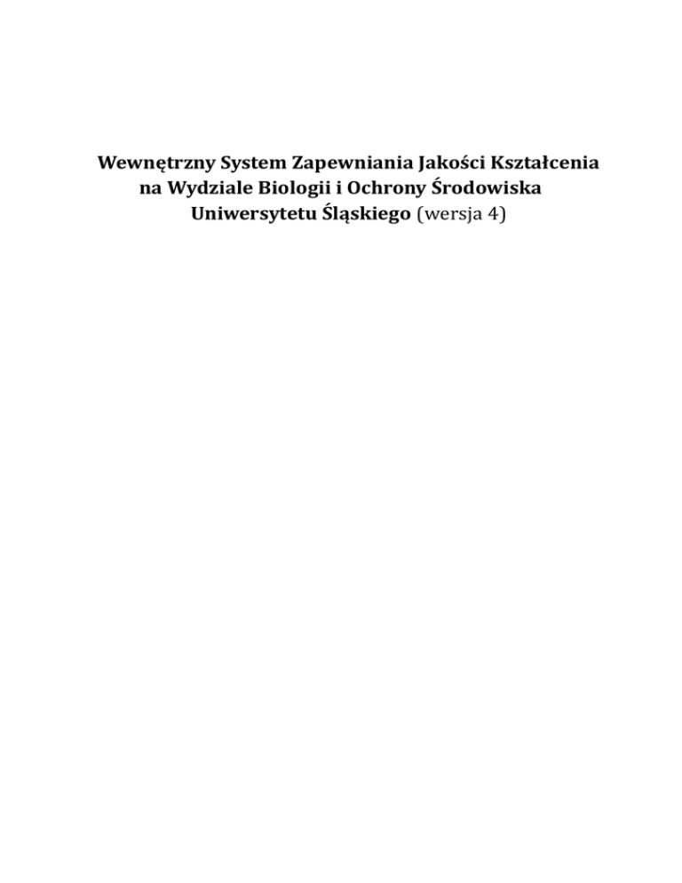 Wewnętrzny System Zapewniania Jakości Kształcenia na Wydziale Biologii i Ochrony Środowiska Uniwersytetu Śląskiego (wersja 4) Spis treści Wewnętrzny System Zapewniania Jakości Kształcenia na Wydziale Biologii i Ochrony Środowiska ........... 1 Uniwersytetu Śląskiego ............................................................................................................................... 1 Definicje i skróty: ........................................................................................................................................ 3 1 Cele i zadania systemu ............................................................................................................................. 4 2 Podmioty WSZJK .................................................................................................................................... 5 2.1 2.2 2.3 Wydziałowy Zespół ds. Jakości Kształcenia ................................................................................................... 5 Kierunkowe Zespoły Zapewniania Jakości Kształcenia ................................................................................... 6 Zespoły Pomocnicze Kierunkowego Zespołów Zapewniania Jakości Kształcenia ............................................ 6 3 Doskonalenie efektów kształcenia ............................................................................................................ 6 Określanie efektów kształcenia....................................................................................................................... 6 Monitorowanie realizacji efektów kształcenia ................................................................................................. 7 3.2.1 Ankieta oceny zajęć dydaktycznych .................................................................................................... 7 3.2.2 Hospitacje zajęć dydaktycznych .......................................................................................................... 7 3.2.3 Analiza sylabusów.............................................................................................................................. 8 3.2.4 Analiza sposobów weryfikacji efektów kształcenia .............................................................................. 9 3.2.5 Analiza realizacji efektów kształcenia w ramach praktyk zawodowych ................................................ 9 3.2.6 Analiza prac dyplomowych............................................................................................................... 10 3.3 Roczna ocena efektów kształcenia ................................................................................................................ 10 3.1 3.2 4 Doskonalenie programów kształcenia..................................................................................................... 10 4.1 4.2 4.3 4.4 4.5 4.6 4.7 4.8 4.9 Analiza zgodności systemu kształcenia na Wydziale z obowiązującym stanem prawnym ............................... 10 Analiza związku programów kształcenia ze strategią rozwoju Wydziału oraz misją i strategią rozwoju Uniwersytetu Śląskiego................................................................................................................................ 11 Analiza programów kształcenia .................................................................................................................... 11 Ankieta dotycząca opinii studentów kończących studia o procesie kształcenia ............................................... 11 Monitoring kariery zawodowej absolwentów ................................................................................................ 12 Analiza wzorców międzynarodowych........................................................................................................... 12 Udział interesariuszy wewnętrznych w procesie doskonalenia programu kształcenia ...................................... 12 Udział interesariuszy zewnętrznych w procesie doskonalenia programu kształcenia ....................................... 12 Ocena i zalecenia zmian w programach kształcenia ....................................................................................... 13 5 Zapewnienie jakości kadry dydaktycznej ................................................................................................ 13 5.1 5.2 Ocena nauczycieli akademickich przez studentów – ankietyzacja zajęć dydaktycznych .................................. 13 Analiza doboru kadry prowadzącej i wspierającej proces kształcenia, w tym nauczycieli akademickich stanowiących minimum kadrowe.................................................................................................................. 14 6 Zapewnianie studentom wsparcia dydaktycznego, naukowego i materialnego ......................................... 14 6.1 6.2 6.3 Analiza wsparcia dydaktycznego i naukowego dla studentów ........................................................................ 14 Analiza zasobów materialnych wspierających kształcenie ............................................................................. 14 Analiza organizacji procesu dydaktycznego .................................................................................................. 15 7 Gromadzenie i udostępnianie informacji o jakości kształcenia ................................................................ 15 7.1 7.2 7.3 7.4 7.5 7.6 Karta kierunku ............................................................................................................................................. 15 Karta nauczyciela akademickiego ................................................................................................................. 15 Przechowywanie innych informacji ważnych dla jakości kształcenia ............................................................. 16 Publikowanie informacji o programac