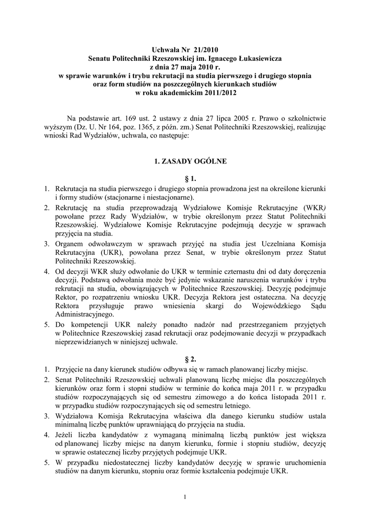 Uchwała Nr 21/2010 Senatu Politechniki Rzeszowskiej im. Ignacego