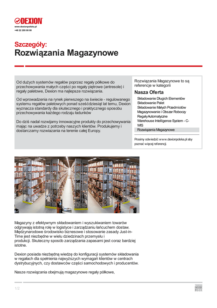 www.dexionpolska.pl +48 22 295 08 00 Szczegóły: Rozwiązania Magazynowe Od dużych systemów regałów poprzez regały półkowe do przechowywania małych części po regały piętrowe (antresole) i regały paletowe, Dexion ma najlepsze rozwiązania. Rozwiązania Magazynowe to są referencje w kategorii Nasza Oferta Składowanie Długich Elementów Składowanie Palet Składowanie Małych Przedmiotów Magazynowanie i Obszar Roboczy RegałyAutomatyczne Warehouse Intelligence System - CWIS Rozwiązania Magazynowe Od wprowadzenia na rynek pierwszego na świecie - regulowanego systemu regałów paletowych ponad sześćdziesiąt lat temu, Dexion wyznacza standardy dla skutecznego i praktycznego sposobu przechowywania każdego rodzaju ładunków Do dziś nadal rozwijamy innowacyjne produkty do przechowywania mając na uwadze z potrzeby naszych klientów. Produkujemy i dostarczamy rozwiazania na terenie całej Europy. Prosimy odwiedzić www.dexionpolska.pl aby poznać więcej referencji. Magazyny z efektywnym składowaniem i wyszukiwaniem towarów odgrywają istotną rolę w logistyce i zarządzaniu łańcuchem dostaw. Międzynarodowe środowisko biznesowe i stosowanie zasady Just-inTime jest niezbędne w wielu dziedzinach przemysłu i produkcji. Skuteczny sposób zarządzania zapasami jest coraz bardziej istotne. Dexion posiada niezbędną wiedzę do konfiguracji systemów składowania w regałach dla spełnienia najwyższych wymagań klientów w centrach dystrybucyjnych, czy dostawców części samochodowych i producentów. Nasze rozwiązania obejmują magazynowe regały półkowe, 1/2 www.dexionpolska.pl +48 22 295 08 00 wielopoziomowe regały półkowe, regały paletowe statyczne i dynamiczne, konstrukcje typu podest i rozwiązania do kompletowania. W szczególności nasze konfigurowalne regały paletowe Speedlock P90 znajdują zastosowanie w wielu środowiskach przemysłowych. Nasz system regałów paletowych jest wszechstronny, prosty w instalacji i łatwy do przebudowy. Więcej o naszych rozwiązaniach magazynowych do składowania palet dowiesz się wybierając: Regały Paletowe 2/2