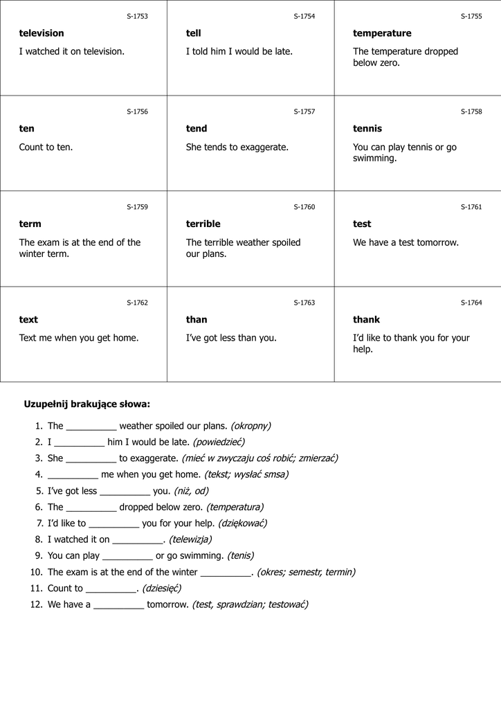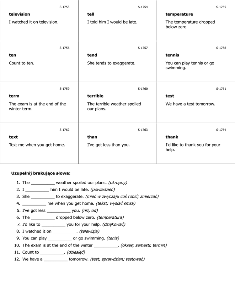 S-1753 S-1754 S-1755 television tell temperature I watched it on television. I told him I would be late. The temperature dropped below zero. S-1756 S-1757 S-1758 ten tend tennis Count to ten. She tends to exaggerate. You can play tennis or go swimming. S-1759 S-1760 S-1761 term terrible test The exam is at the end of the winter term. The terrible weather spoiled our plans. We have a test tomorrow. S-1762 S-1763 S-1764 text than thank Text me when you get home. I’ve got less than you. I’d like to thank you for your help. Uzupełnij brakujące słowa: 1. The __________ weather spoiled our plans. (okropny) 2. I __________ him I would be late. (powiedzieć) 3. She __________ to exaggerate. (mieć w zwyczaju coś robić; zmierzać) 4. __________ me when you get home. (tekst; wysłać smsa) 5. I’ve got less __________ you. (niż, od) 6. The __________ dropped below zero. (temperatura) 7. I’d like to __________ you for your help. (dziękować) 8. I watched it on __________. (telewizja) 9. You can play __________ or go swimming. (tenis) 10. The exam is at the end of the winter __________. (okres; semestr, termin) 11. Count to __________. (dziesięć) 12. We have a __________ tomorrow. (test, sprawdzian; testować) S-1755 S-1754 S-1753 temperatura powiedzieć telewizja Temperatura spadła poniżej zera. Powiedziałem mu, że się spóźnię. Oglądałem to w telewizji. www.isel.edu.pl www.isel.edu.pl www.isel.edu.pl S-1758 S-1757 S-1756 tenis Możesz zagrać w tenisa albo popływać. mieć w zwyczaju coś robić; zmierzać dziesięć Policz do dziesięciu. Ona ma w zwyczaju przesadzać. www.isel.edu.pl www.isel.edu.pl www.isel.edu.pl S-1761 S-1760 S-1759 test, sprawdzian; testować okropny okres; semestr, termin Jutro mamy sprawdzian. Okropna pogoda popsuła nasze plany. Egzamin jest na koniec semestru zimowego. www.isel.edu.pl www.isel.edu.pl www.isel.edu.pl S-1764 S-1763 S-1762 dziękować niż, od tekst; wysłać smsa Chciałbym podziękować ci za pomoc. Mam mniej niż ty. Wyślij mi sms-a, jak dotrzesz do domu. www.isel.edu.pl Odpowiedzi: 1. terrible 2. told 3. tends 4. Text 5. than 6. temperature 7. thank 8. television 9. tennis 10. term 11. ten 12. test www.isel.edu.pl www.isel.edu.pl