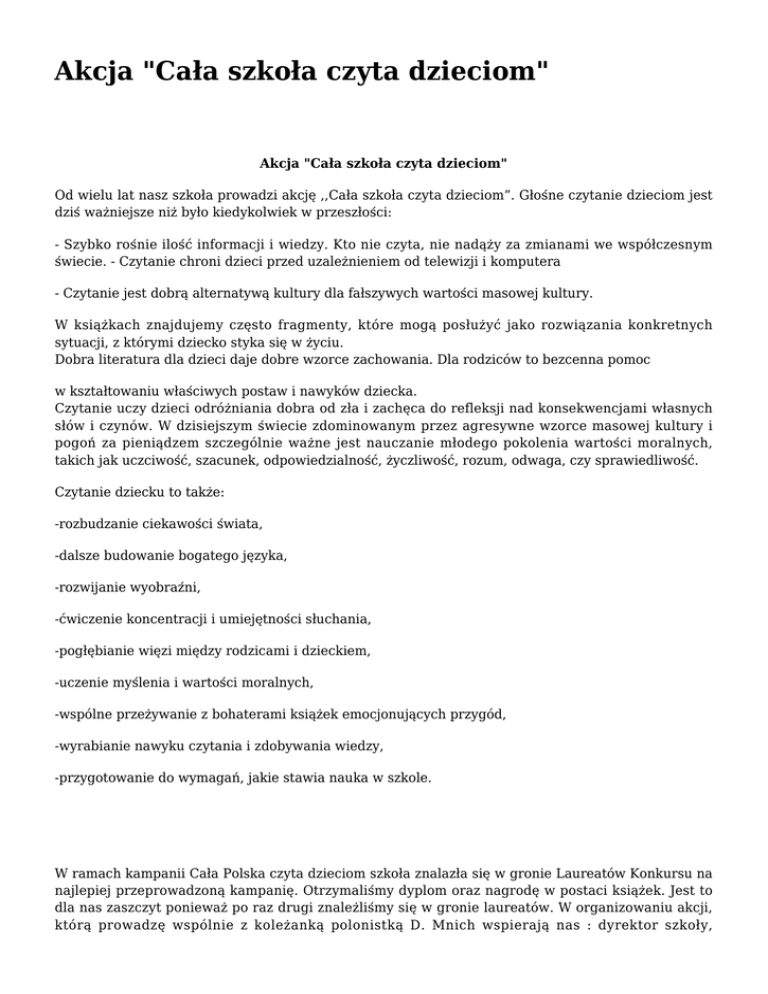 Akcja "Cała szkoła czyta dzieciom" Akcja "Cała szkoła czyta dzieciom" Od wielu lat nasz szkoła prowadzi akcję ,,Cała szkoła czyta dzieciom”. Głośne czytanie dzieciom jest dziś ważniejsze niż było kiedykolwiek w przeszłości: - Szybko rośnie ilość informacji i wiedzy. Kto nie czyta, nie nadąży za zmianami we współczesnym świecie. - Czytanie chroni dzieci przed uzależnieniem od telewizji i komputera - Czytanie jest dobrą alternatywą kultury dla fałszywych wartości masowej kultury. W książkach znajdujemy często fragmenty, które mogą posłużyć jako rozwiązania konkretnych sytuacji, z którymi dziecko styka się w życiu. Dobra literatura dla dzieci daje dobre wzorce zachowania. Dla rodziców to bezcenna pomoc w kształtowaniu właściwych postaw i nawyków dziecka. Czytanie uczy dzieci odróżniania dobra od zła i zachęca do refleksji nad konsekwencjami własnych słów i czynów. W dzisiejszym świecie zdominowanym przez agresywne wzorce masowej kultury i pogoń za pieniądzem szczególnie ważne jest nauczanie młodego pokolenia wartości moralnych, takich jak uczciwość, szacunek, odpowiedzialność, życzliwość, rozum, odwaga, czy sprawiedliwość. Czytanie dziecku to także: -rozbudzanie ciekawości świata, -dalsze budowanie bogatego języka, -rozwijanie wyobraźni, -ćwiczenie koncentracji i umiejętności słuchania, -pogłębianie więzi między rodzicami i dzieckiem, -uczenie myślenia i wartości moralnych, -wspólne przeżywanie z bohaterami książek emocjonujących przygód, -wyrabianie nawyku czytania i zdobywania wiedzy, -przygotowanie do wymagań, jakie stawia nauka w szkole. W ramach kampanii Cała Polska czyta dzieciom szkoła znalazła się w gronie Laureatów Konkursu na najlepiej przeprowadzoną kampanię. Otrzymaliśmy dyplom oraz nagrodę w postaci książek. Jest to dla nas zaszczyt ponieważ po raz drugi znależliśmy się w gronie laureatów. W organizowaniu akcji, którą prowadzę wspólnie z koleżanką polonistką D. Mnich wspierają nas : dyrektor szkoły, nauczyciele , proboszcz parafii , który przekazał na cele biblioteki kilka pozycji książkowych oraz świetnie przybliżył historię powstania kościoła podczas imprezy czytelniczej promującej regionalizm, rodzice , którzy chętnie czytają dzieciom w szkole oraz zaproszeni goście . W codziennym pośpiechu rodzice coraz mniej z dziećmi rozmawiają i mało im czytają - warto to zmienić! Kontakt z żywym słowem wyparła telewizja, której narzędziem nie jest język, lecz obraz. W efekcie dzieci coraz gorzej znają język, w szkole nie rozumieją prostych tekstów i poleceń. Coraz mniej także same czytają, ponieważ czytanie niezrozumiałych słów i zdań jest trudne i nudne, znacznie mniej atrakcyjne od telewizji. Wspólne czytanie może bardzo pomagać w wychowaniu dziecka. Warto czytać na głos dziecku ! Barbara Dynak – opiekun biblioteki Źródło: Publiczna Szkoła Podstawowa w Strzegomiu. Gmina Rytwiany - www.rytwiany.com.pl