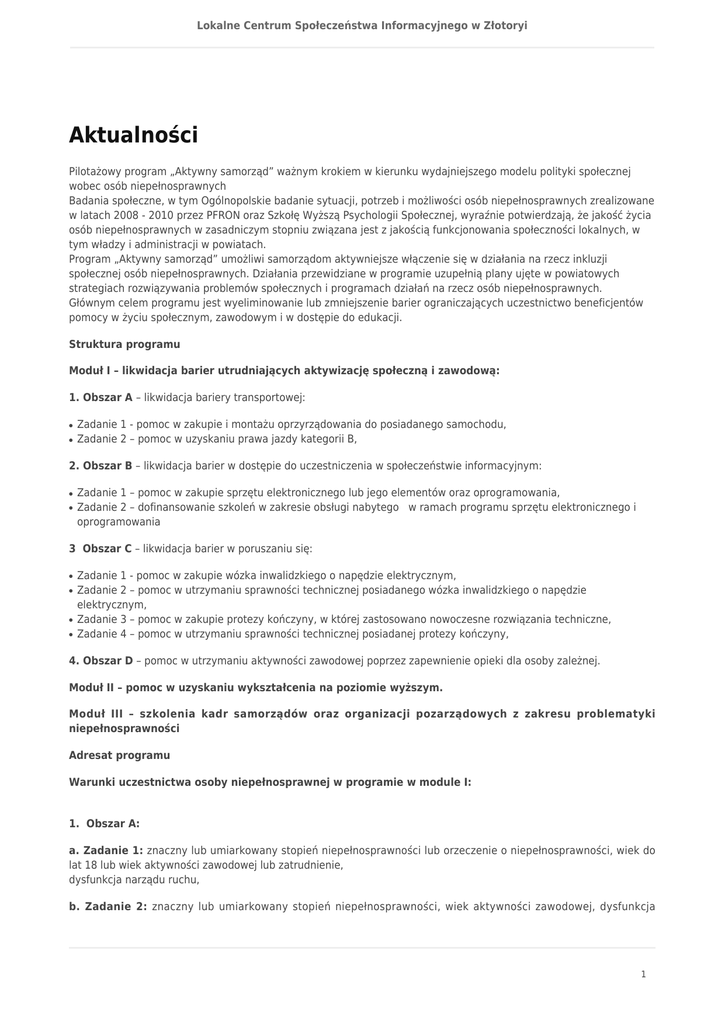 Lokalne Centrum Społeczeństwa Informacyjnego w Złotoryi Aktualności Pilotażowy program „Aktywny samorząd” ważnym krokiem w kierunku wydajniejszego modelu polityki społecznej wobec osób niepełnosprawnych Badania społeczne, w tym Ogólnopolskie badanie sytuacji, potrzeb i możliwości osób niepełnosprawnych zrealizowane w latach 2008 - 2010 przez PFRON oraz Szkołę Wyższą Psychologii Społecznej, wyraźnie potwierdzają, że jakość życia osób niepełnosprawnych w zasadniczym stopniu związana jest z jakością funkcjonowania społeczności lokalnych, w tym władzy i administracji w powiatach. Program „Aktywny samorząd” umożliwi samorządom aktywniejsze włączenie się w działania na rzecz inkluzji społecznej osób niepełnosprawnych. Działania przewidziane w programie uzupełnią plany ujęte w powiatowych strategiach rozwiązywania problemów społecznych i programach działań na rzecz osób niepełnosprawnych. Głównym celem programu jest wyeliminowanie lub zmniejszenie barier ograniczających uczestnictwo beneficjentów pomocy w życiu społecznym, zawodowym i w dostępie do edukacji. Struktura programu Moduł I – likwidacja barier utrudniających aktywizację społeczną i zawodową: 1. Obszar A – likwidacja bariery transportowej: ● ● Zadanie 1 - pomoc w zakupie i montażu oprzyrządowania do posiadanego samochodu, Zadanie 2 – pomoc w uzyskaniu prawa jazdy kategorii B, 2. Obszar B – likwidacja barier w dostępie do uczestniczenia w społeczeństwie informacyjnym: ● ● Zadanie 1 – pomoc w zakupie sprzętu elektronicznego lub jego elementów oraz oprogramowania, Zadanie 2 – dofinansowanie szkoleń w zakresie obsługi nabytego w ramach programu sprzętu elektronicznego i oprogramowania 3 Obszar C – likwidacja barier w poruszaniu się: ● ● ● ● Zadanie 1 - pomoc w zakupie wózka inwalidzkiego o napędzie elektrycznym, Zadanie 2 – pomoc w utrzymaniu sprawności technicznej posiadanego wózka inwalidzkiego o napędzie elektrycznym, Zadanie 3 – pomoc w zakupie protezy kończyny, w której zastosowano nowoczesne rozwiązania techniczne, Zadanie 4 – pomoc w utrzymaniu sprawności technicznej posiadanej protezy kończyny, 4. Obszar D – pomoc w utrzymaniu aktywności zawodowej poprzez zapewnienie opieki dla osoby zależnej. Moduł II – pomoc w uzyskaniu wykształcenia na poziomie wyższym. Moduł III – szkolenia kadr samorządów oraz organizacji pozarządowych z zakresu problematyki niepełnosprawności Adresat programu Warunki uczestnictwa osoby niepełnosprawnej w programie w module I: 1. Obszar A: a. Zadanie 1: znaczny lub umiarkowany stopień niepełnosprawności lub orzeczenie o niepełnosprawności, wiek do lat 18 lub wiek aktywności zawodowej lub zatrudnienie, dysfunkcja narządu ruchu, b. Zadanie 2: znaczny lub umiarkowany stopień niepełnosprawności, wiek aktywności zawodowej, dysfunkcja 1 Lokalne Centrum Społeczeństwa Informacyjnego w Złotoryi narządu ruchu, 2. Obszar B: znaczny stopień niepełnosprawności lub orzeczenie o niepełnosprawności, wiek do lat 18 lub wiek aktywności zawodowej lub zatrudnienie, dysfunkcja obu kończyn górnych lub narządu wzroku, 3. Obszar C: a. Zadanie 1: znaczny stopień niepełnosprawności lub orzeczenie o niepełnosprawności, wiek do lat 18 lub wiek aktywności zawodowej lub zatrudnienie, dysfunkcje uniemożliwiające samodzielne poruszanie się za pomocą wózka inwalidzkiego o napędzie ręcznym, b. Zadanie 2: znaczny stopień niepełnosprawności lub orzeczenie o niepełnosprawności, c. Zadanie 3 i 4: stopień niepełnosprawności, wiek aktywności zawodowej lub zatrudnienie, potwierdzona opinią eksperta PFRON stabilność procesu chorobowego, potwierdzone opinią eksperta PFRON rokowania uzyskania zdolności do pracy w wyniku wsparcia udzielonego w programie, 4. Obszar D: znaczny lub umiarkowany stopień niepełnosprawności, aktywność zawodowa, pełnienie roli opiekuna prawnego dziecka. Warunki uczestnictwa osoby niepełnosprawnej w programie w module II: znaczny lub umiarkowany stopień niepełnosprawności, nauka w szkole wyższej lub szkole policealnej lub kolegium lub przewód doktorski otwarty poza studiami doktoranckimi. 2 Lokalne Centrum Społeczeństwa Informacyjnego w Złotoryi 3 Lokalne Centrum Społeczeństwa Informacyjnego w Złotoryi 4