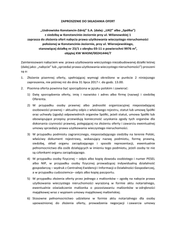 ZAPROSZENIE DO SKŁADANIA OFERT „Uzdrowisko Konstancin-Zdrój” S.A. (dalej: „UKZ” albo „Spółka”) z siedzibą w Konstancinie-Jeziornie przy ul. Wilanowskiej 1 zaprasza do złożenia ofert nabycia prawa użytkowania wieczystego nieruchomości położonej w Konstancinie-Jeziornie, przy ul. Wierzejewskiego, stanowiącej działkę nr 23/1 z obrębu 03-11 o powierzchni 9976 m2, objętej KW WA5M/00241444/7 Zainteresowani nabyciem ww. prawa użytkowania wieczystego niezabudowanej działki leśnej (dalej jako: „nabycie” lub „sprzedaż prawa użytkowania wieczystego nieruchomości”) proszeni są o: 1. Złożenie pisemnej oferty, spełniającej wymogi określone w punkcie 2 niniejszego zaproszenia, nie później niż do dnia 31 lipca 2017 r. do godz. 13.00. 2. Pisemna oferta powinna być sporządzona w języku polskim i zawierać: 1) Datę sporządzenia oferty, imię i nazwisko i adres albo firmę (nazwę) i siedzibę Oferenta. 2) W przypadku osoby prawnej albo jednostki organizacyjnej nieposiadającej osobowości prawnej – aktualny odpis z właściwego rejestru, statut lub umowę Spółki oraz uchwały (zgody) odpowiednich organów Spółki, jeżeli statut, umowa Spółki lub obowiązujące przepisy przewidują konieczność uzyskania zgody tych organów dla dokonania czynności prawnej, polegającej na złożeniu oferty i zawarciu ewentualnej umowy sprzedaży prawa użytkowania wieczystego nieruchomości. 3) W przypadku podmiotu zagranicznego, nieposiadającego siedziby na terenie Polski, właściwy dokument rejestrowy, wskazujący nazwę podmiotu, formę prawną, siedzibę, skład organu zarządzającego i sposób reprezentacji, ewentualnie pełnomocnictwo dla osób działających w imieniu tego podmiotu, jeżeli osoby te nie są członkami organu zarządzającego. 4) W przypadku osoby fizycznej – odpis albo kopię dowodu osobistego i numer PESEL albo NIP, w przypadku osoby fizycznej prowadzącej indywidualną działalność gospodarczą – wydruk z Centralnej Ewidencji i Informacji o Działalności Gospodarczej, a w przypadku cudzoziemca– odpis albo kopię paszportu. 5) W przypadku złożenia oferty przez jednego z małżonków – zgodę na nabycie prawa użytkowania wieczystego nieruchomości wyrażoną w formie aktu notarialnego, ewentualnie oświadczenie małżonka o pozostawaniu małżonków w odrębności majątkowej wraz z wypisem umowy majątkowej małżeńskiej. 6) Stosowne pełnomocnictwo udzielone w formie aktu notarialnego dla osoby upoważnionej do złożenia oferty, prowadzenia negocjacji i zawarcia umowy sprzedaży, jeżeli prawo do reprezentowania Oferenta nie wynika z dokumentów, o których mowa powyżej. 7) Oświadczenie Oferenta, iż zapoznał się z materiałem informacyjnym dotyczącym nieruchomości oraz stanem faktycznym i prawnym nieruchomości i nie wnosi do nich żadnych zastrzeżeń. 8) Oświadczenie Oferenta o gotowości do przystąpienia do zawarcia umowy przenoszącej prawo użytkowania wieczystego nieruchomości nie później niż w dniu 29 września 2017 r. 9) Zobowiązanie Oferenta do pokrycia wszystkich kosztów związanych z nabyciem prawa użytkowania wieczystego nieruchomości, w tym opłat notarialnych i sądowych oraz stosownych podatków, a w przypadku cudzoziemca również kosztów pracy tłumacza przysięgłego. 10) W przypadku osób fizycznych oświadczenie o następującej treści: „Wyrażam zgodę na przetwarzanie danych osobowych zawartych w mojej ofercie dla potrzeb niezbędnych do realizacji transakcji sprzedaży prawa użytkowania wieczystego nieruchomości stanowiącej działkę nr 23/1 z obrębu 03-11 o powierzchni 9976 m2, objętej KW WA5M/00241444/7 (zgodnie z ustawą z dnia 29 sierpnia 1997 r. o ochronie danych osobowych; t. jedn. Dz.U. z 2016 r. poz. 922)”. 11) Oferowaną cenę nabycia, ze wskazaniem, czy jest to cena netto, czy brutto. 12) Termin związania Oferenta złożoną ofertą nie krótszy niż do dnia 29 września 2017 r. 13) Dowód wniesienia wadium. 3. Treść oferty oraz załączone dokumenty powinny być sporządzone w języku polskim, dokumenty sporządzone w języku obcym powinny być przetłumaczone na język polski przez tłumacza przysięgłego, wszystkie dokumenty powinny być aktualne, złożone w oryginałach lub poświadczonych za zgodność kopiach oraz powinny mieć stosowne podpisy osób upoważnionych. Składane dokumenty i oświadczenia powinny być właściwe dla formy prawnej podmiotu i prowadzonej przez niego działalności. 4. UKZ ustala cenę minimalną sprzedaży prawa użytkowania wieczystego nieruchomości na kwotę 3.840.000 zł netto/brutto. 5. Warunkiem uczestnictwa w przetargu jest wniesienie wadium w wysokości 100 000 zł na rachunek Spółki nr 06 9291 0001 0200 1764 2000 0010, przy czym: a) wniesienie wadium powinno nastąpić najpóźniej wraz ze złożeniem oferty, b) wadium wniesione przez Oferenta, którego oferta została przyjęta zaliczone zostanie na poczet ceny nabycia nieruchomości, c) wadium wniesione przez pozostałych Oferentów zostanie zwrócone niezwłocznie w sytuacji: - przyjęcia przez Spółkę oferty złożonej przez innego Oferenta, - unieważnienia postępowania przetargowego, - zakończenia postępowania przetargowego bez wyboru jakiejkolwiek oferty, - wycofania przez Uczestnika przetargu oferty przed upływem terminu do składania ofert. d) jeżeli Oferent, pomimo wyboru jego oferty, uchyla się od zawarcia umowy przedwstępnej lub definitywnej w terminie wskazanym przez Spółkę, wadium przepada na rzecz UKZ. 6. UKZ zastrzega sobie prawo przeprowadzenia rozmów z Oferentami, którzy złożyli oferty spełniające wymogi formalne wskazane w niniejszym zaproszeniu przed wyborem najkorzystniejszej oferty w celu doprecyzowania warunków przedmiotowej transakcji. 7. Oferent może złożyć ofertę w więcej niż jednym postępowaniu prowadzonym przez UKZ zmierzającym do zawarcia umowy sprzedaży wieczystego użytkowania lub własności nier