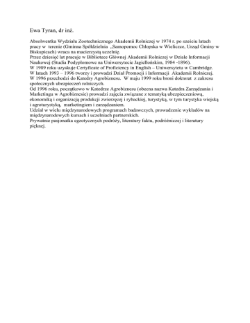 Ewa Tyran, dr inż. Absolwentka Wydziału Zootechnicznego Akademii Rolniczej w 1974 r. po sześciu latach pracy w terenie (Gminna Spółdzielnia „Samopomoc Chłopska w Wieliczce, Urząd Gminy w Biskupicach) wraca na macierzystą uczelnię. Przez dziesięć lat pracuje w Bibliotece Głównej Akademii Rolniczej w Dziale Informacji Naukowej (Studia Podyplomowe na Uniwersytecie Jagiellońskim, 1984 -1896). W 1989 roku uzyskuje Certyficate of Proficiency in English – Uniwersytetu w Cambridge. W latach 1993 – 1996 tworzy i prowadzi Dział Promocji i Informacji Akademii Rolniczej. W 1996 przechodzi do Katedry Agrobiznesu. W maju 1999 roku broni doktorat z zakresu społecznych ubezpieczeń rolniczych. Od 1996 roku, początkowo w Katedrze Agrobiznesu (obecna nazwa Katedra Zarządzania i Marketingu w Agrobiznesie) prowadzi zajęcia związane z tematyką ubezpieczeniową, ekonomiką i organizacją produkcji zwierzęcej i rybackiej, turystyką, w tym turystyka wiejską i agroturystyką, marketingiem i zarządzaniem. Udział w wielu międzynarodowych programach badawczych, prowadzenie wykładów na międzynarodowych kursach i uczelniach partnerskich. Prywatnie pasjonatka egzotycznych podróży, literatury faktu, podróżniczej i literatury pięknej.