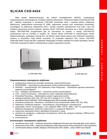 SLICAN CXS-0424 Mały serwer telekomunikacyjny, dla małych przedsiębiorstw (SOHO), oczekujących zaawansowanych technologicznie rozwiązań telekomunikacyjnych. Połączenie telefonii internetowej VoIP jak i telefonii tradycyjnej w serwerach CXS-0424 gwarantuje tanie i wysokiej jakości połączenia telefoniczne. Zastosowanie technologii IP, GSM, nagrywanie rozmów oraz uniwersalna konstrukcja, pozwalająca na elastyczne zwiększenie ilości i rodzaju numerów wewnętrznych oraz ilości i typu linii miejskich gwarantują komfort połączeń. Serwery Slican CXS-0424 oferowane są w dwóch obudowach, wersja CXS-0424.WM przygotowana jest do mocowania na ścianie, a wersja CXS-0424.2U przeznaczona jest do montażu w szafach 19’’. Serwer Slican CXS-0424 to wielofunkcyjny serwer telekomunikacyjny, spełniający wymogi firm, dla których niskie koszty zakupu oraz możliwość rozbudowy systemu w przyszłości mają istotne znaczenie. W przypadku większych firm, serwer CXS-0424 doskonale spełni swoją rolę jako urządzenie obsługujące mniejsze oddziały lub punkty sprzedaży. Serwer CXS-0424 wyposażono także w wielokanałowy system nagrywania rozmów. S E R W E R Y I ■ CXS-0424.WM C E N T R A L E ■ CXS-0424.2U Zaawansowane rozwiązania użytkowe: ■ profesjonalne konferencje (manager konferencji, pokój konferencyjny) ■ PATHFINDER – automatyczne wyszukiwanie ścieżki zrealizowanego połączenia ■ INVENIO – funkcjonalność IVR (Interactive Voice Response) – interaktywne głosowe kierowanie połączeń przychodzących ■ ICD – Intelligent Call Distribution – kierowanie ruchem przychodzącym ■ LCR – Least Cost Routing – automatyczny wybór najtańszej drogi połączenia ■ Embedded Recording – wielokanałowy system nagrywania rozmów ■ obsługa protokołów VoIP: SSL, SIP oraz IAX 2 (kodeki G.711, G.729) ■ wewnętrzna brama GSM 900 / 1800 obsługująca karty SIM dowolnego operatora GSM ■ linkowanie systemowe / linkowanie z centralami innych producentów (QSIG, SIP, IAX, SSL) ■ rejestracja i taryfikacja połączeń – wychodzących, przychodzących i wewnętrznych ■ prezentacja numeru dzwoniącego z linii miejskich ISDN, POTS, GSM i VoIP na wyświetlaczach telefonów analogowych, telefonów systemowych i w programie TelefonCTI ■ systemowe zapowiedzi słowne ułatwiające korzystanie z usług ■ protokoły do współpracy z aplikacjami zewnętrznymi, takimi jak: programy hotelowe, CRM lub firm taksówkarskich, TAPI ■ poczta głosowa Innowacyjne rozwiązania użytkowe: ■ wbudowane bramy VoIP – możliwość stworzenia rozległej sieci firmowej oraz transmisja głosu przez Internet ■ wbudowane bramy GSM – elastyczna konfiguracja drogi połączeniowej, tańsze połączenia w sieci operatorów ■ monitorowanie statusu centralki, dostępne z firmowej sieci LAN i zdalnie – przez modem oraz Internet 1 Typ centrali Wyposażenie fabryczne – porty analogowe (AB) Maksymalna pojemność CXS-0424.WM CXS-0424.2U 4 4 Translacje miejskie POTS (ASS) 12 12 Porty analogowe (AB) 24 24 ISDN BRA (wew. lub zewn.) 8 8 Kanały VoIP 8 8 Abonenci VoIP 118 118 Translacje GSM (karty SIM) 4 4 Porty systemowe CTS Up0 i IP 8/18 8/18 Kanały nagrywania rozmów 8 8 cyfrowe telefony systemowe Slican serii CTS-102 i CTS-202 telefon analogowy Slican XL-2023ID Dostępne urządzenia współpracujące Slican S E R W E R Y telefon beztarczowy Slican HLP-22 konsola Slican CTS-232 bramofony Slican typ BRV i SKD Multi Audio Box (MAB-1101) Slican TelefonCTI.plus / TelefonCTI Slican BillingMAN.plus / BillingMAN Aplikacje wspomagające pracę CXS-0424 Slican PayMAN Slican RecordMAN2.server / RecordMAN2.client I Slican ConfigMAN.admin / ConfigMAN.user stan na 11.2009 Parametry VoIP Obsługiwane protokoły SSL, SIP oraz IAX2 (kodeki G.711, G.729) Współpraca z innymi aplikacjami / urządzeniami aplikacje komputerowe typu „softphone” lub sprzętowy telefon IP, bramy VoIP (SIP 2.0 lub IAX2) Obsługiwani klienci VoIP do 18 telefonów Slican CTS-202.IP oraz do 100 dowolnego producenta (SIP 2.0/IAX2) Tryb pracy klient lub / i serwer VoIP Zasilanie ~110-230 V; 50-60 Hz; < 50 VA ~110-230 V; 50-60 Hz; < 50 VA Wymiary (mm) szerokość x wysokość x głębokość 250 x 272 x 120 483 (19”) x 89-(2U) x 240 ■ PRZYKŁADOWA SIEĆ OPARTA O SERWERY SLICAN CXS-0424 2 C E N T R A L E
