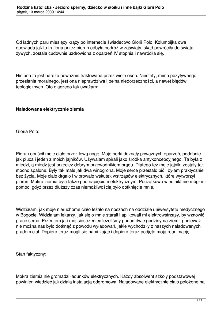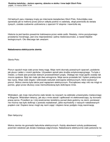 Rodzina katolicka - Jezioro spermy, dziecko w słoiku i inne bajki Glorii Polo piątek, 13 marca 2009 14:44 Od ładnych paru miesięcy krąży po internecie świadectwo Glorii Polo. Kolumbijka owa opowiada jak to trafiona przez piorun odbyła podróż w zaświaty, skąd powróciła do świata żywych, została cudownie uzdrowiona z oparzeń IV stopnia i nawróciła się. Historia ta jest bardzo poważnie traktowana przez wiele osób. Niestety, mimo pozytywnego przesłania moralnego, jest ona nieprawdziwa i pełna niedorzeczności, a nawet błędów teologicznych. Oto dlaczego tak uważam: Naładowana elektrycznie ziemia Gloria Polo: Piorun opuścił moje ciało przez lewą nogę. Moje nerki doznały poważnych oparzeń, podobnie jak płuca i jeden z moich jajników. Używałam spirali jako środka antykoncepcyjnego. Ta była z miedzi, a miedź jest przecież dobrym przewodnikiem prądu. Dlatego też moje jajniki zostały tak mocno spalone. Były tak małe jak dwa winogrona. Moje serce przestało bić i byłam praktycznie bez życia. Moje ciało drgało i wibrowało wskutek wstrząsów elektrycznych, które wytworzył piorun. Mokra ziemia była także pod napięciem elektrycznym. Początkowo więc nikt nie mógł mi pomóc, gdyż przez dłuższy czas niemożliwością było dotknięcie mnie. Widziałam, jak moje nieruchome ciało leżało na noszach na oddziale uniwersytetu medycznego w Bogocie. Widziałam lekarzy, jak się o mnie starali i aplikowali mi elektrowstrząsy, by wznowić pracę serca. Przedtem ja i mój siostrzeniec leżeliśmy ponad dwie godziny na ziemi, ponieważ nie można nas było dotknąć z powodu wyładowań, jakie wychodziły z naszych naładowanych prądem ciał. Dopiero teraz mogli się nami zająć i dopiero teraz podjęto moją reanimację. Stan faktyczny: Mokra ziemia nie gromadzi ładunków elektrycznych. Każdy absolwent szkoły podstawowej powinien wiedzieć jak działa instalacja odgromowa. Naładowane elektrycznie ciało położone na 1/7 Rodzina katolicka - Jezioro spermy, dziecko w słoiku i inne bajki Glorii Polo piątek, 13 marca 2009 14:44 mokrej ziemi błyskawicznie by się rozładowało. Iskry strzelające przez dwie godziny z naładowanych prądem ciał to czysty absurd. Kolejny absurd: po 2 godzinach od ustania pracy serca nikt by nie podejmował prób reanimacji. Już po kilku minutach od zatrzymania krążenia następują nieodwracalne zmiany w mózgu spowodowane niedotlenieniem. Kwarc ściągający pioruny Gloria Polo: Piorun trafił go od tyłu i spalił jego całe wnętrzności. Na zewnątrz pozostał nienaruszony. Mimo swego tak młodego wieku był całkowicie oddany Bogu. Czcił w sposób szczególny Dzieciątko Jezus. Nosił na szyi kwarcowy medalik z Jego wizerunkiem. Biegli medycyny sądowej powiedzieli, że to kwarc przyciągnął piorun. Piorun wniknął bezpośrednio w jego serce. Natychmiast ustała jego praca. Spaliły się wszystkie organy, po czym prąd pioruna opuścił ciało przez nogi. Próby reanimacji były daremne. Na zewnątrz jednakże nie miał żadnych oparzeń. Stan faktyczny: Kwarc (krystał górski) nie jest przewodnikiem prądu elektrycznego, więc nie ma żadnego wpływu na pioruny. Podpieranie się rzekomą opinią biegłych sądowych to zwykłe wciskanie kitu. Jajniki spalone dzięki spirali Gloria Polo: 2/7 Rodzina katolicka - Jezioro spermy, dziecko w słoiku i inne bajki Glorii Polo piątek, 13 marca 2009 14:44 Piorun opuścił moje ciało przez lewą nogę. Moje nerki doznały poważnych oparzeń, podobnie jak płuca i jeden z moich jajników. Używałam spirali jako środka antykoncepcyjnego. Ta była z miedzi, a miedź jest przecież dobrym przewodnikiem prądu. Dlatego też moje jajniki zostały tak mocno spalone. Były tak małe jak dwa winogrona. Moje serce przestało bić i byłam praktycznie bez życia. Moje ciało drgało i wibrowało wskutek wstrząsów elektrycznych, które wytworzył piorun. Mokra ziemia była także pod napięciem elektrycznym. Początkowo więc nikt nie mógł mi pomóc, gdyż przez dłuższy czas niemożliwością było dotknięcie mnie. Stan faktyczny: Przy napięciach i natężeniach prądu z wyładowania atmosferycznego, ludzkie ciało działa jak całkiem niezły przewodnik. Piorun nie musiałby sobie szukać małego drucika we wnętrzu ciała, mogąc spływać do ziemi całą jego objętością. To po pierwsze. A po drugie, nawet założywszy, że spirala była z czystej miedzi, i przepłynęło przez nią znacząco więcej prądu niż przez resztę ciała - nie mogłoby to mieć wpływu na jajniki, gdyż spirala ich nie dotyka. Ma ona bowiem kształt litery T, jeden jej koniec jest ulokowany w pobliżu szyjki macicy, a dwa pozostałe bliżej ujść jajowodów. Po szczegóły dotyczące budowy kobiecych narządów rozrodczych odsyłam do atlasu anatomicznego. Dziecko w słoiku i blizna po aborcji Gloria Polo: Gdy miałam 13 lat, moja przyjaciółka Estela zaszła w ciążę. Gdy mi opowiedziała o swojej ciąży, zapytałam się jej: ?Ale chyba wzięłaś pigułki? Odparła: ?Tak, ale na nic się to zdało.? Powiedziałam: ?I co teraz? Co zrobisz? Kto jest ojcem? Odpowiedziała: ?Nie wiem.? Nie wiedziała, czy było to podczas tego spaceru, czy tamtego, lub na tym festynie, czy też czy ojcem dziecka jest jej narzeczony. Powiedziała mi: ?Powiem po prostu, że to jego (jej narzeczonego).? W czerwcu ona i jej rodzina pojechali na wakacje. Była już w piątym miesiącu ciąży. Kiedy 3/7 Rodzina katolicka - Jezioro spermy, dziecko w słoiku i inne bajki Glorii Polo piątek, 13 marca 2009 14:44 powróciła, byłam zaskoczona. Nie było już oznak ciąży. Nie było widać dużego brzucha, ale wyglądała jak trup. Była tak blada i nic nie pozostało z tej ekstrawertycznej, żywej dziewczyny, która tak chętnie się bawiła. Mówiąc w skrócie: Nie była tą samą dziewczyną. (...) Gdy Estela powróciła z wakacji, nie była już tym radosnym podlotkiem co niegdyś, skłon