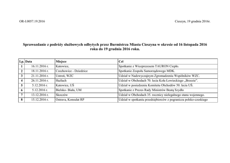 OR-I.0057.19.2016 Cieszyn, 19 grudnia 2016r. Sprawozdanie z podróży służbowych odbytych przez Burmistrza Miasta Cieszyna w okresie od 16 listopada 2016 roku do 19 grudnia 2016 roku. Lp. Data 16.11.2016 r. 1 18.11.2016 r. 2 21.11.2016 r. 3 26.11.2016 r. 4 5.12.2016 r. 5 5.12.2016 r. 6 13.12.2016 r. 7 15.12.2016 r. 8 Miejsce Katowice, Czechowice - Dziedzice Ustroń, WZC Hażlach Katowice, UŚ Bielsko- Biała, UM Skoczów Ostrava, Konsulat RP Cel Spotkanie z Wiceprezesem TAURON Ciepło. Spotkanie Zespołu Samorządowego MDK. Udział w Nadzwyczajnym Zgromadzeniu Wspólników WZC. Udział w Obchodach 70. lecia Koła Łowieckiego „Brzezie”. Udział w posiedzeniu Komitetu Obchodów 50. lecia UŚ. Spotkanie z Prezes Rady Ministrów Beatą Szydło Udział w Obchodach 35. rocznicy nielegalnego stanu wojennego. Udział w spotkaniu przedsiębiorców z pogranicza polsko-czeskiego