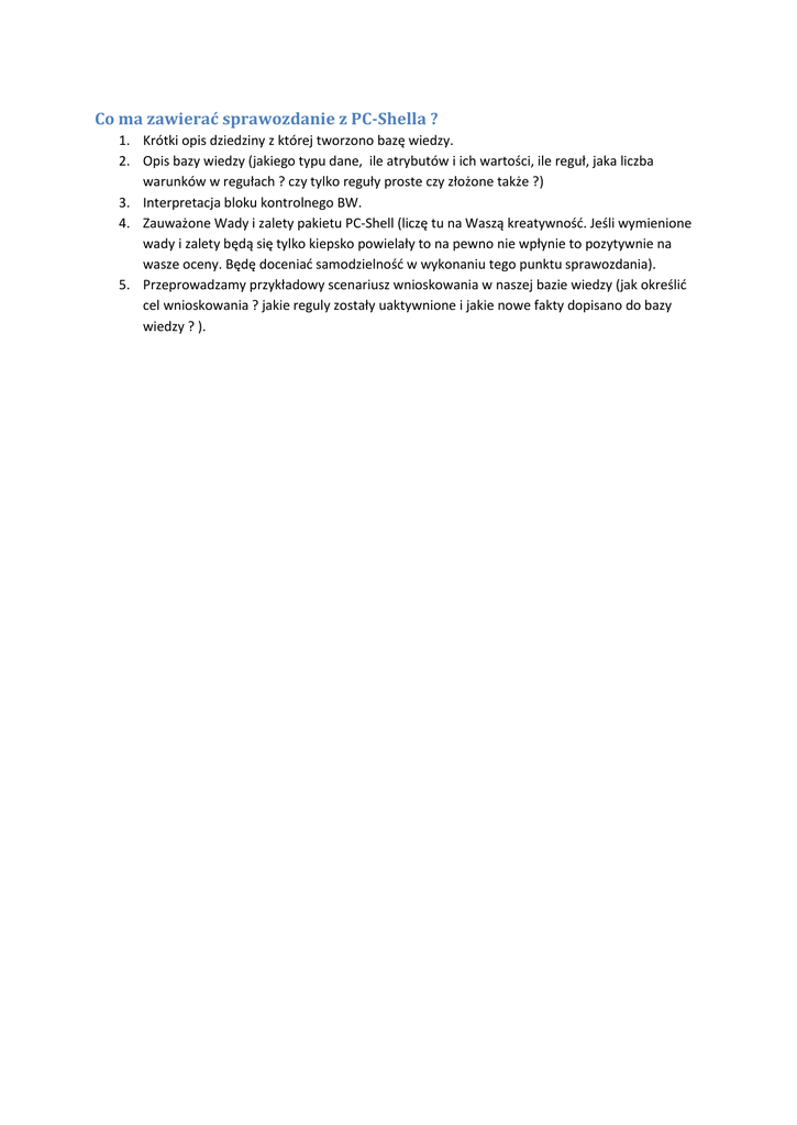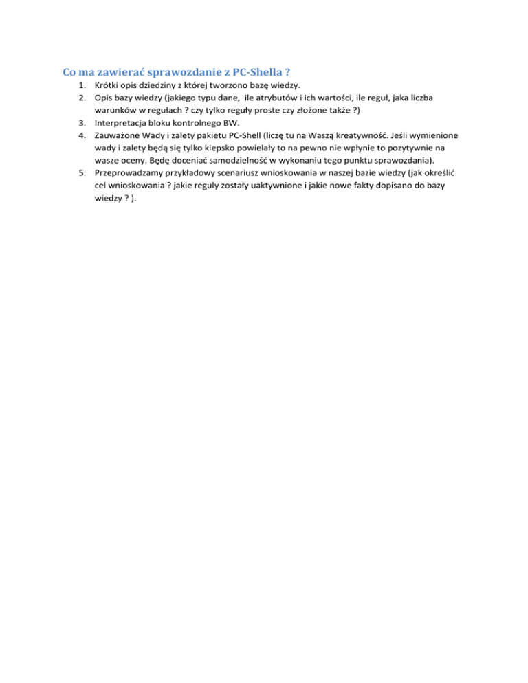 Co ma zawierać sprawozdanie z PC-Shella ? 1. Krótki opis dziedziny z której tworzono bazę wiedzy. 2. Opis bazy wiedzy (jakiego typu dane, ile atrybutów i ich wartości, ile reguł, jaka liczba warunków w regułach ? czy tylko reguły proste czy złożone także ?) 3. Interpretacja bloku kontrolnego BW. 4. Zauważone Wady i zalety pakietu PC-Shell (liczę tu na Waszą kreatywnośd. Jeśli wymienione wady i zalety będą się tylko kiepsko powielały to na pewno nie wpłynie to pozytywnie na wasze oceny. Będę doceniad samodzielnośd w wykonaniu tego punktu sprawozdania). 5. Przeprowadzamy przykładowy scenariusz wnioskowania w naszej bazie wiedzy (jak określid cel wnioskowania ? jakie reguly zostały uaktywnione i jakie nowe fakty dopisano do bazy wiedzy ? ).